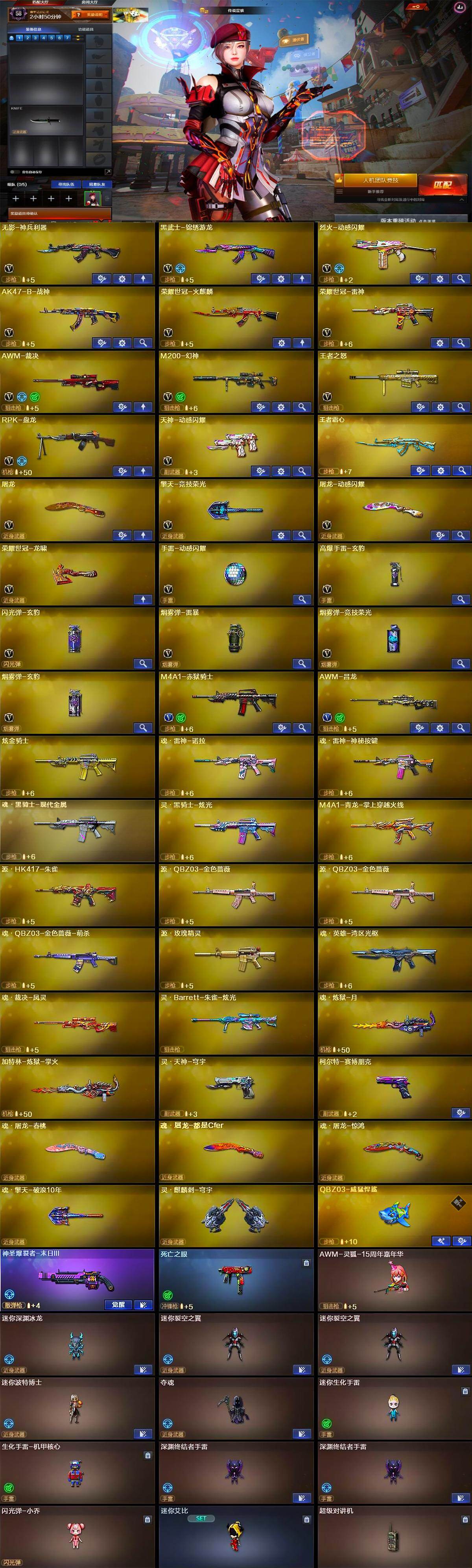 - [15842729]广东二区-57V-5王者-1炫金 【传说武器】:传说幽冥 【热门武器】:传说幽冥,QBZ03-金色蔷薇,金色蔷薇-古蛇迷踪,修罗-古蛇迷踪,M200-竞技荣光,荣耀世冠-雷神,荣耀世冠-柯尔特,M4A1-黑骑士,斯泰尔-蝴蝶,裁决-雪莉杨,USP-雷暴,炽芒蝶刃*2 【王者炫金武器】:王者之势,王者风势,王者雷影,王者星霆,炫金毁灭 【音效卡】:AN94-超新星-热带奇洋音效卡,死神-雪域霜狐-怀旧音效卡 【皮肤】:金色蔷薇-破浪逐光 皮肤,QBZ03-荣耀世冠EP 皮肤,雷神-脉冲核心,雷神-宇航兔皮肤,雷神-CFS十周年纪念版 皮肤,雷神-源计划2.0专属 皮肤,雷神-化蛇 皮肤,传奇石头-横秒之巅,火麒麟-心动糖果,毁灭-百城浙江 皮肤,毁灭-英雄计划 皮肤,黑骑士-破界 皮肤,AWM-再燃火线,修罗-冠军之魂,屠龙-星火燎原 【角色】:电竞教官-云悠悠,妮妮,雪域霜狐,蛇隐宗,奇洋探员,云海玲珑,暗夜-X,电竞少女,芳心审判者,飞虎队-X,虎妞,嘉年华灵狐,疾风,荆棘玫瑰,兰-海滩派对,0号玩家,灵狐-花神,灵狐者-X,麻雀,曼陀罗-X,玫瑰花神,潘多拉-X,潘多拉-甜心教官,青霞仙子,蛇姬,斯沃特-X,夜玫瑰-宠粉,游珑儿,智影 【人偶武器】:裁决-雪莉杨,王者沙鹰-神勇金戈,斯泰尔-蝴蝶,Scar Light-马枪,AWM-灵狐-15周年嘉年华,迷你牛牛,生化手雷-机甲核心 【暴走生化】:超级对讲机 【挑战大师】:神圣爆裂者III*2 【英雄级武器】:AK47-火麒麟,M4A1-黑龙,M4A1-雷神*2,M4A1-黑骑士,无影-神兵利器,QBZ03-云龙,黑武士-锦绣游龙,超新星-热带奇洋,金色蔷薇-古蛇迷踪,死神-雪域霜狐,QBZ03-金色蔷薇,黑骑士-海王,荣耀世冠-雷神,Barrett-毁灭,M200-竞技荣光,烈龙-云海游龙,USP-雷暴,荣耀世冠-柯尔特,柯尔特-竞技荣光,柯尔特-荣耀世冠EP,修罗-古蛇迷踪,屠龙,擎天,擎天-竞技荣光*2,炽芒蝶刃*2,擎天-云海游龙,龙啸-热带奇洋,斩神刀-雷暴,高爆手雷-雷暴*4,高爆手雷-竞技荣光*2,高爆手雷-云龙,手雷-云海游龙,手雷-热带奇洋,高爆手雷-古蛇迷踪,闪光弹-雷暴*4,闪光弹-竞技荣光*2,闪光弹-云龙,烟雾弹-雷暴*5,烟雾弹-竞技荣光*3,烟雾弹-云龙,烟雾弹-古蛇迷踪,M4A1