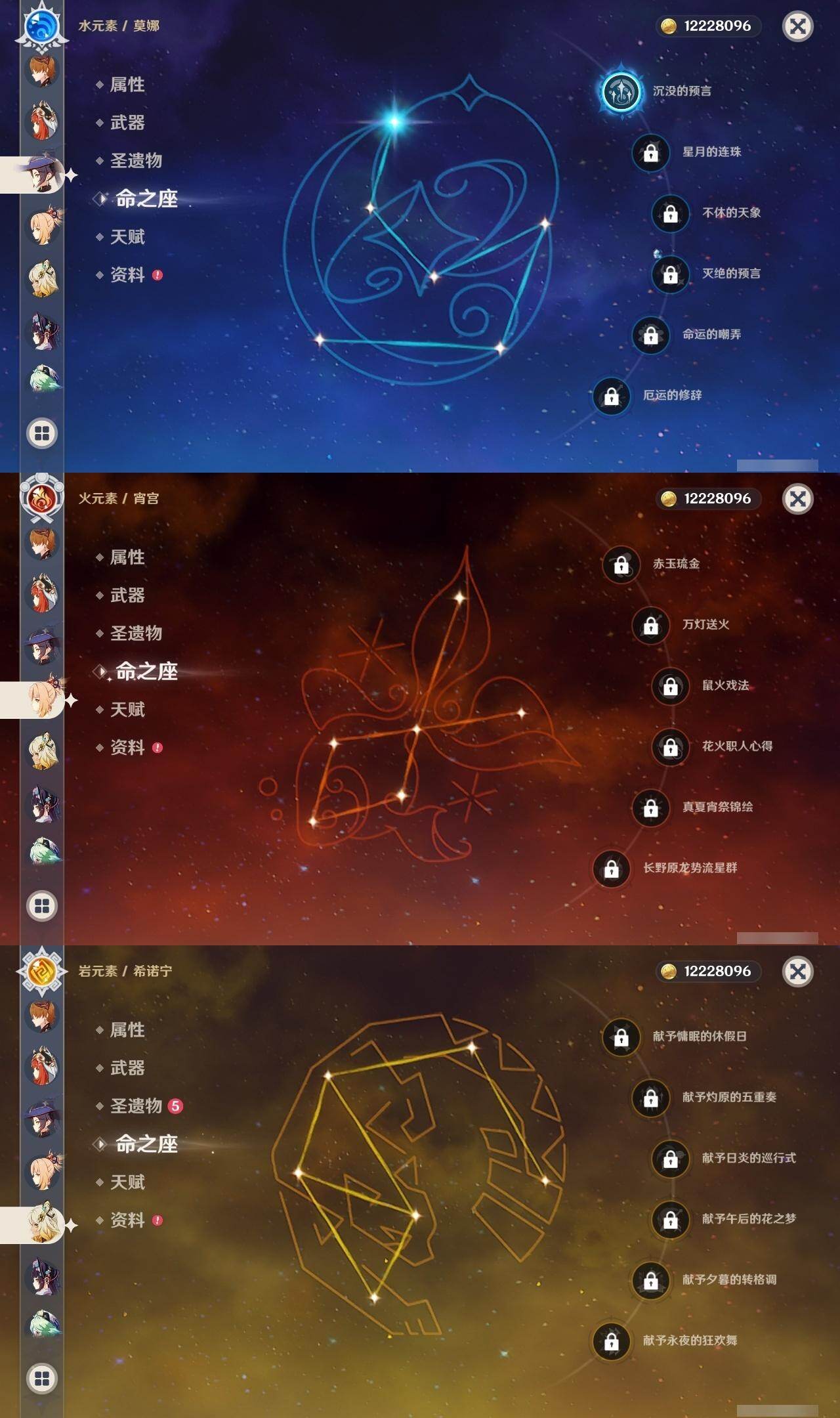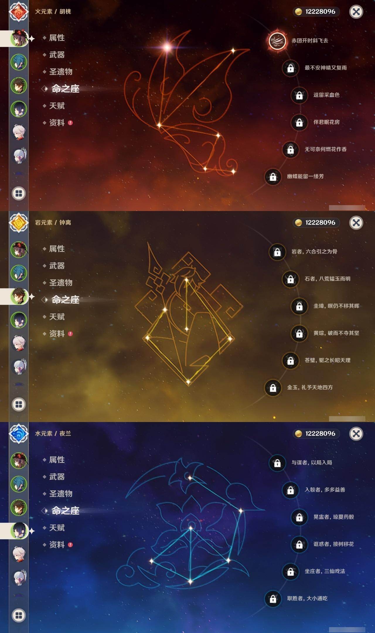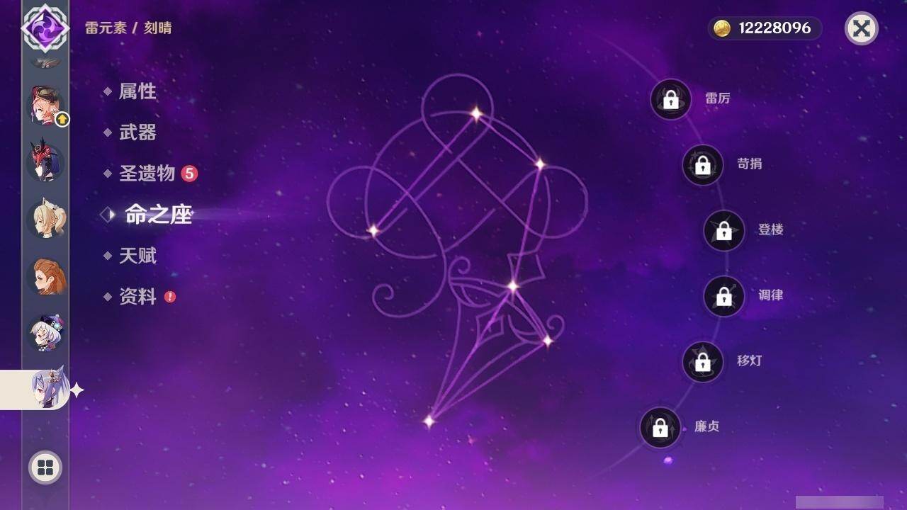 0命妮露,0命夜兰,0命雷电将军,0命枫原万叶,0命神里绫华,0命钟离,1命胡桃,0命宵宫,0命达达利亚,0命珊瑚宫心海,0命刻晴,0命七七,0命琴,1命莫娜,1命迪卢克,0命希诺宁,精1雾切之回光,精1天空之刃,精1狼的末路,精1天空之傲