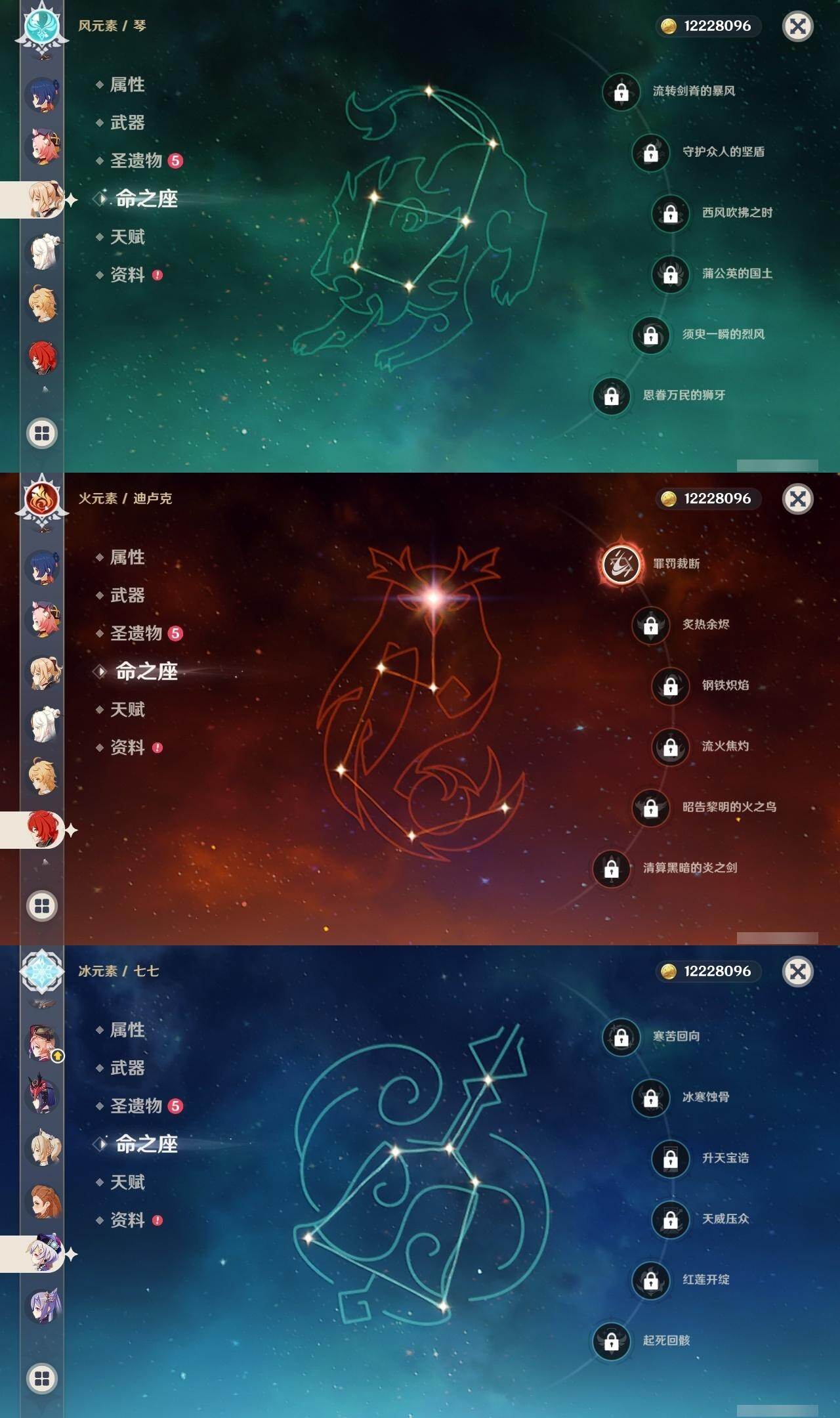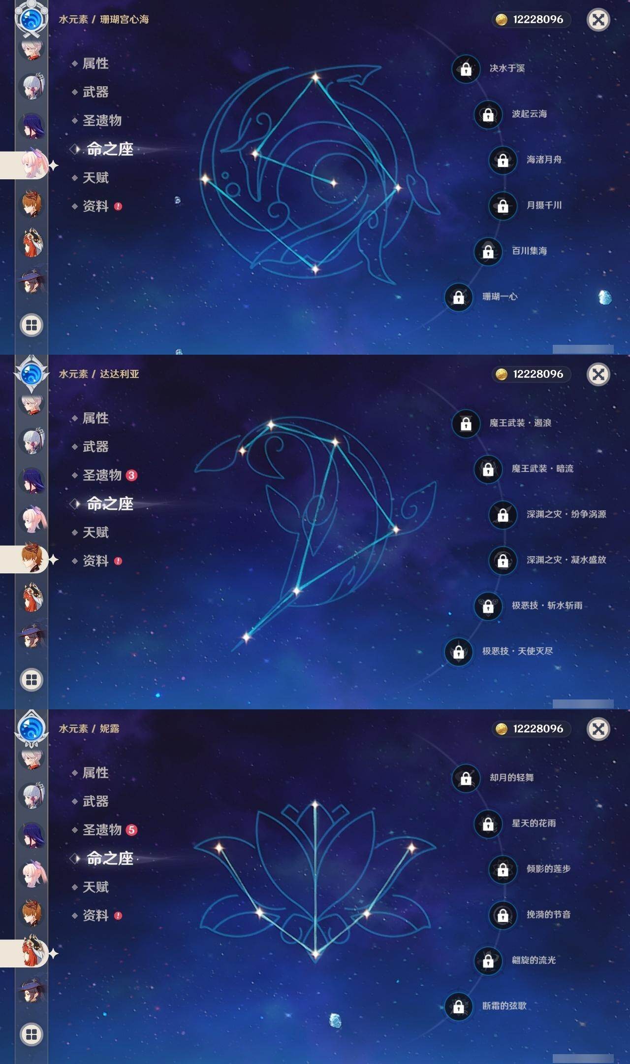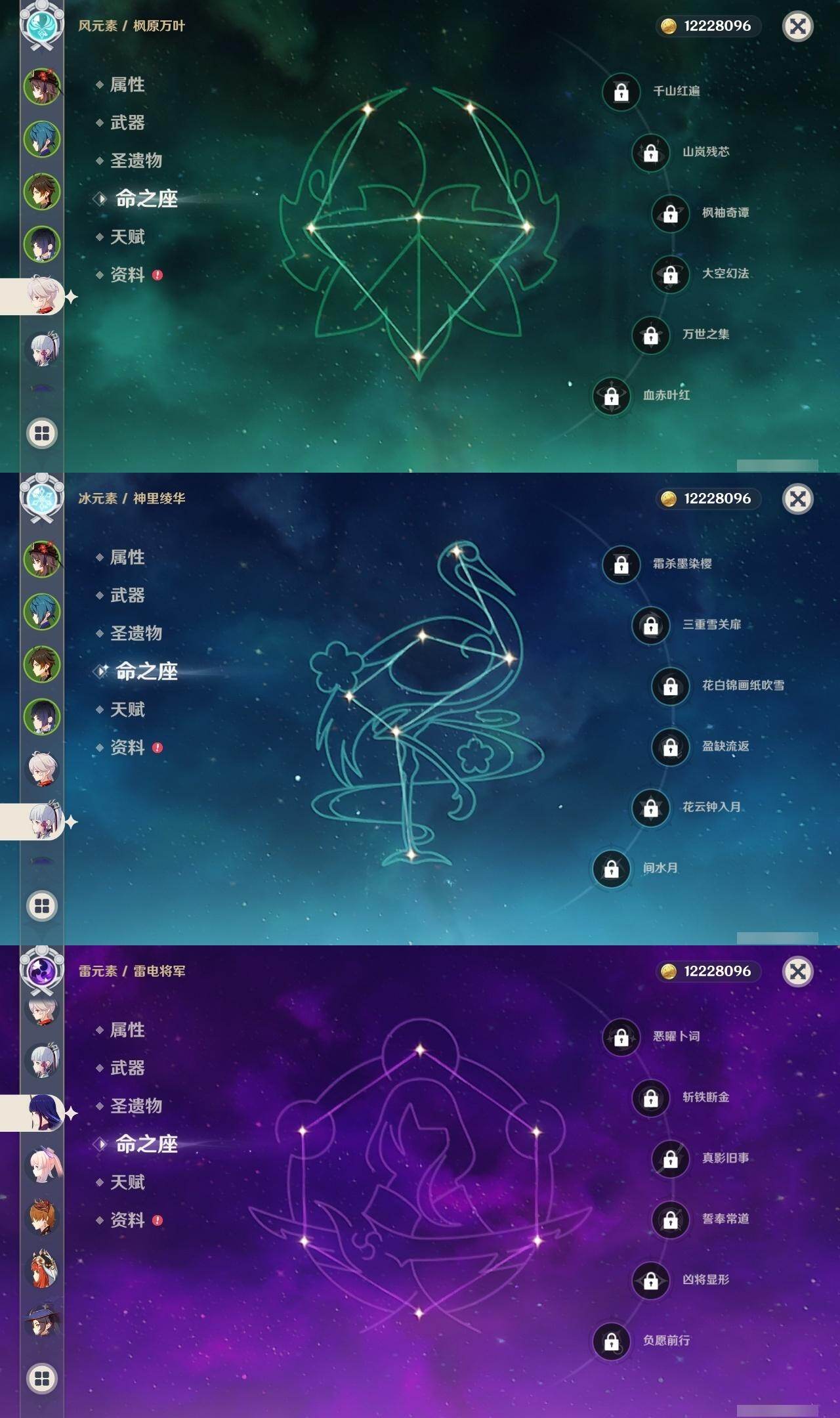 0命妮露,0命夜兰,0命雷电将军,0命枫原万叶,0命神里绫华,0命钟离,1命胡桃,0命宵宫,0命达达利亚,0命珊瑚宫心海,0命刻晴,0命七七,0命琴,1命莫娜,1命迪卢克,0命希诺宁,精1雾切之回光,精1天空之刃,精1狼的末路,精1天空之傲