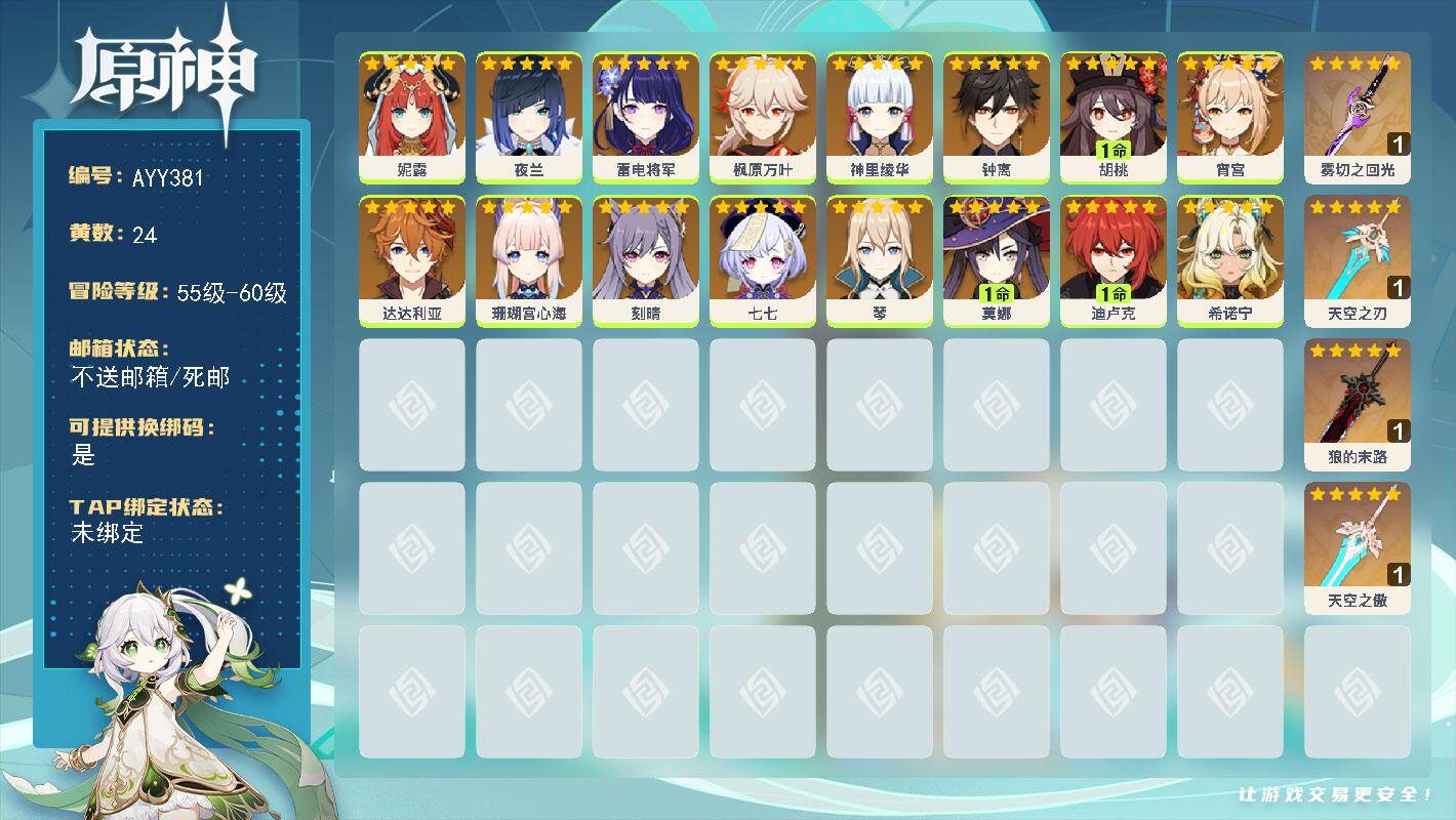[16265484]56级/24黄/男主/16个五星角色/5个五星武器 0命妮露,0命夜兰,0命雷电将军,0命枫原万叶,0命神里绫华,0命钟离,1命胡桃,0命宵宫,0命达达利亚,0命珊瑚宫心海,0命刻晴,0命七七,0命琴,1命莫娜,1命迪卢克,0命希诺宁,精1雾切之回光,精1天空之刃,精1狼的末路,精1天空之傲