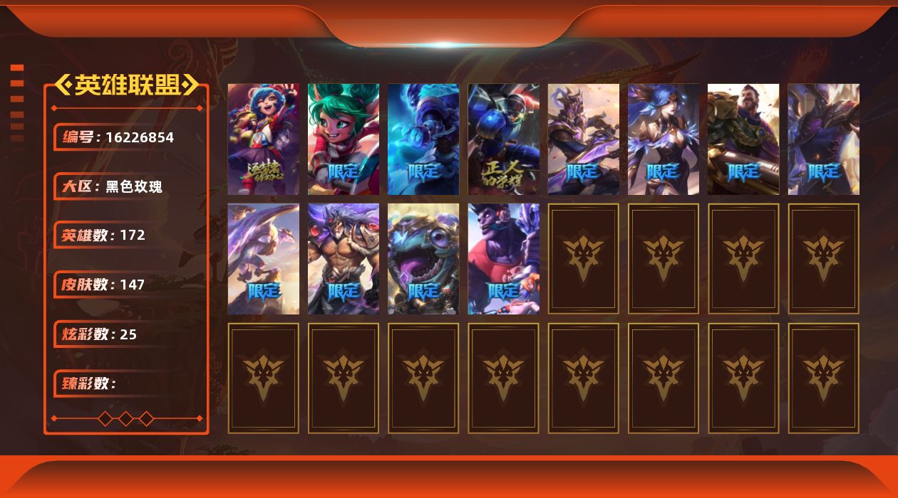 白银段位-172英雄-147皮肤-25炫彩-0终极-2神话-13限定-10传说-43史诗
