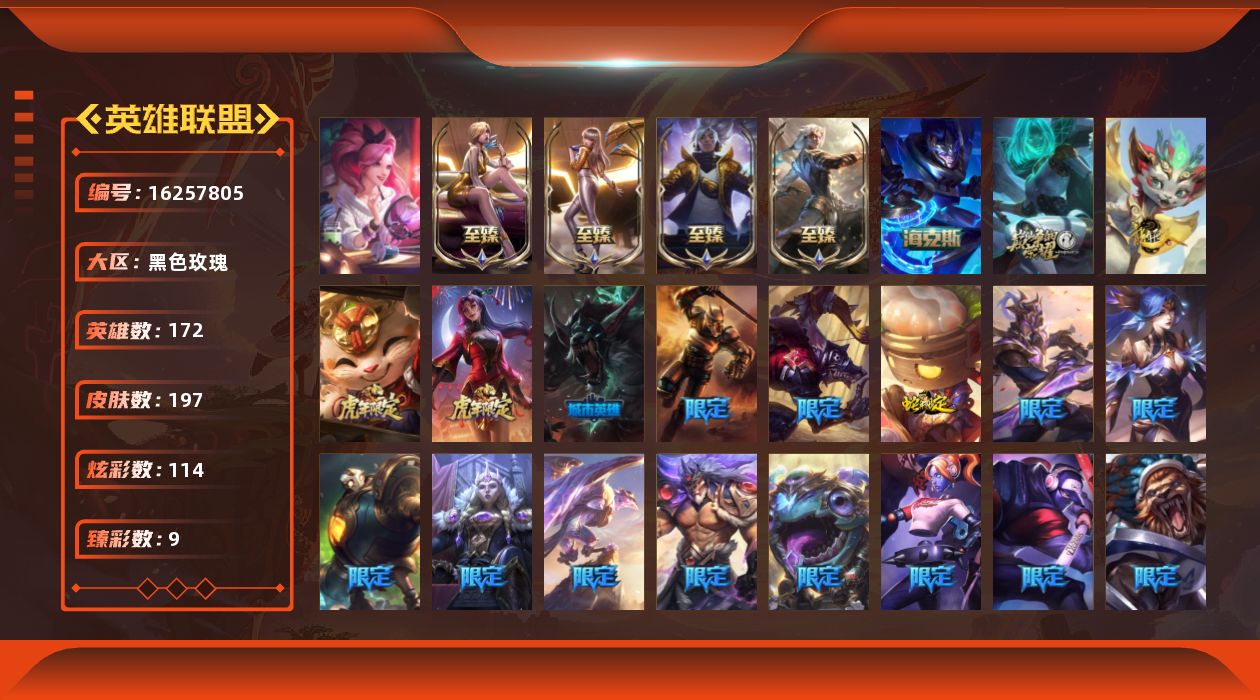 [16257805]【店主推荐捡漏号】未定级段位-172英雄-197皮肤-114炫彩-3终极-7神话-26限定-20传说-38史诗