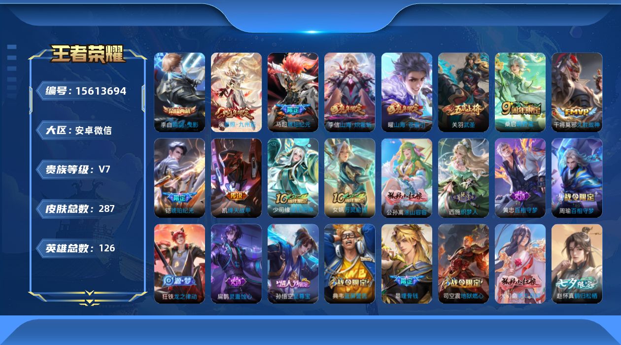 [15613694]安卓WX-V7-最强王者段位-126英雄-287皮肤-1典藏皮肤-11传说-86史诗-2星传说