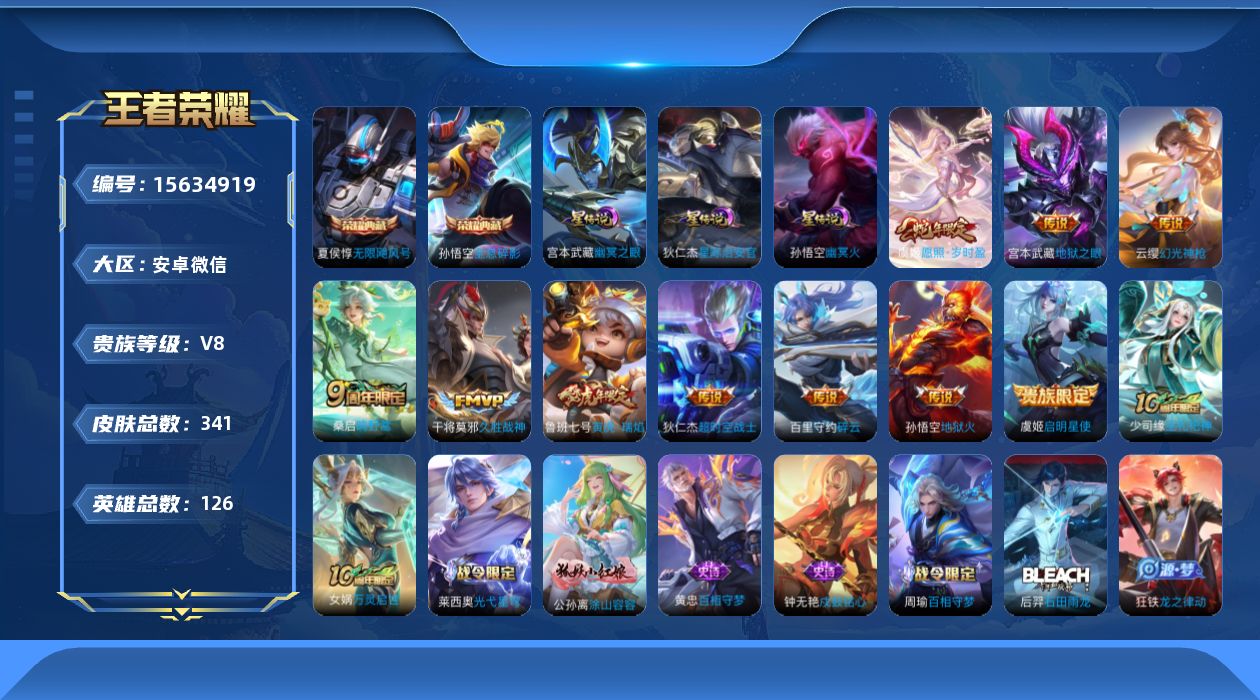 [15634919]安卓WX-V8-最强王者段位-126英雄-341皮肤-2典藏皮肤-11传说-94史诗-3星传-发育路44段
