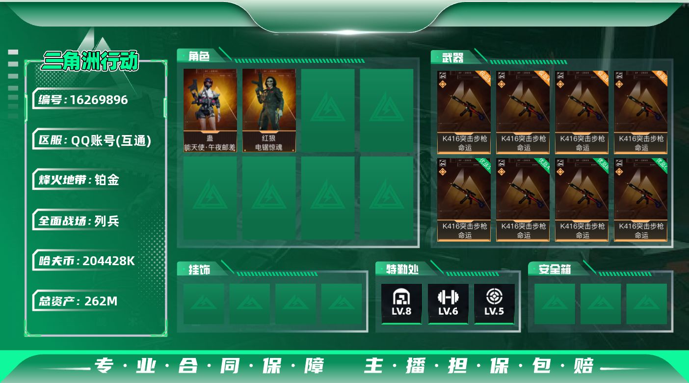 [16269896]【店主推荐捡漏号!可直接换绑】204428k哈伏币-234m流动资产-58烽火等级-铂金-17战场等级-列兵 【干员外观】:蛊-能天使午夜邮差,红狼-电锯惊魂 【近战皮肤】:近战-黑鹰 【典藏外观】:K416突击步枪-命运 【传说级普通外观】:SG552突击步枪-运动员,SCAR-H战斗步枪-启航,KC17突击步枪-电锯惊魂,Vector冲锋枪-能天使-午夜邮差,勇士冲锋枪-能天使-午夜邮差,M250通用机枪-骑士之心 【史诗级普通外观】:ASh-12战斗步枪-无极限,G3战斗步枪-流沙送葬,AS Val突击步枪-百步穿杨,腾龙突击步枪-猎鳄行动,K437突击步枪-守护者,MP5冲锋枪-战术竞备,MP5冲锋枪-竞技风,MP7冲锋枪-守护者,M250通用机枪-囚徒,Mini-14射手步枪-守护者,SV-98狙击步枪-林中猎手,M700狙击步枪-蝮蛇,AWM狙击步枪-无极限,复合弓-守护者 【稀有级普通外观】:M4A1突击步枪-零点,AKM突击步枪-战术演练,AKM突击步枪-肃杀,QBZ95-1突击步枪-公平竞技,ASh-12战斗步枪-繁盛,K416突击步枪-碳纤维,M7战斗步枪-捣蛋鬼,AK-12突击步枪-零点,SCAR-H战斗步枪-荣耀列队,SCAR-H战斗步枪-黄昏,G3战斗步枪-战术演练,G3战斗步枪-主宰,腾龙突击步枪-冰天雪地,MP5冲锋枪-弄臣,MP5冲锋枪-哈夫克卫队,P90冲锋枪-黄昏,P90冲锋枪-捣蛋鬼,UZI冲锋枪-亚特兰蒂斯,SMG-45-行动开启,SMG-45冲锋枪-幻影结构,SMG-45冲锋枪-天网,勇士冲锋枪-主宰,勇士冲锋枪-冰天雪地,M1014霰弹枪-幻影结构,S12K霰弹枪-战术演练,QJB201轻机枪-黄昏,QJB201轻机枪-哈夫克卫队,Mini-14射手步枪-荣耀列队,SVD狙击步枪-战术行动,SKS射手步枪-弄臣,SR-25射手步枪-开拓,G18-星链科技,G18-哈夫克航天 【普通级普通外观】:M4A1突击步枪-粉色涂装,M4A1突击步枪-海色,QBZ95-1突击步枪-高雅黑,QBZ95-1突击步枪-海浪,QBZ95-1突击步枪-三角洲力量,QBZ95-1突击步枪-海色,K416突击步枪-几何迷彩,K416突击步枪-高雅黑,M16A4突击步枪-三角洲力量,M16A4突击步枪-山林猎人,M16A4突击步枪-高雅黑,AUG突