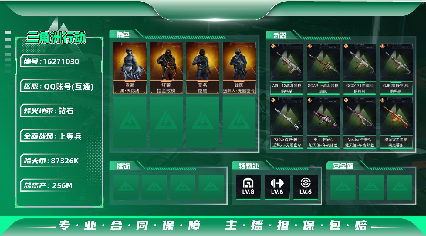 [16271030]【店主推荐捡漏号!可直接换绑】87326k哈伏币-223m流动资产-60烽火等级-钻石-20战场等级-上等兵 【干员外观】:红狼-蚀金玫瑰,露娜-黑·天际线,蜂医-送葬人·无题密令,无名-夜鹰 【近战皮肤】:近战-黑鹰 【典藏外观】:AK-12突击步枪-极地勘察队,K416突击步枪-纯白涂装,AKM突击步枪-淘金者,G3战斗步枪-水墨迷彩,AKS-74U突击步枪-蛇纹涂装,AS Val突击步枪-蝴蝶,AKM突击步枪-黄铜 【传说级普通外观】:M4A1突击步枪-蚀金玫瑰,M4A1突击步枪-阿米娅,ASh-12战斗步枪-鹅鸭杀,AK-12突击步枪-夜鹰,AK-12突击步枪-特斯拉线圈,SCAR-H战斗步枪-启航,CAR-15突击步枪-黑鹰坠落,CAR-15突击步枪-阿米娅,腾龙突击步枪-捞点薯条,Vector冲锋枪-能天使-午夜邮差,UZI冲锋枪-特斯拉线圈,SMG-45冲锋枪-骑士,SR-3M紧凑突击步枪-特斯拉线圈,勇士冲锋枪-能天使-午夜邮差,QCQ171冲锋枪-鹅鸭杀,725双管霰弹枪-送葬人-无题密令,QJB201轻机枪-鹅鸭杀,AWM狙击步枪-捞点薯条,93R-捞点薯条,复合弓-黑·天际线 【史诗级普通外观】:AKM突击步枪-林中猎手,QBZ95-1突击步枪-曙光,ASh-12战斗步枪-守夜人,M16A4突击步枪-竞赛选手,AUG突击步枪-蝮蛇,SG552突击步枪-尖端治疗,SG552突击步枪-深海恐惧,SCAR-H战斗步枪-囚徒,AS Val突击步枪-尖端治疗,AS Val突击步枪-典狱官,腾龙突击步枪-无垢,MP5冲锋枪-深海恐惧,MP5冲锋枪-竞技风,Vector冲锋枪-阿萨拉文明,Vector冲锋枪-猎鳄行动,SR-3M紧凑突击步枪-荒野求生,SR-3M紧凑突击步枪-战术竞备,勇士冲锋枪-深海恐惧,勇士冲锋枪-工业狂潮,MP7冲锋枪-无垢,M1014霰弹枪-林中猎手,S12K霰弹枪-曙光,PKM通用机枪-蝮蛇,PKM通用机枪-守夜人,PKM通用机枪-荒野求生,M250通用机枪-囚徒,SVD狙击步枪-阿萨拉工艺,SVD狙击步枪-暗夜猎手,SVD狙击步枪-荒野求生,M14射手步枪-黑鹰坠落,M14射手步枪-禁卫,SR-25射手步枪-尖端治疗,PSG-1射手步枪-无垢,SV-98狙击步枪-林中猎手,SV-98狙击步枪-囚徒,SV-98狙击步枪-猎鳄行
