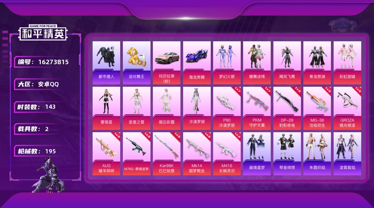- [17084940]安卓 手Q-2粉装-4特效枪-1载具-1粉色飞行器-50594热力值-8王牌印记-116套装-186枪皮 【热门品类】:套装-龟仙人 【粉色套装】:粉装-朗月武圣,粉装-星穹咏叹调 【粉色枪皮等级】:GROZA-镜光银凌(五级),Kar98K-巳巳如意(五级),DP-28-豹影疾电(五级) 【粉色载具】:迈凯伦570S(天际蓝) 【粉色枪皮】:GROZA-镜光银凌,Kar98K-巳巳如意,Mk14-福马献瑞,DP-28-豹影疾电 【粉色飞行器】:炫彩糖果飞行器 【粉色降落伞】:香水柠檬降落伞,彩虹甜喵降落伞,熔岩统帅降落伞,江南烟雨降落伞,墨龙九天降落伞,忍者神龟降落伞,异瞳寒姬降落伞,极意拳锋降落伞,炫彩糖果降落伞 【稀有套装】:套装-龟仙人,套装-雪国风尚,套装-炫彩糖果,套装-马上有钱,套装-糖糖葫芦,套装-青团波波,角色-摩登魅猫,套装-紫幽梦,套装-蓝冰羽,套装-霓虹热舞,角色-绛羽幽主,角色-暖阳柴柴 【稀有枪皮】:AUG-冰晶雪宝,AKM-夜灯,AKM-彩虹符号,AKM-破晓战魂,AKM-萌趣颜团子,AKM-虎虎生威,AKM-龙的传人,M16A4-红色方程式,M16A4-蓝色火焰,SCAR-L-玉兔迎春,SCAR-L-红色方程式,M416-糯团青竹,M416-红色方程式,M416-绯红前夜,M416-蓝色火焰,GROZA-异彩先驱,GROZA-彩虹符号,AUG-耀粉歌者,M762-天降萌叽,M762-牛气冲天,M762-绯红前夜,AC-VAL-天降萌叽,AC-VAL-快闪甜心,蜜獾-天降萌叽,蜜獾-娇憨猪猪,UZI-天降萌叽,UZI-娇憨猪猪,UZI-炫彩节奏,UZI-红色方程式,UMP45-生命誓言,UMP45-蓝色火焰,UMP45-极意拳锋,Vector-焰鹰斗篷,Vector-彩虹符号,汤姆逊-天降萌叽,汤姆逊-异彩先驱,汤姆逊-耀粉歌者,汤姆逊-智耀战神,野牛-夜灯,MP5K-异彩先驱,P90-快闪甜心,P90-巳巳如意,Kar98K-彩虹符号,Kar98K-梦幻火箭,Kar98K-欢乐麻酱,Kar98K-炫彩节奏,Kar98K-红色方程式,M24-奇异狩猎者,M24-幻彩电音,AWM-焰鹰斗篷,SKS-夜灯,SKS-炫彩节奏,Mini14-异彩先驱,Mini14-耀粉歌者,SLR-娇憨猪猪,QBU-飒粉甜心,M417-惊鸿侠骨,M417-星