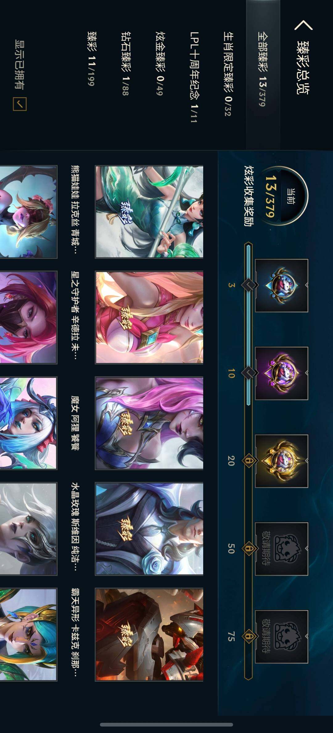 【臻彩皮肤】:无畏骑士瑟庄妮赤子初心,玉剑传说舞剑仙承影,星之守护者辛德拉未来之光,霸天异形卡兹克刹那银光,可爱可爱粉红红布里茨,殿堂传奇乐芙兰登神,星之守护者阿卡丽热情之光,魔女阿卡丽虚荣,魔女阿狸饕餮,净雪之月莫甘娜冬虹,水晶玫瑰斯维因纯洁花蕾,幽梦玫瑰伊莉丝浪漫花蕾