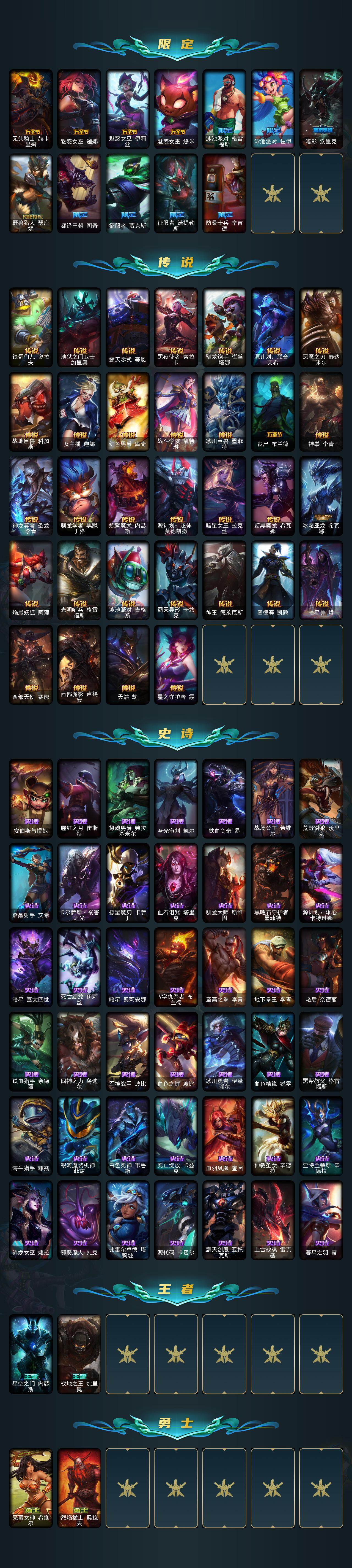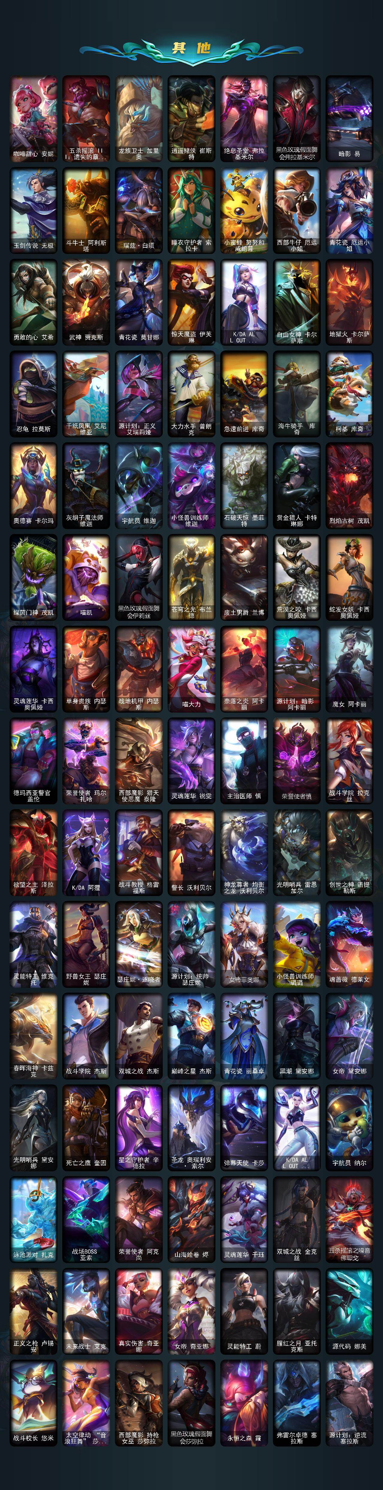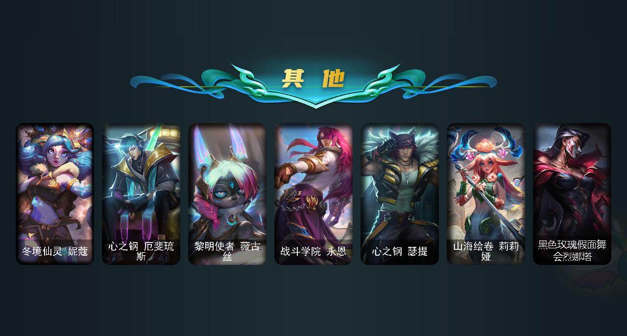 【传说皮肤】:铁哥们儿奥拉夫,地狱之门卫士加里奥,霸天零式赛恩,黑夜使者索拉卡,驯龙炮手崔丝塔娜,源计划联合艾希,恶魔之刃泰达米尔,