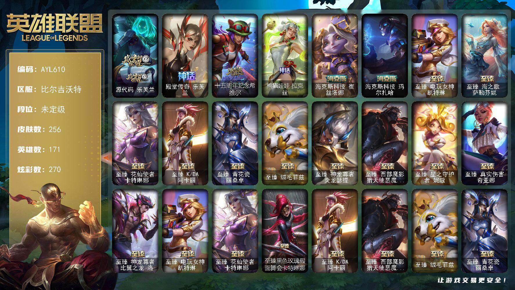 [16274127]【店主推荐捡漏号】未定级段位-171英雄-256皮肤-270炫彩-0终极-19神话-46限定-32传说-42史诗 【神话皮肤】:源代码乐芙兰,殿堂传奇乐芙兰,十五周年纪念希维尔,熊猫娃娃拉克丝,海克斯科技崔丝塔娜,海克斯科技玛尔扎哈,至臻真实伤害奇亚娜,至臻神龙尊者比翼之龙洛,至臻电玩女神凯特琳,至臻海之歌萨勒芬妮,至臻花仙使者卡特琳娜,至臻KDA阿卡丽,至臻青花瓷丽桑卓,至臻绒毛菲兹,至臻神龙尊者炎龙瑟提,至臻西部魔影猎天使恶魔泰隆,至臻星之守护者妮蔻 【至臻皮肤】:至臻电玩女神凯特琳,至臻花仙使者卡特琳娜,至臻黑色玫瑰假面舞会卡特琳娜,至臻KDA阿卡丽,至臻西部魔影猎天使恶魔泰隆,至臻绒毛菲兹,至臻青花瓷丽桑卓,至臻海之歌萨勒芬妮,至臻真实伤害奇亚娜,至臻战斗学院奇亚娜,至臻神龙尊者比翼之龙洛,至臻星之守护者妮蔻,至臻神龙尊者炎龙瑟提 【臻彩皮肤】:无畏骑士瑟庄妮赤子初心,玉剑传说舞剑仙承影,星之守护者辛德拉未来之光,霸天异形卡兹克刹那银光,可爱可爱粉红红布里茨,殿堂传奇乐芙兰登神,星之守护者阿卡丽热情之光,魔女阿卡丽虚荣,魔女阿狸饕餮,净雪之月莫甘娜冬虹,水晶玫瑰斯维因纯洁花蕾,幽梦玫瑰伊莉丝浪漫花蕾 【年限皮肤】:天龙之子斯莫德,点心宝贝阿木木 【海克斯皮肤】:海克斯科技崔丝塔娜,海克斯科技玛尔扎哈 【情人节限定】:觅心猎手薇恩,幽梦玫瑰伊莉丝,水晶玫瑰阿克尚 【冰雪限定】:幸福女神乐芙兰,圣诞狂欢努努和威朗普,阿木木“主人不要我了”,邪恶圣诞老人维迦,喜庆之树茂凯,魄罗骑士瑟庄妮,北极星使者沃里克,北极星使者彗 【限定皮肤】:冠军之血希瓦娜,2023全球总决赛雷克顿,SKTT1劫,SSW辛吉德,SSW锤石,SKTT1雷克顿,SKTT1瑞兹,SKTT1辛德拉,SKTT1扎克,DWG崔斯特,玉剑传说无劫,玉剑传说神机花火,女帝格温,暗裔英雄盖伦,胜利凤凰艾尼维亚,胜利女神娑娜,胜利剑圣易,胜利之运崔斯特,胜利女神菲奥娜,南瓜头费德提克,鬼影重重魔腾,无头骑士赫卡里姆,魅惑女巫迦娜,魅惑女巫伊莉丝,魅惑女巫悠米,泳池派对格雷福斯,泳池派对佐伊,暗影沃里克,野兽猎人瑟庄妮,都铎王朝图奇,征服者贾克斯,征服者诺提勒斯,防暴士兵辛吉德 【传说皮肤】:铁哥们儿奥拉夫,地狱之门卫士加里奥,霸天零式赛恩,黑夜使者索拉卡,驯龙炮手崔丝塔娜,源计划联合艾希,恶魔之刃泰达米尔,