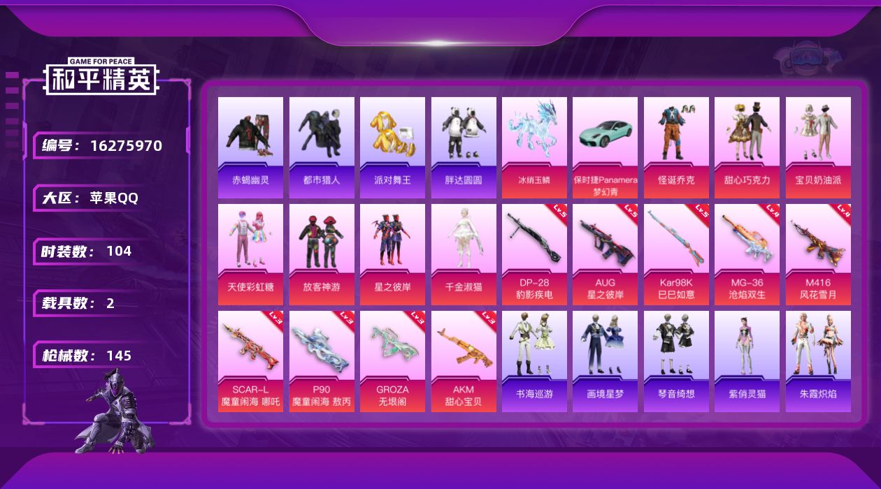 [16275970]【特价出售/店主推荐】 苹果 手Q-7粉装-10特效枪-2载具-4粉色飞行器-51733热力值-6王牌印记-104套装-145枪皮 【热门品类】:粉装-怪诞乔克,套装-浪漫天命,套装-赤蝎幽灵,套装-都市猎人,套装-派对舞王,套装-胖达圆圆,套装-金羽特工,套装-暗影哥特 【粉色套装】:粉装-怪诞乔克,粉装-甜心巧克力,粉装-宝贝奶油派,粉装-天使彩虹糖,粉装-放客神游,粉装-星之彼岸,角色-千金淑猫 【粉色枪皮等级】:AKM-甜心宝贝(三级),SCAR-L-魔童闹海 哪吒(三级),M416-风花雪月(四级),GROZA-无垠阁(三级),AUG-星之彼岸(五级),AKS-74U-森灵之息(五级),P90-魔童闹海 敖丙(三级),Kar98K-巳巳如意(五级),DP-28-豹影疾电(五级),MG-36-沧焰双生(四级) 【粉色载具】:保时捷Panamera(梦幻青),僚机-萌兔起飞,冰绡玉鳞 【粉色枪皮】:AKM-甜心宝贝,SCAR-L-魔童闹海 哪吒,M416-风花雪月,GROZA-无垠阁,AUG-星之彼岸,AKS-74U-森灵之息,P90-魔童闹海 敖丙,Kar98K-巳巳如意,DP-28-豹影疾电,MG-36-沧焰双生 【粉色飞行器】:萌物绒绒飞行器,飞天猪飞行器,灵珠游龙飞行器 【粉色降落伞】:甜心宝贝降落伞,星之彼岸降落伞,炫光之旅降落伞,夜幕颂歌降落伞,沙丘之主降落伞,喜羊羊与灰太狼降落伞,魔童闹海 哪吒降落伞,炫彩糖果降落伞 【稀有套装】:套装-绒宝小鹅,套装-巳巳如意,套装-雪国风尚,套装-炫彩糖果,套装-先驱飞行员,套装-糖糖葫芦,套装-青团波波,套装-棉花软糖,套装-燕燕于飞,套装-鱼渊荷华,角色-风玲,角色-时希公主,套装-朱霞炽焰,套装-凌霄紫焰,套装-擎苍青焰,角色-紫俏灵猫,套装-书海巡游,套装-画境星梦,套装-琴音绮想 【稀有枪皮】:AUG-冰晶雪宝,AKM-影袭,AKM-星之彼岸,AKM-破晓战魂,AKM-龙的传人,SCAR-L-炫彩节奏,SCAR-L-粉锦千层,M416-红色方程式,M416-蓝色火焰,GROZA-异彩先驱,GROZA-影袭,GROZA-晶梦幻蝶,AUG-甜蜜菠萝,M762-天降萌叽,M762-甜心宝贝,M762-第五大道,G36C-镜域双华,AC-VAL-快闪甜心,AC-VAL-闲梦青缨,Famas-镜域双华,AC