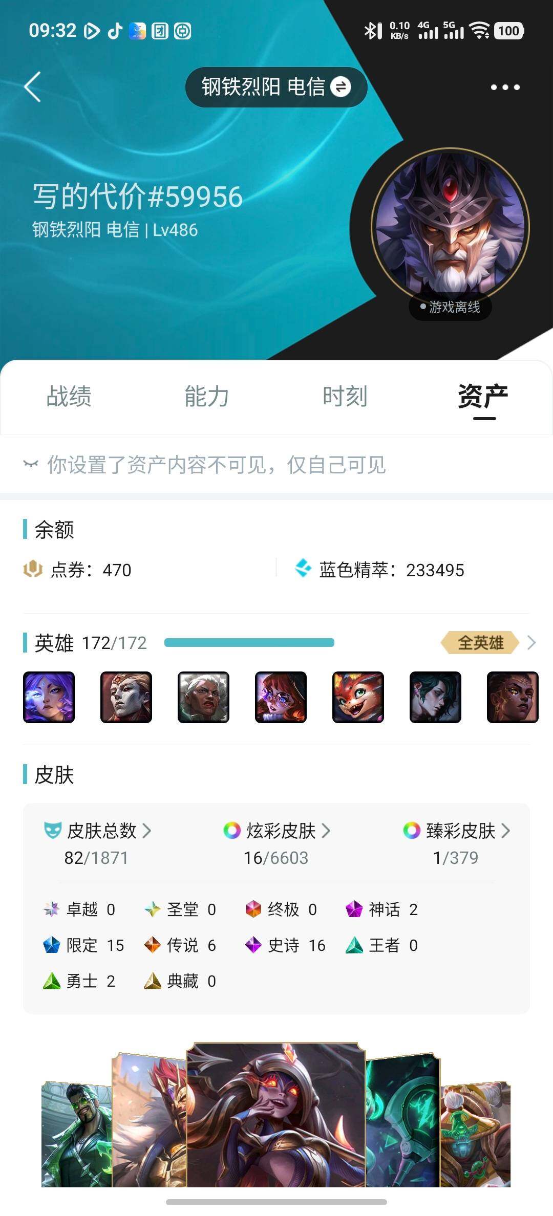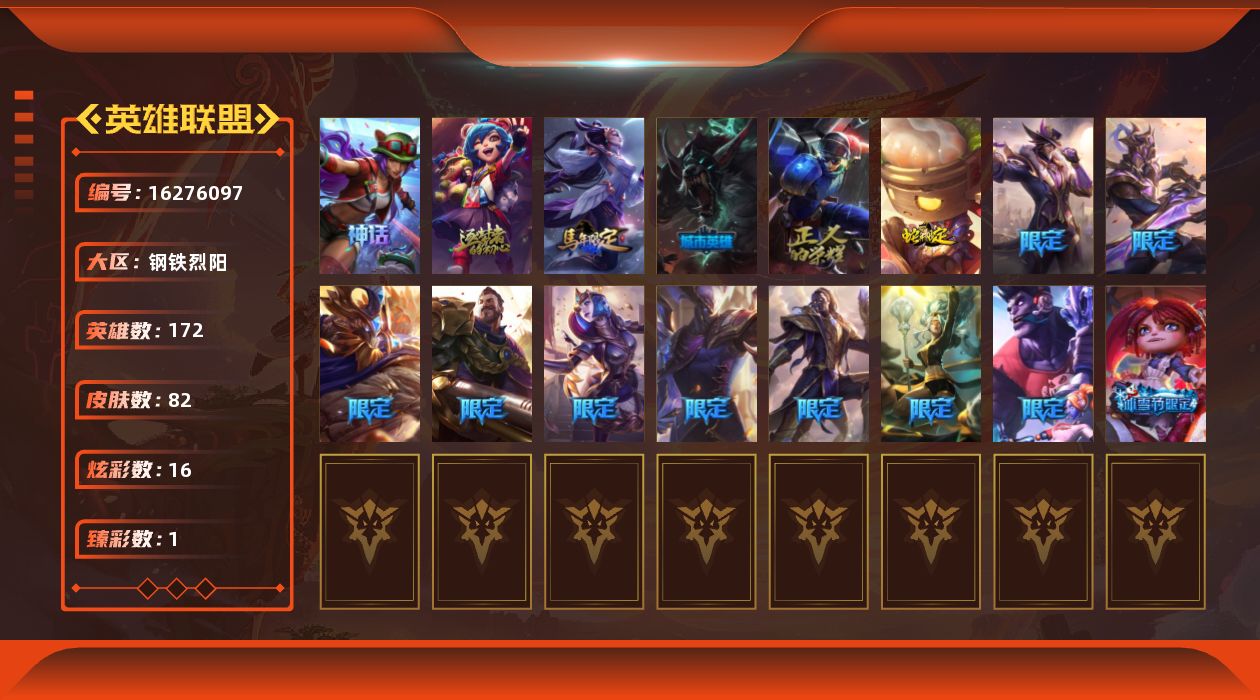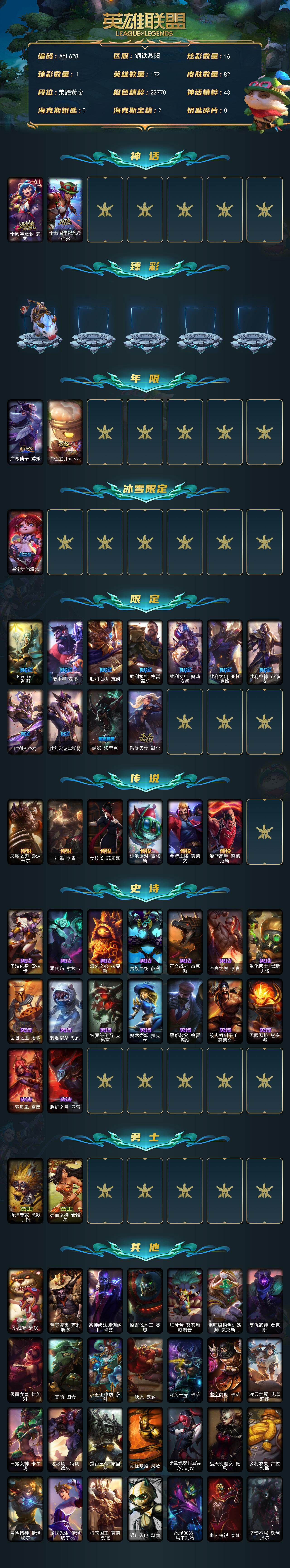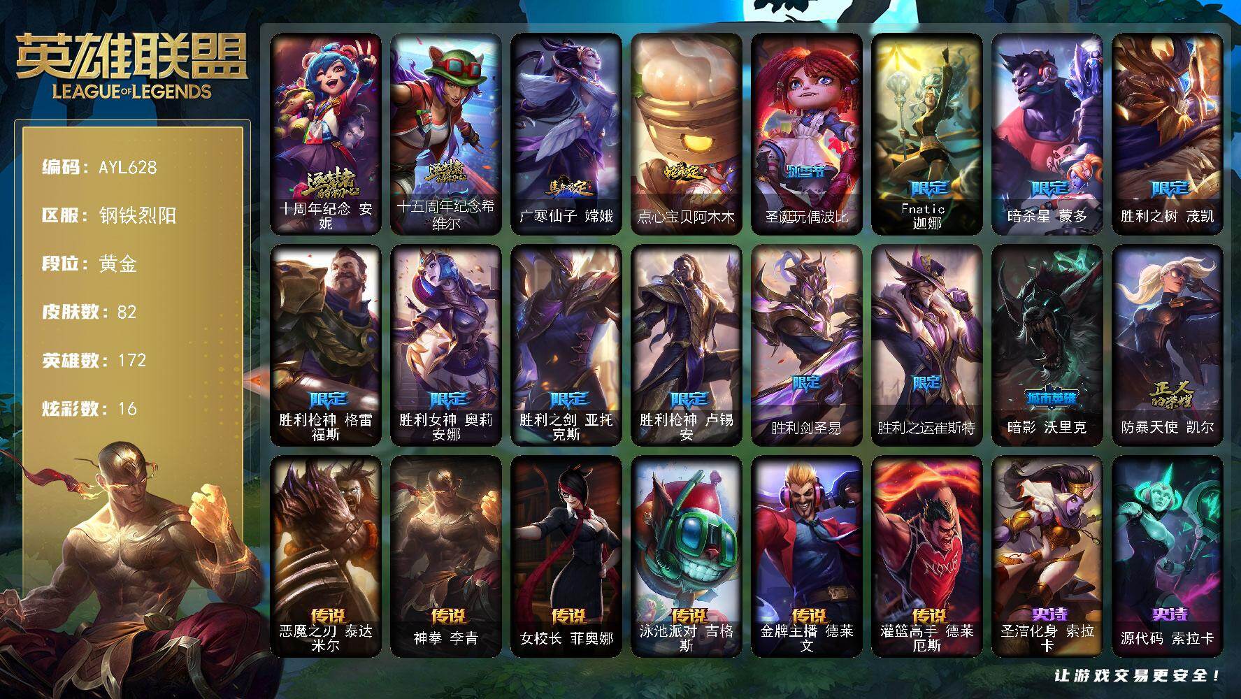 [16276097]【店主推荐捡漏号】黄金段位-172英雄-82皮肤-16炫彩-0终极-2神话-15限定-6传说-16史诗