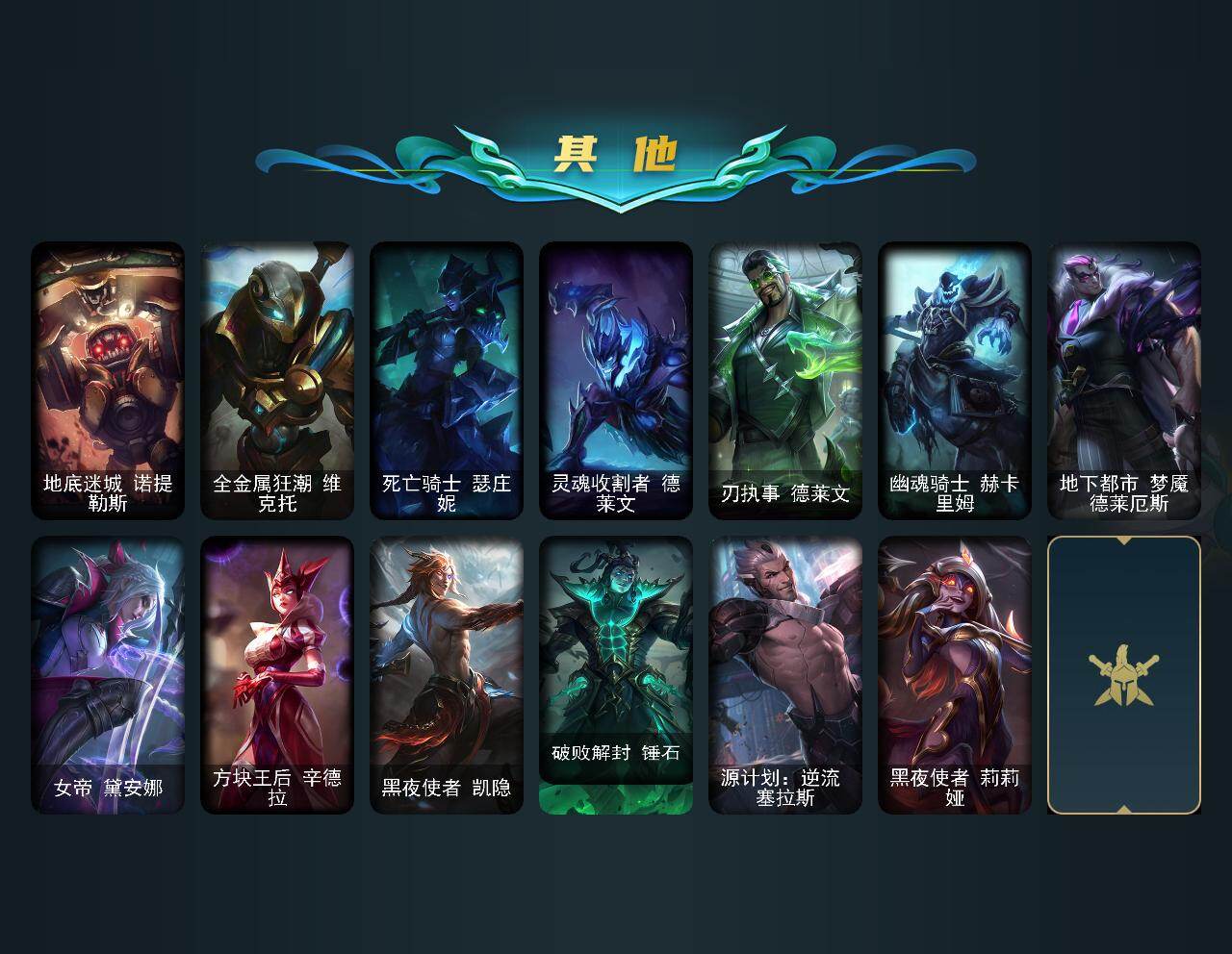 【其他皮肤1】:小红帽安妮,荒野镖客阿利斯塔,宗师级法师训练师瑞兹,原野伐木工赛恩,脏兮兮努努和威朗普,宗师级钓鱼训练师贾克斯,复仇武神贾克斯,假面女皇伊芙琳,首领图奇,小丑工作坊萨科,硬汉蒙多,深海一号卡萨丁,虚空前世卡萨丁,凌云之翼艾瑞莉娅,日冕女神卡尔玛,垃圾场特朗德尔,擂台皇帝布里茨,劫掠梦魇魔腾,黑色玫瑰假面舞会伊莉丝,猎天使魔女薇恩,乡村农夫古拉加斯,冒险精神伊泽瑞尔,足球先生伊泽瑞尔,梅花国王莫德凯撒,银色闪电凯南,战场BOSS玛尔扎哈,血色精锐泰隆,坚韧不屈沃利贝尔,地底迷城诺提勒斯,全金属狂潮维克托,死亡骑士瑟庄妮,灵魂收割者德莱文,刃执事德莱文,幽魂骑士赫卡里姆,地下都市梦魇德莱厄斯,女帝黛安娜,方块王后辛德拉,黑夜使者凯隐,破败解封锤石,源计划逆流塞拉斯,黑夜使者莉莉娅