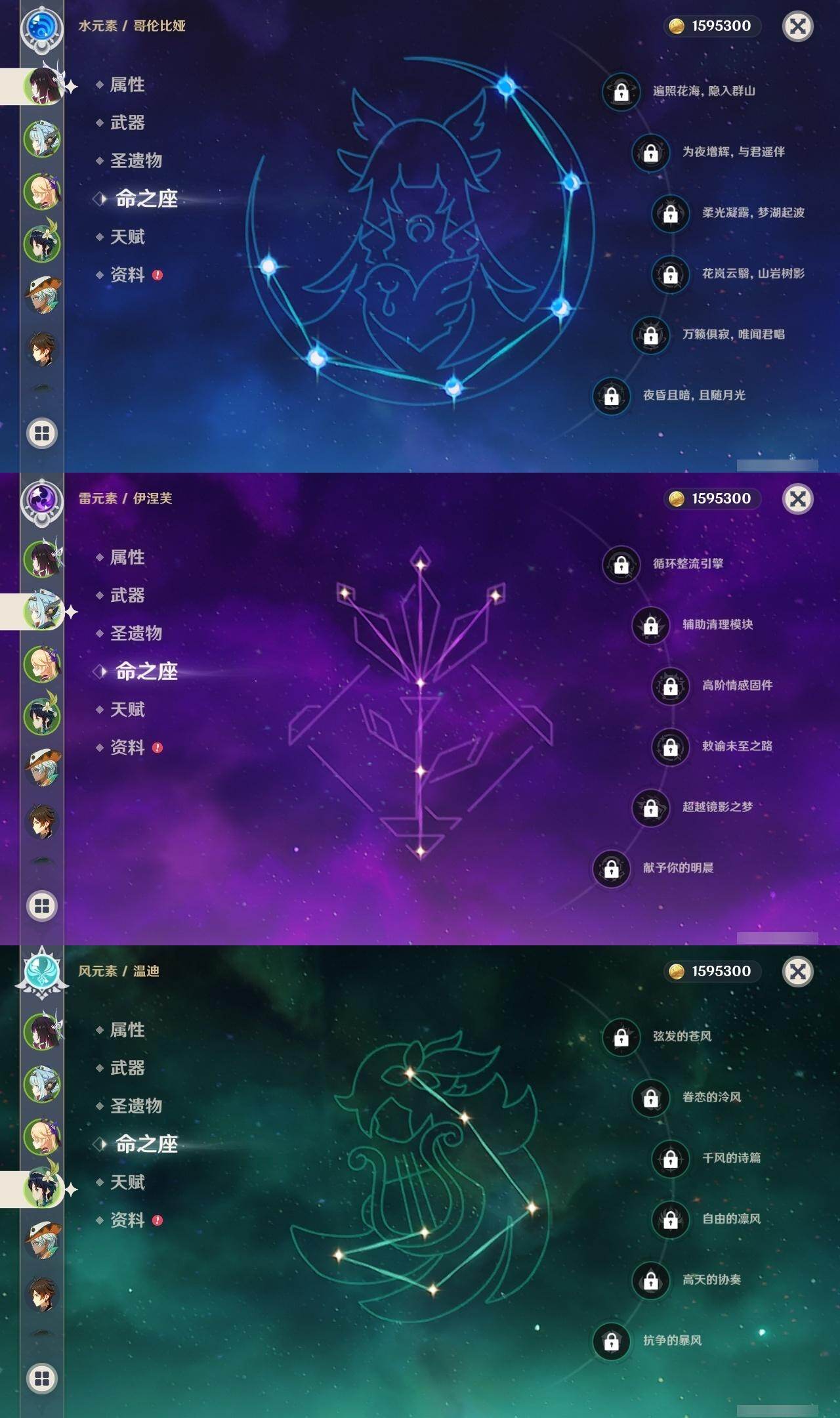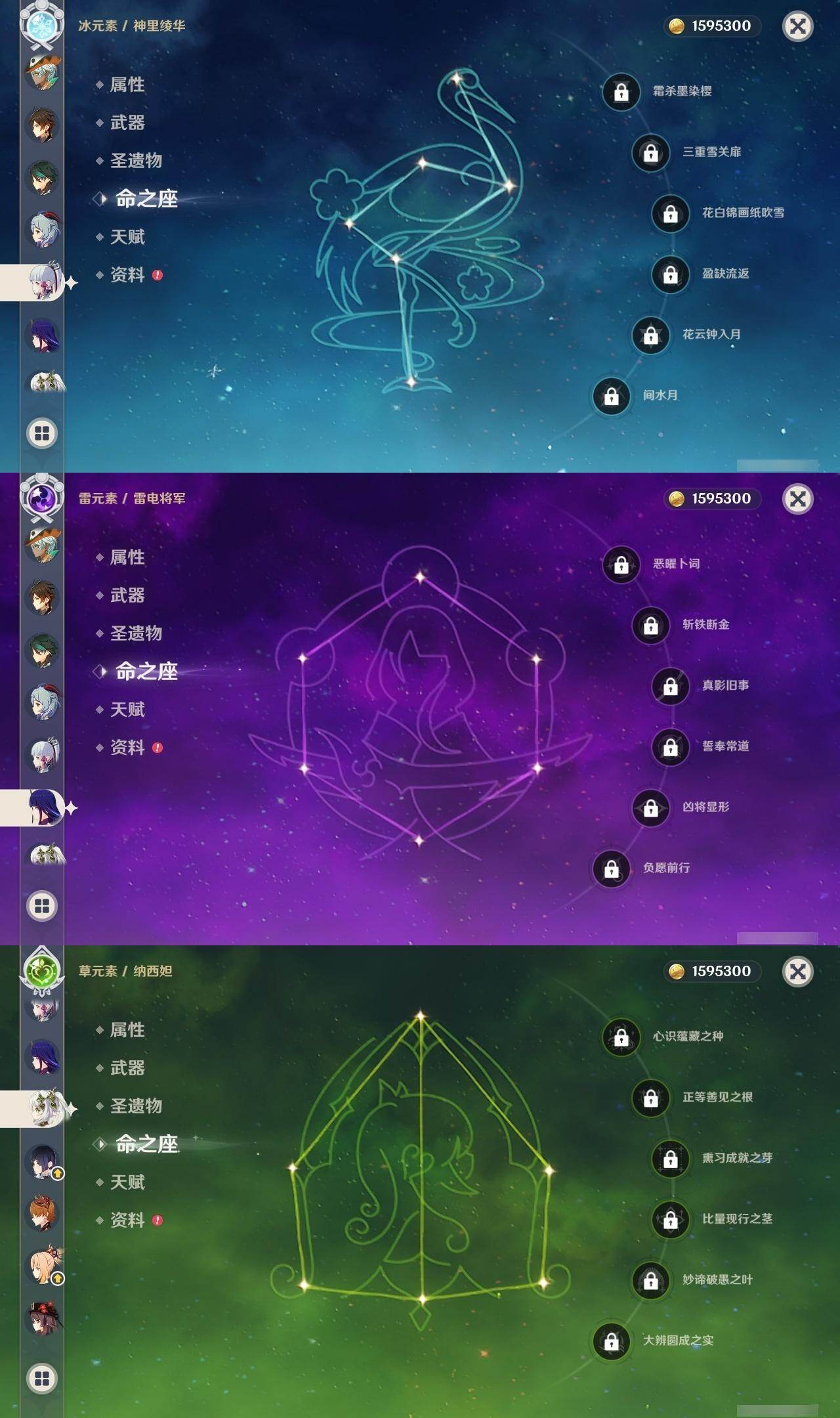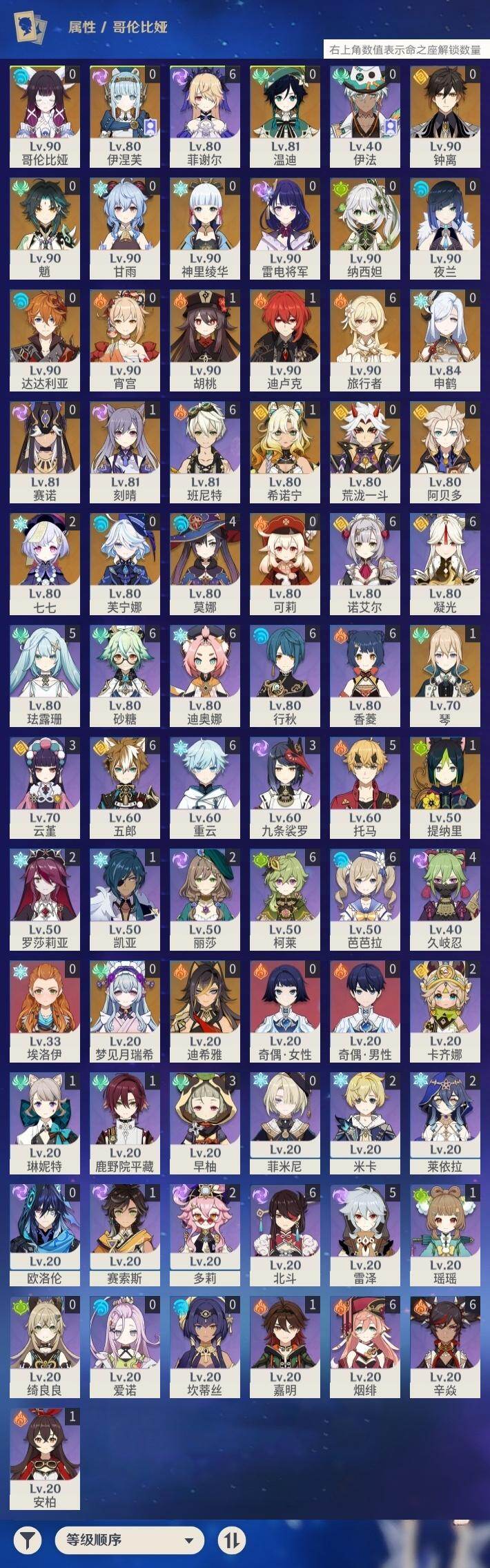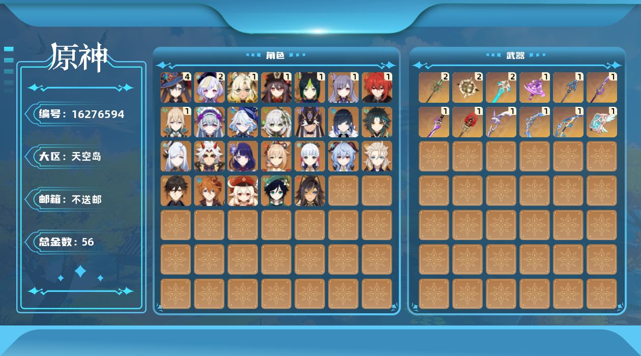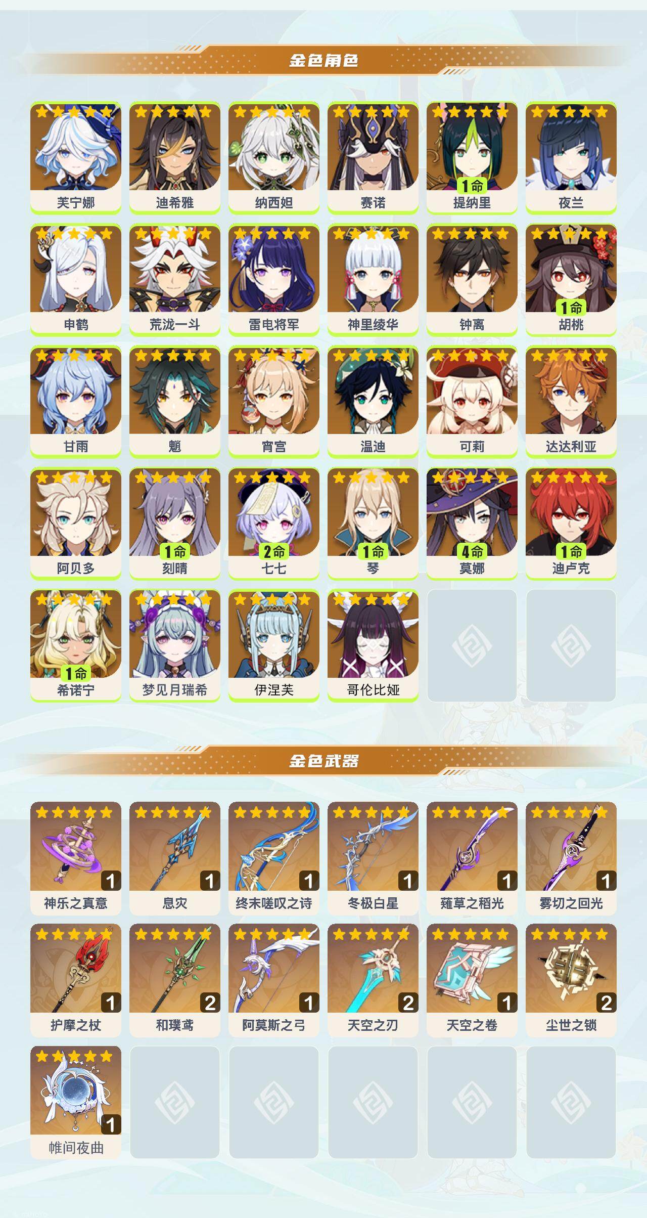 0命芙宁娜,0命迪希雅,0命纳西妲,0命赛诺,1命提纳里,0命夜兰,0命申鹤,0命荒泷一斗,0命雷电将军,0命神里绫华,0命钟离,1命胡桃,0命甘雨,0命魈,0命宵宫,0命温迪,0命可莉,0命达达利亚,0命阿贝多,1命刻晴,2命七七,1命琴,4命莫娜,1命迪卢克,1命希诺宁,0命梦见月瑞希,0命伊涅芙,0命哥伦比娅,精1神乐之真意,精1息灾,精1终末嗟叹之诗,精1冬极白星,精1薙草之稻光,精1雾切之回光,精1护摩之杖,精2和璞鸢,精1阿莫斯之弓,精2天空之刃,精1天空之卷,精2尘世之锁,精1帷间夜曲