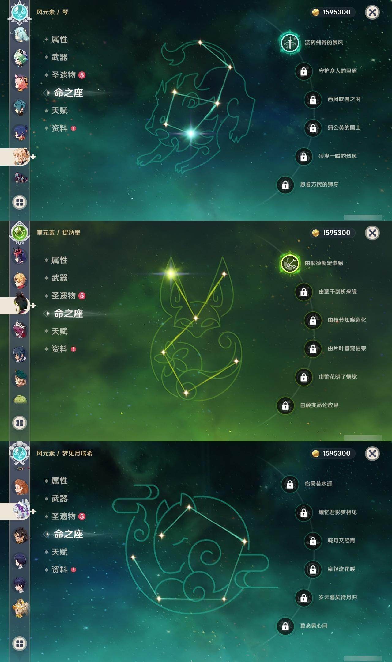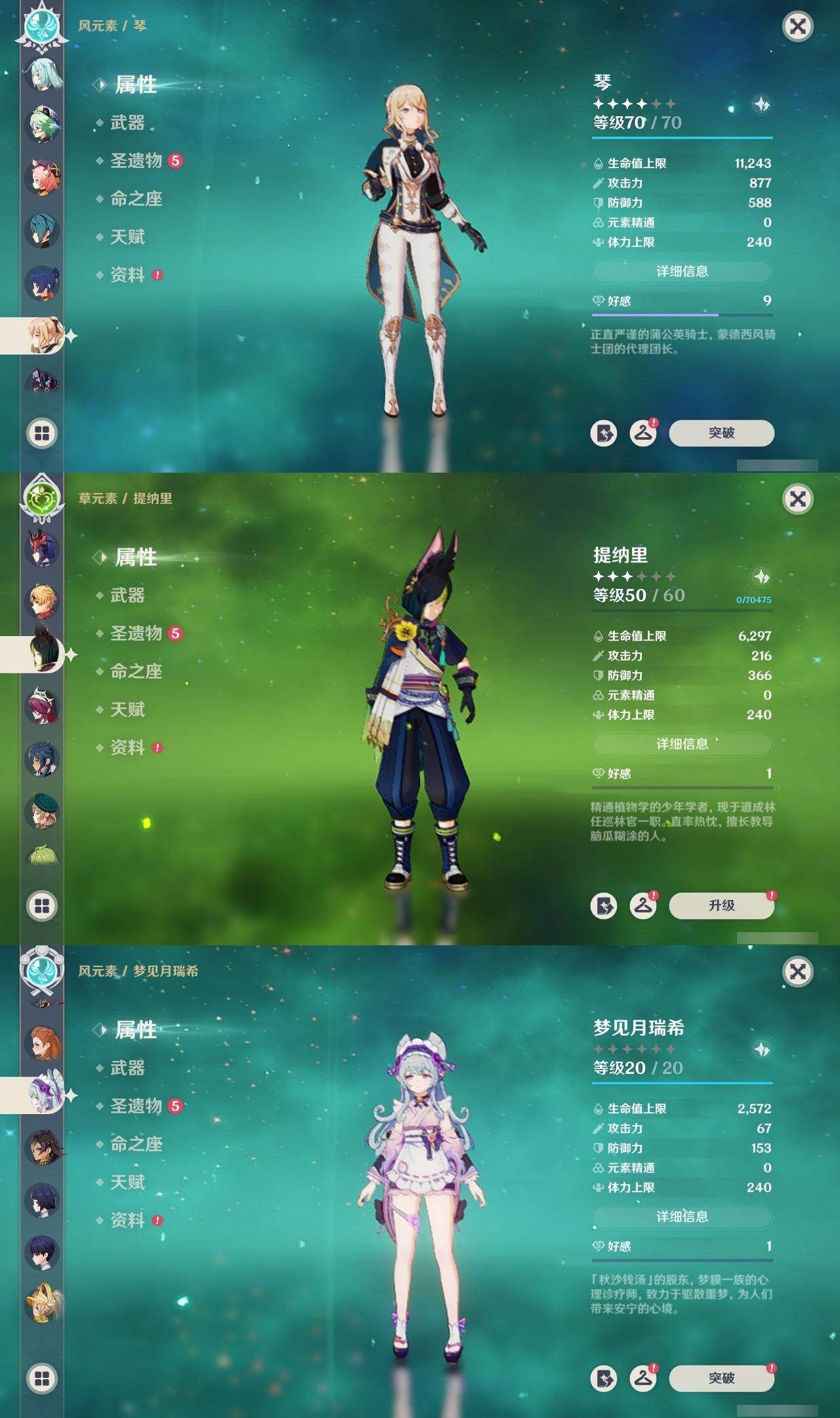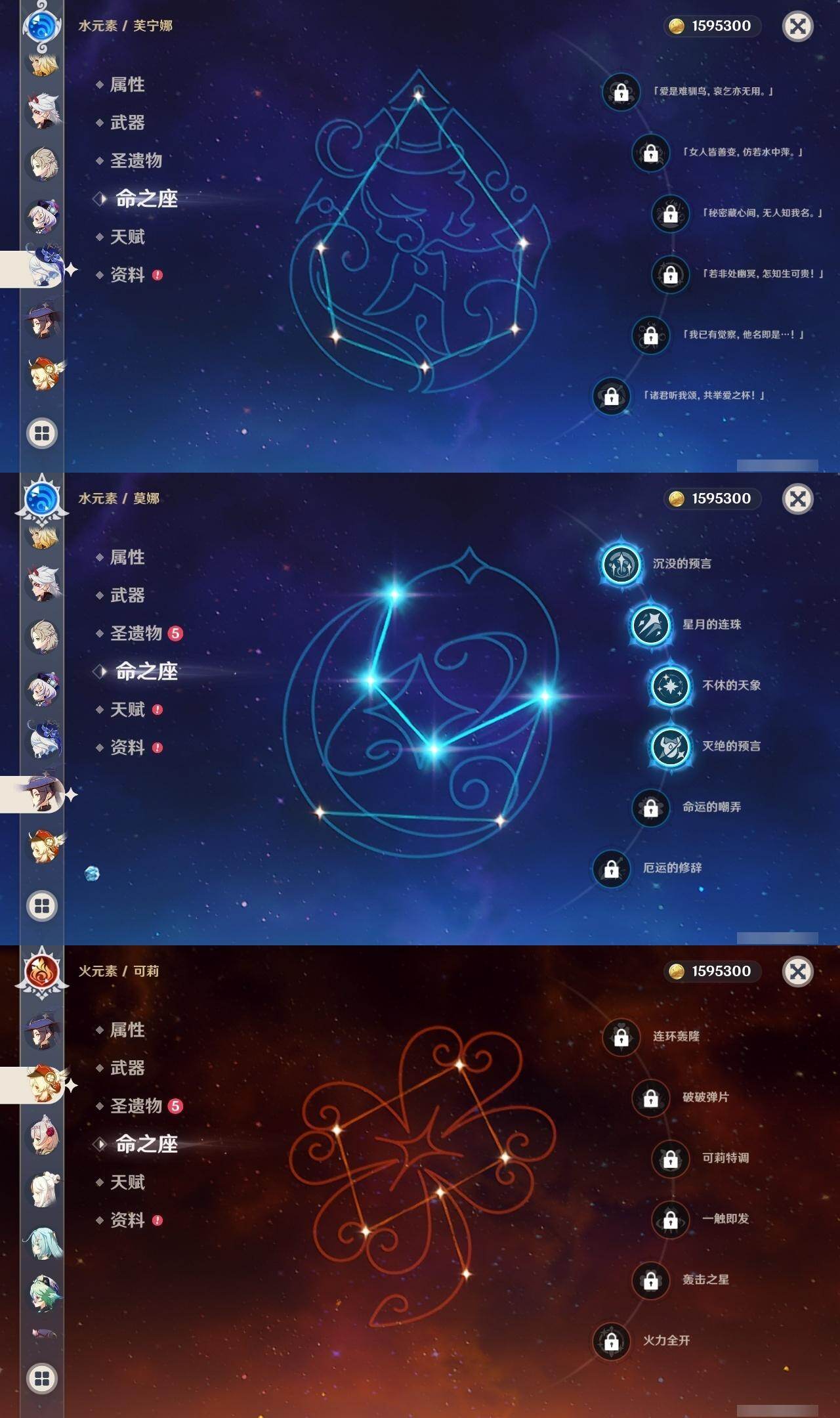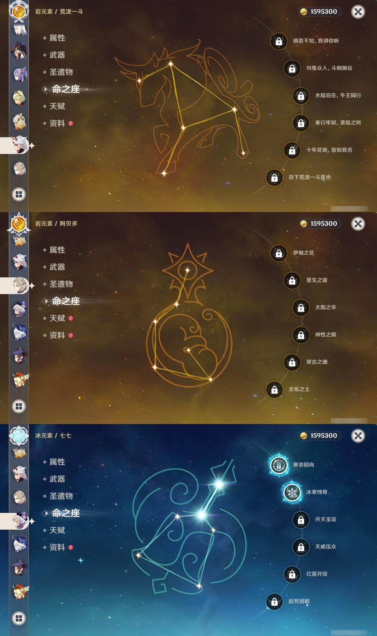 0命芙宁娜,0命迪希雅,0命纳西妲,0命赛诺,1命提纳里,0命夜兰,0命申鹤,0命荒泷一斗,0命雷电将军,0命神里绫华,0命钟离,1命胡桃,0命甘雨,0命魈,0命宵宫,0命温迪,0命可莉,0命达达利亚,0命阿贝多,1命刻晴,2命七七,1命琴,4命莫娜,1命迪卢克,1命希诺宁,0命梦见月瑞希,0命伊涅芙,0命哥伦比娅,精1神乐之真意,精1息灾,精1终末嗟叹之诗,精1冬极白星,精1薙草之稻光,精1雾切之回光,精1护摩之杖,精2和璞鸢,精1阿莫斯之弓,精2天空之刃,精1天空之卷,精2尘世之锁,精1帷间夜曲