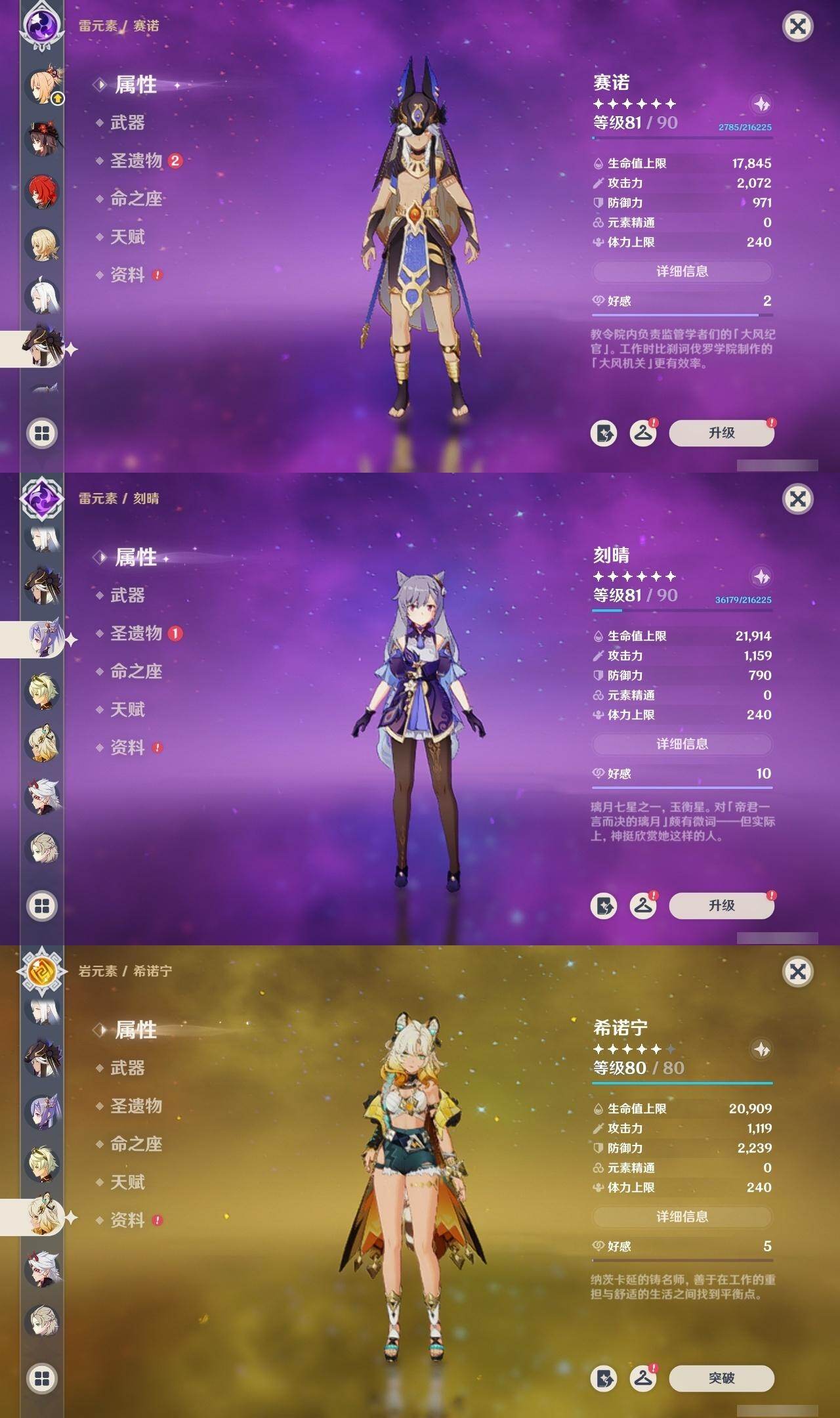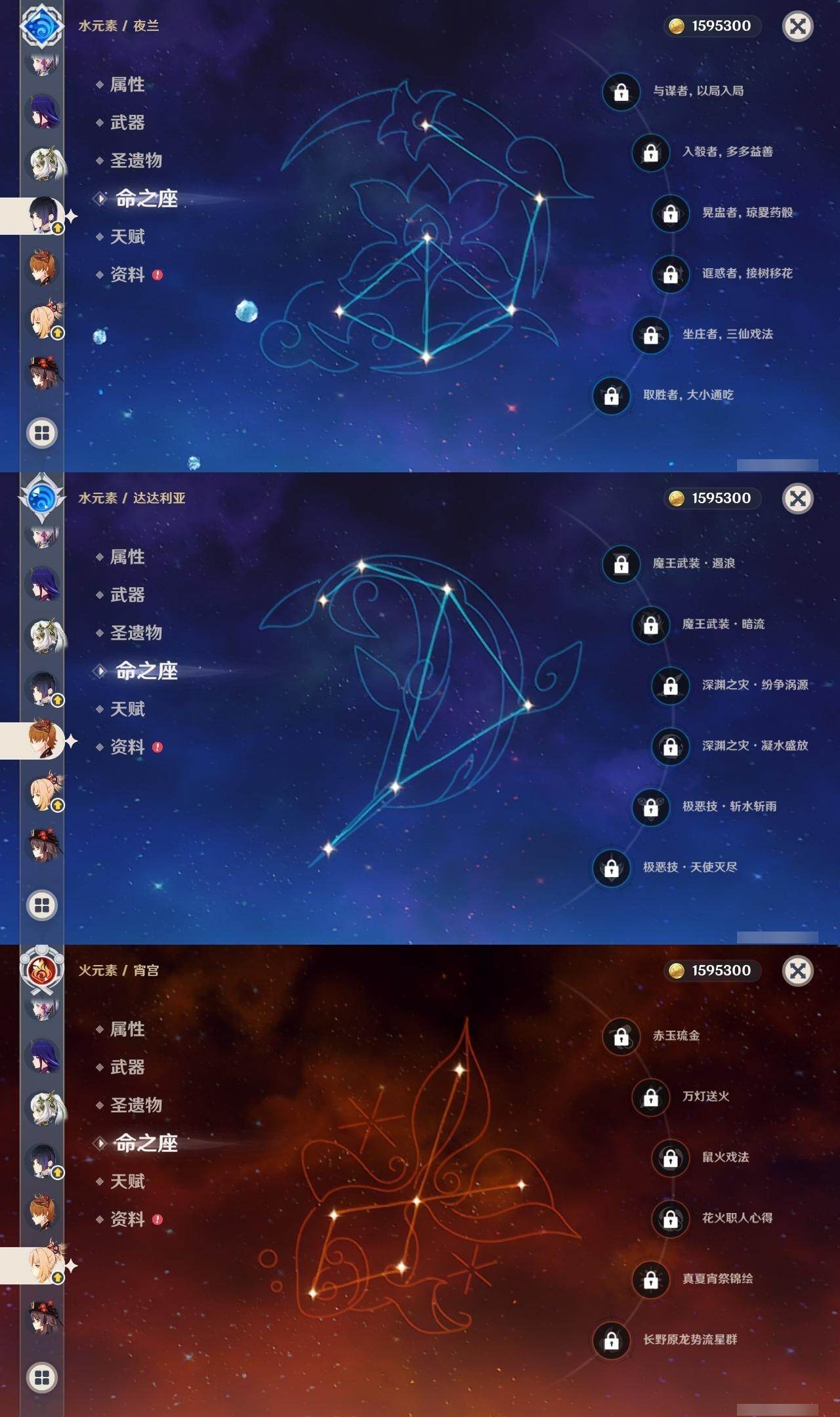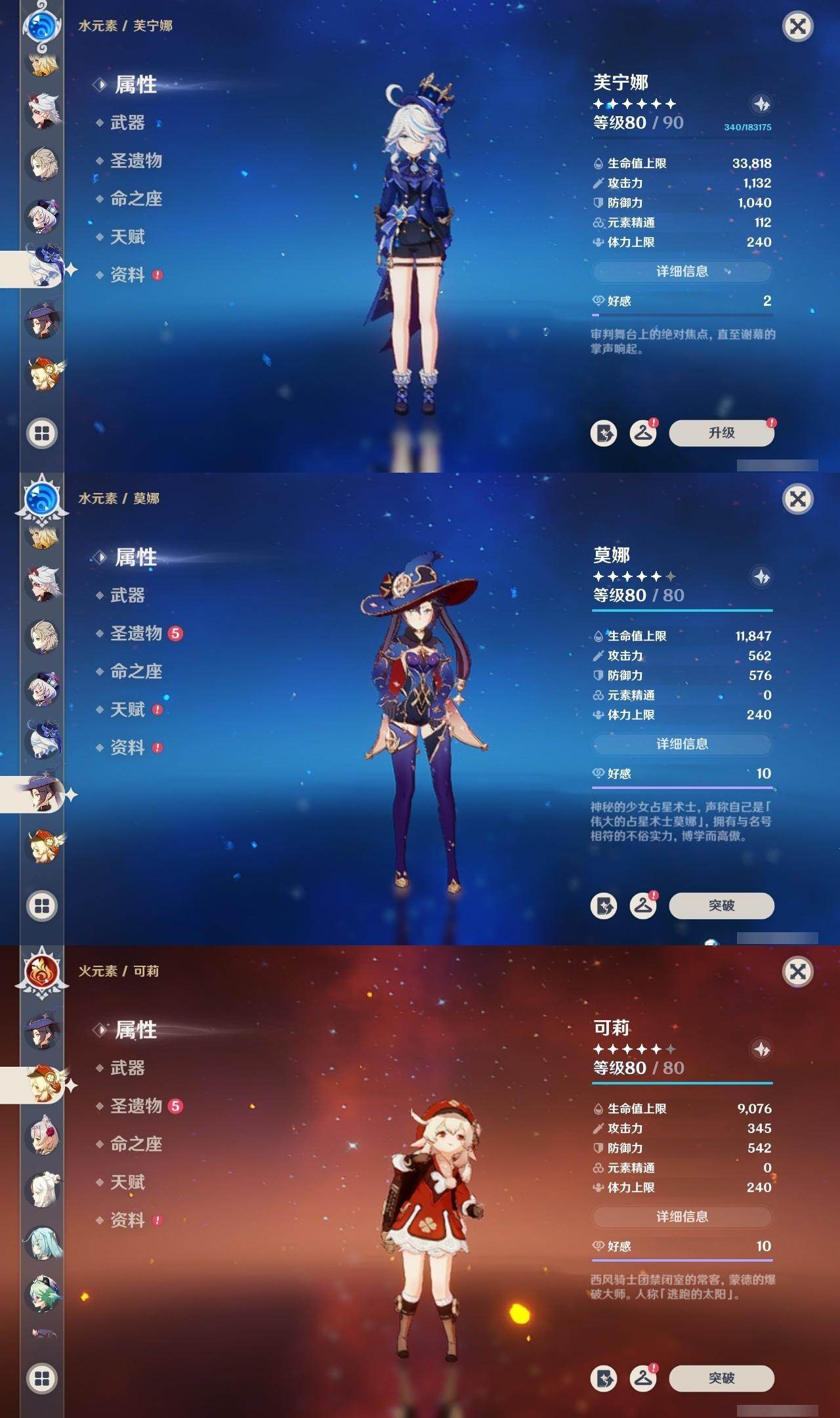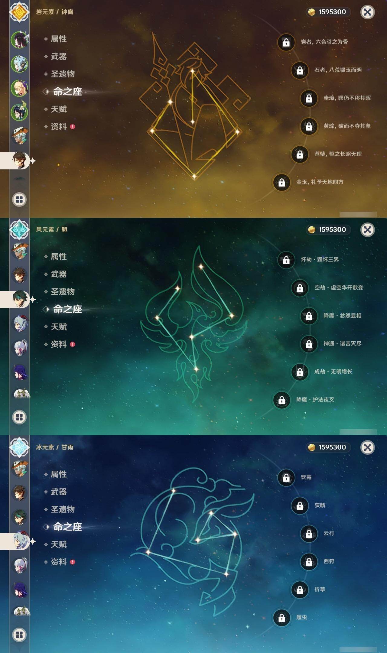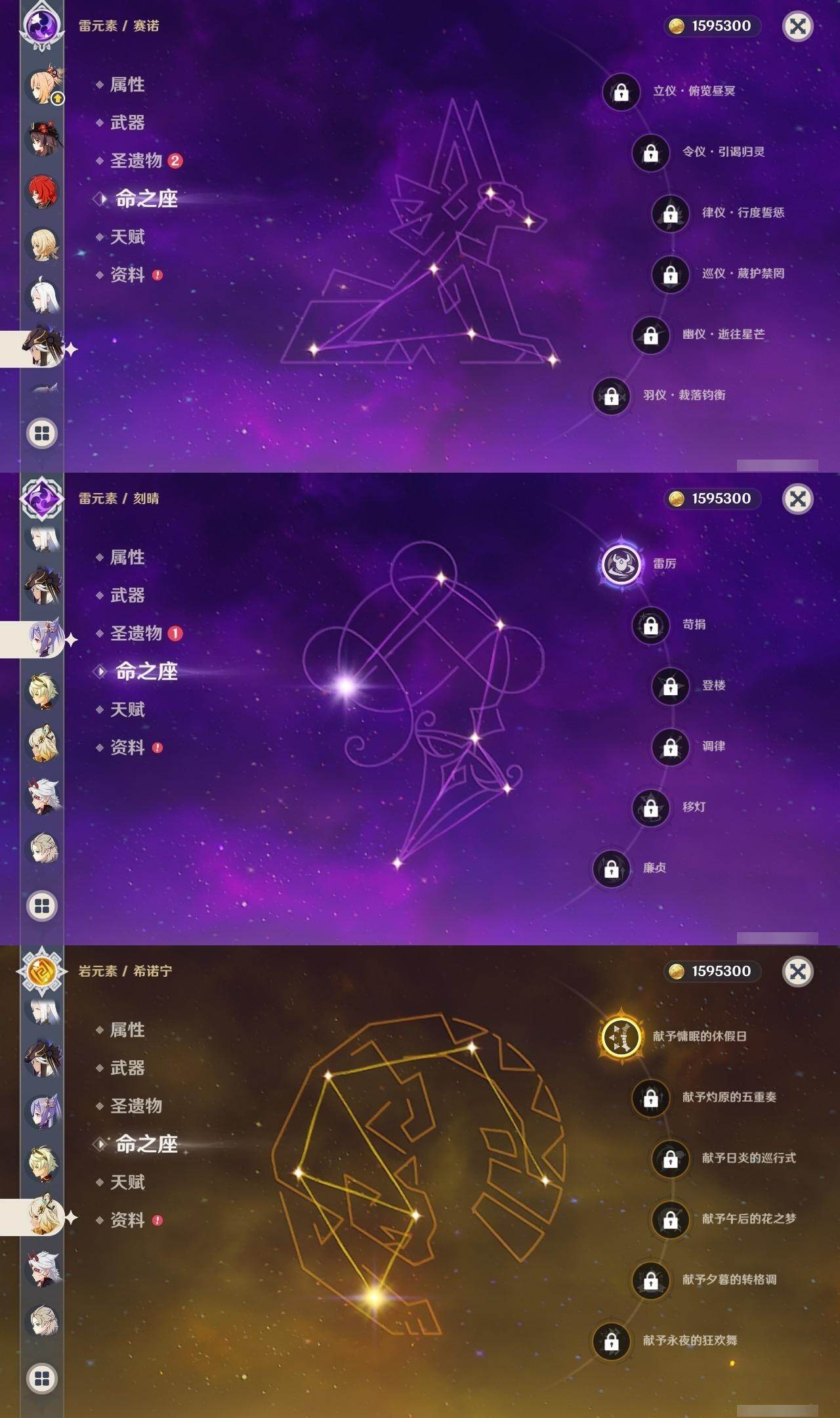 0命芙宁娜,0命迪希雅,0命纳西妲,0命赛诺,1命提纳里,0命夜兰,0命申鹤,0命荒泷一斗,0命雷电将军,0命神里绫华,0命钟离,1命胡桃,0命甘雨,0命魈,0命宵宫,0命温迪,0命可莉,0命达达利亚,0命阿贝多,1命刻晴,2命七七,1命琴,4命莫娜,1命迪卢克,1命希诺宁,0命梦见月瑞希,0命伊涅芙,0命哥伦比娅,精1神乐之真意,精1息灾,精1终末嗟叹之诗,精1冬极白星,精1薙草之稻光,精1雾切之回光,精1护摩之杖,精2和璞鸢,精1阿莫斯之弓,精2天空之刃,精1天空之卷,精2尘世之锁,精1帷间夜曲