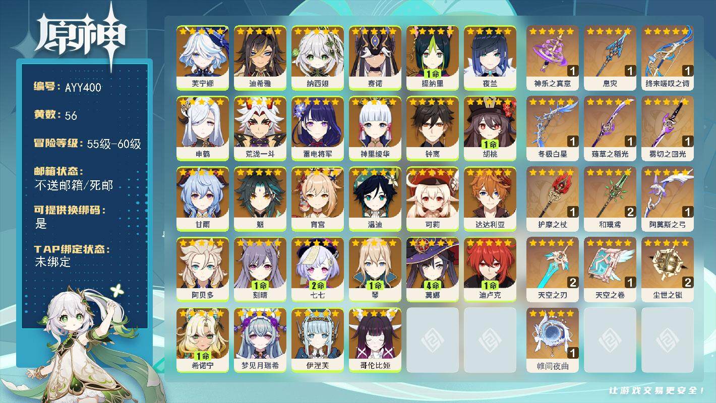 [16276594]【店主推荐捡漏号】60级/56黄/女主/28个五星角色/13个五星武器 0命芙宁娜,0命迪希雅,0命纳西妲,0命赛诺,1命提纳里,0命夜兰,0命申鹤,0命荒泷一斗,0命雷电将军,0命神里绫华,0命钟离,1命胡桃,0命甘雨,0命魈,0命宵宫,0命温迪,0命可莉,0命达达利亚,0命阿贝多,1命刻晴,2命七七,1命琴,4命莫娜,1命迪卢克,1命希诺宁,0命梦见月瑞希,0命伊涅芙,0命哥伦比娅,精1神乐之真意,精1息灾,精1终末嗟叹之诗,精1冬极白星,精1薙草之稻光,精1雾切之回光,精1护摩之杖,精2和璞鸢,精1阿莫斯之弓,精2天空之刃,精1天空之卷,精2尘世之锁,精1帷间夜曲