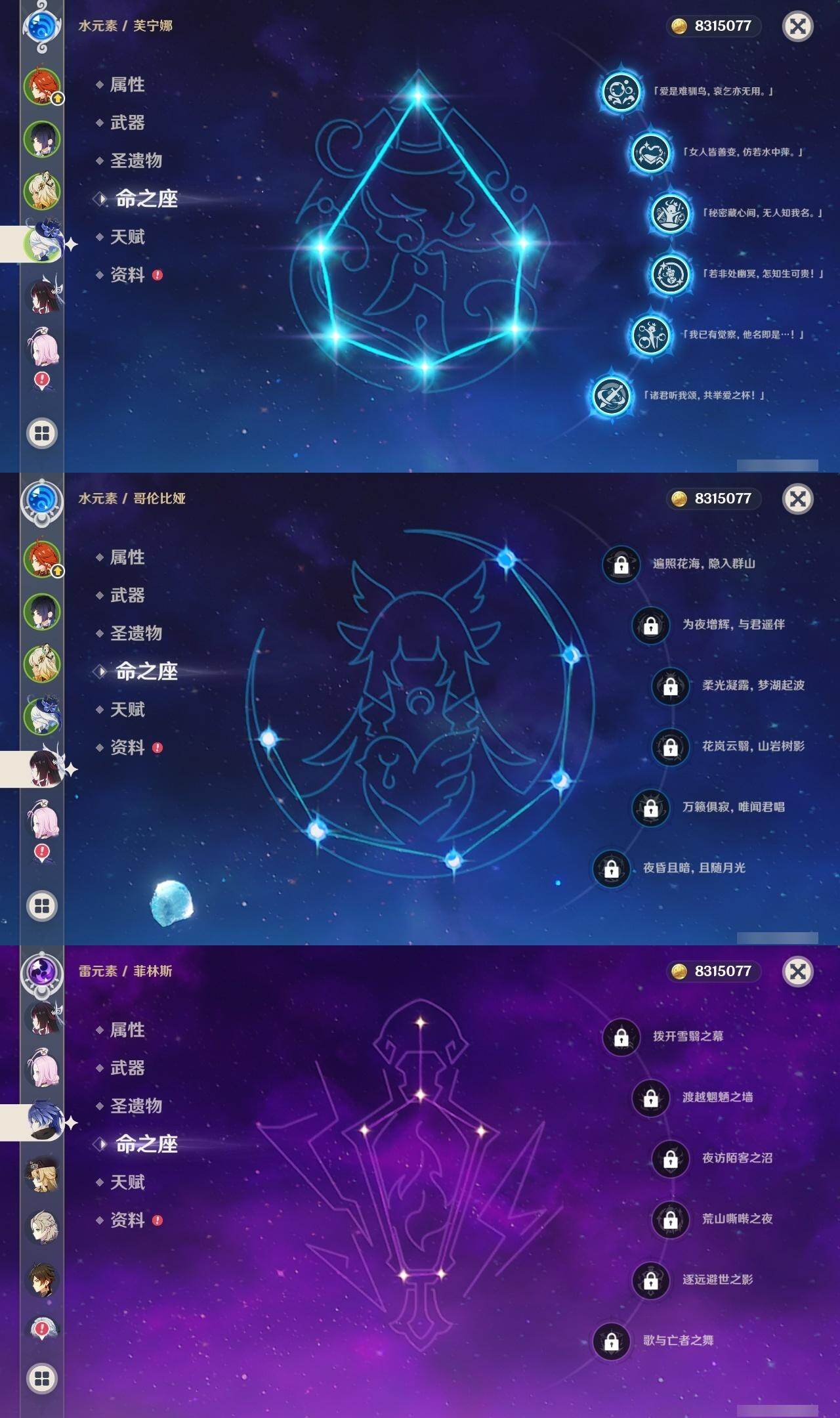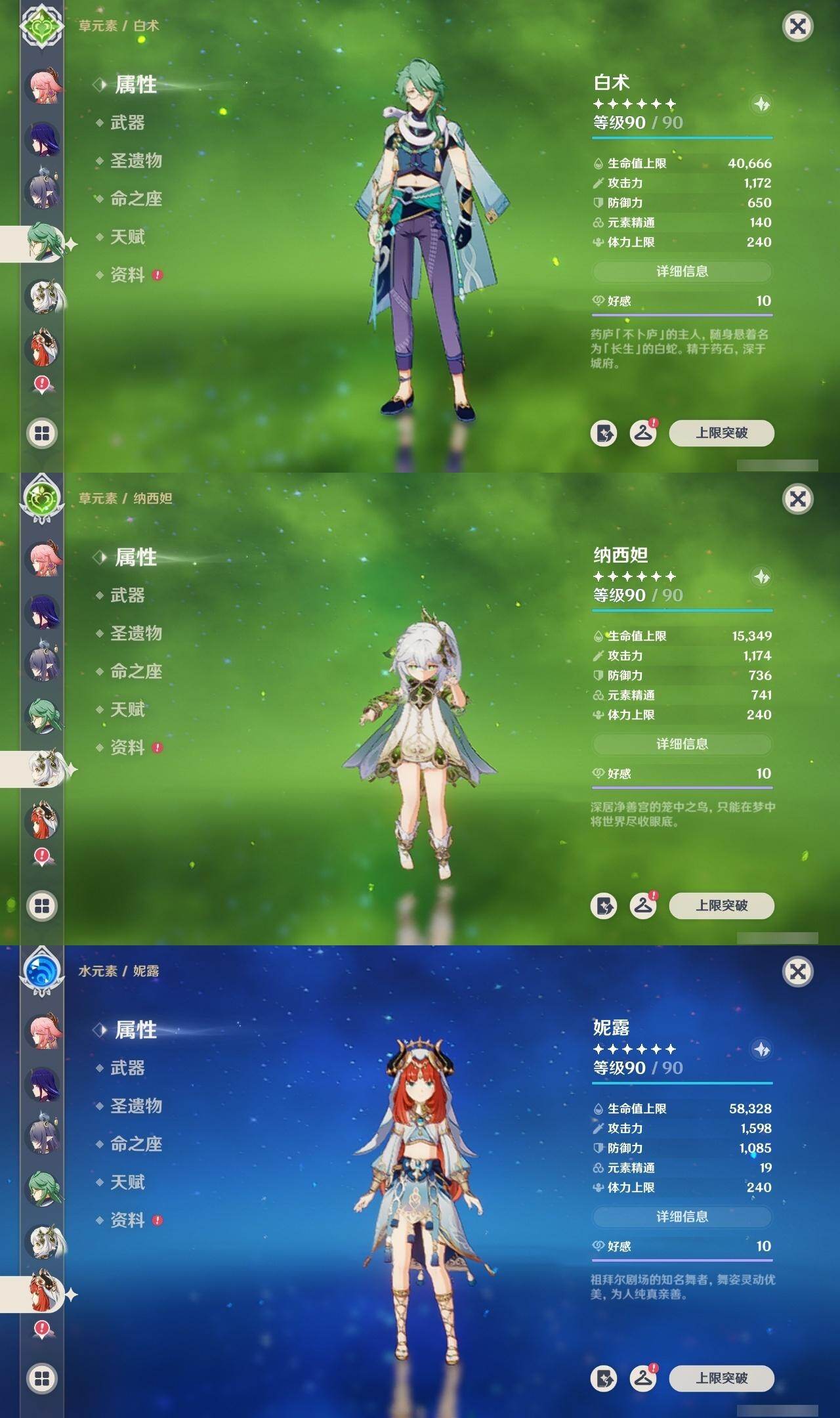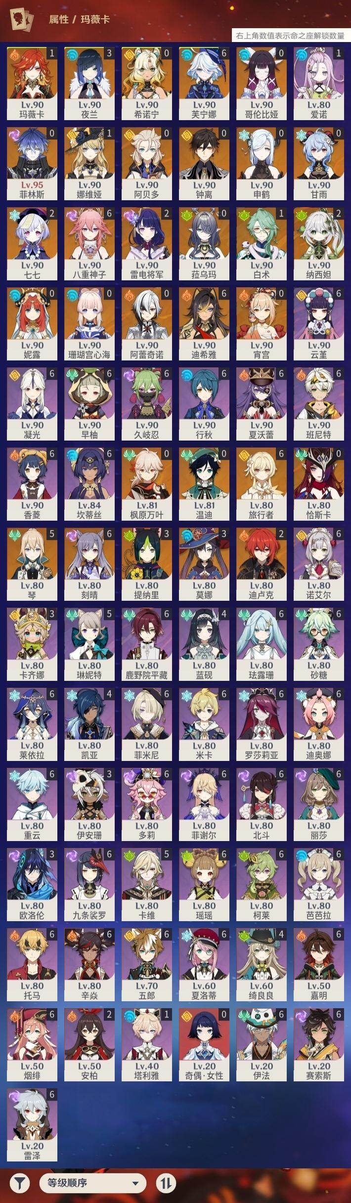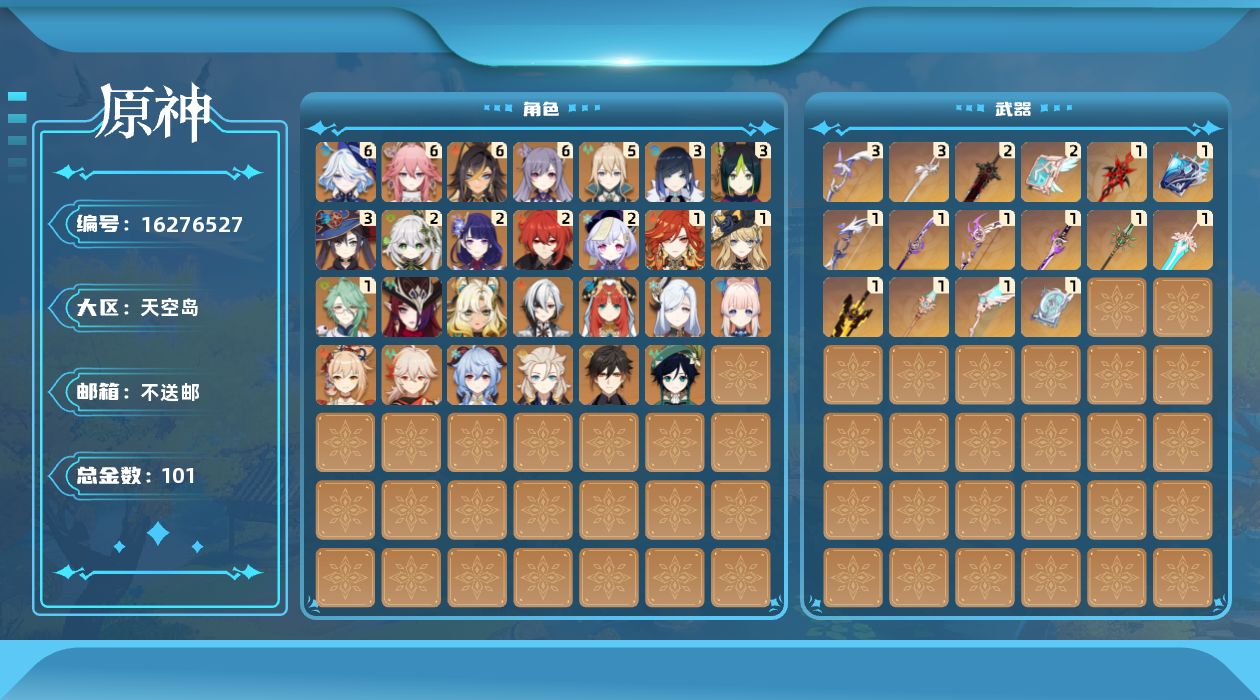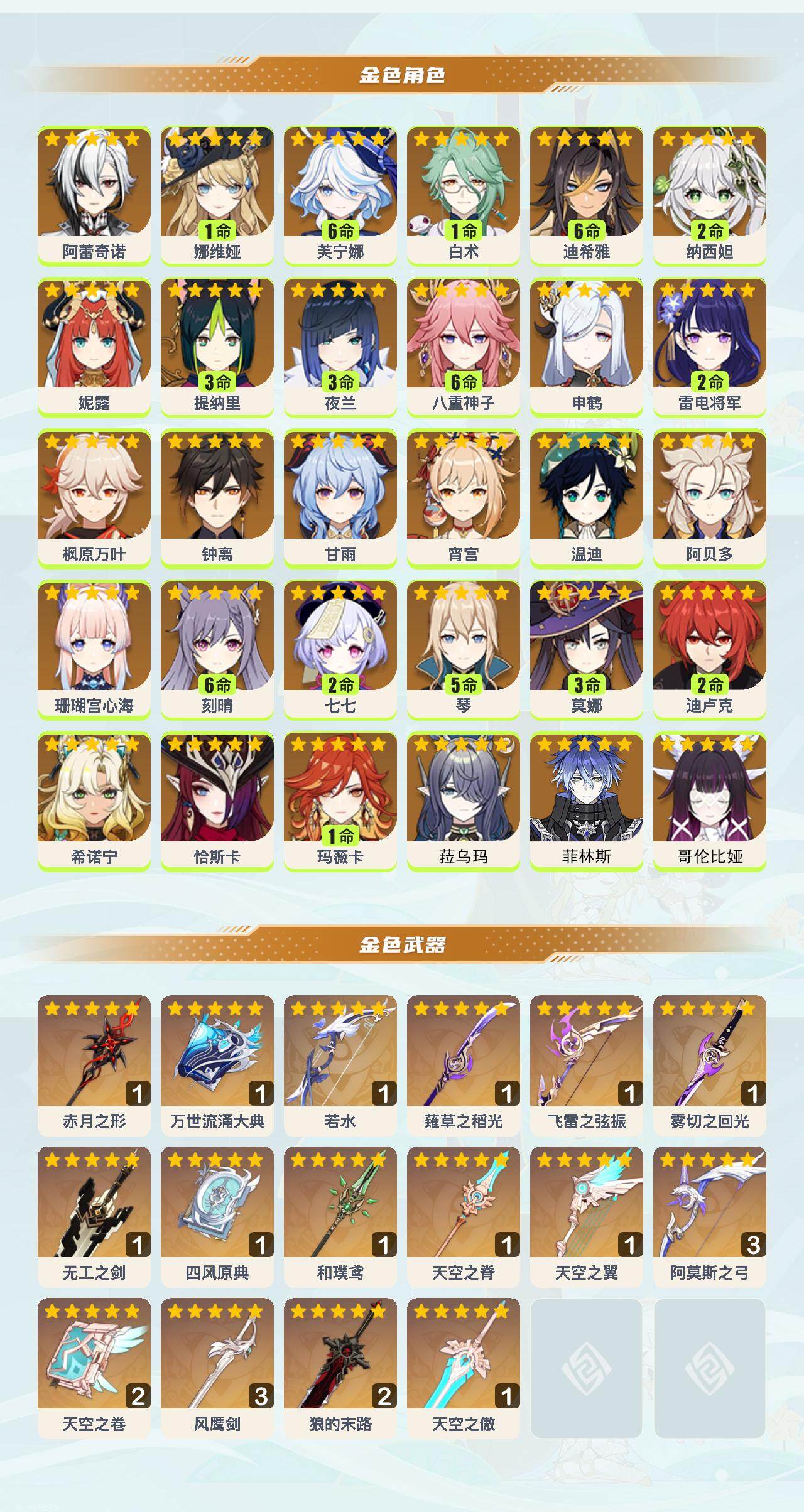 0命阿蕾奇诺,1命娜维娅,满命芙宁娜,1命白术,满命迪希雅,2命纳西妲,0命妮露,3命提纳里,3命夜兰,满命八重神子,0命申鹤,2命雷电将军,0命枫原万叶,0命钟离,0命甘雨,0命宵宫,0命温迪,0命阿贝多,0命珊瑚宫心海,满命刻晴,2命七七,5命琴,3命莫娜,2命迪卢克,0命希诺宁,0命恰斯卡,1命玛薇卡,0命菈乌玛,0命菲林斯,0命哥伦比娅,精1赤月之形,精1万世流涌大典,精1若水,精1薙草之稻光,精1飞雷之弦振,精1雾切之回光,精1无工之剑,精1四风原典,精1和璞鸢,精1天空之脊,精1天空之翼,精3阿莫斯之弓,精2天空之卷,精3风鹰剑,精2狼的末路,精1天空之傲