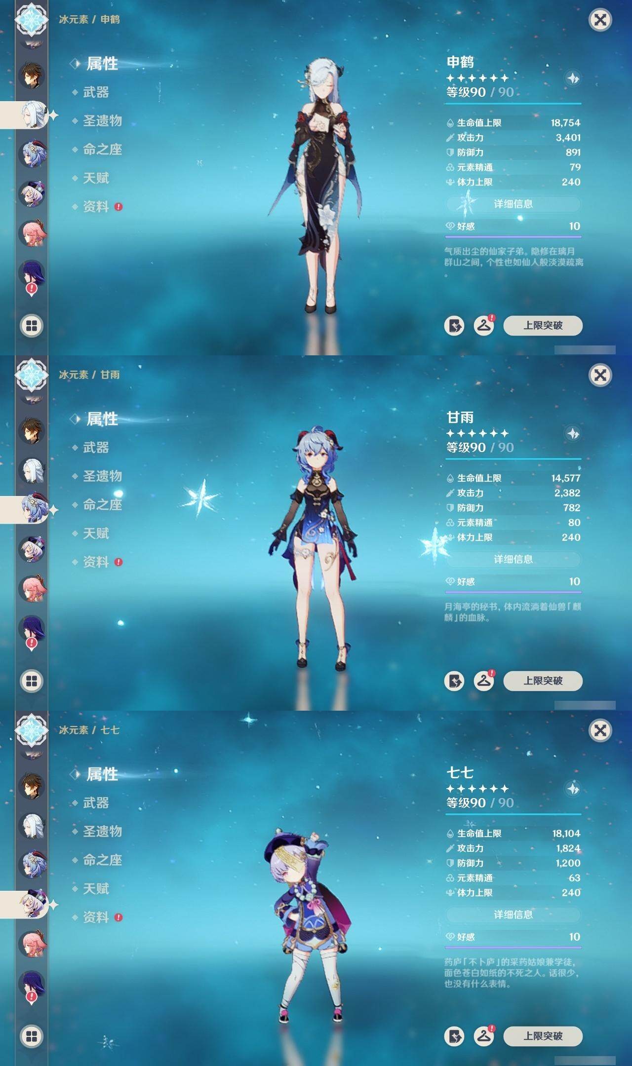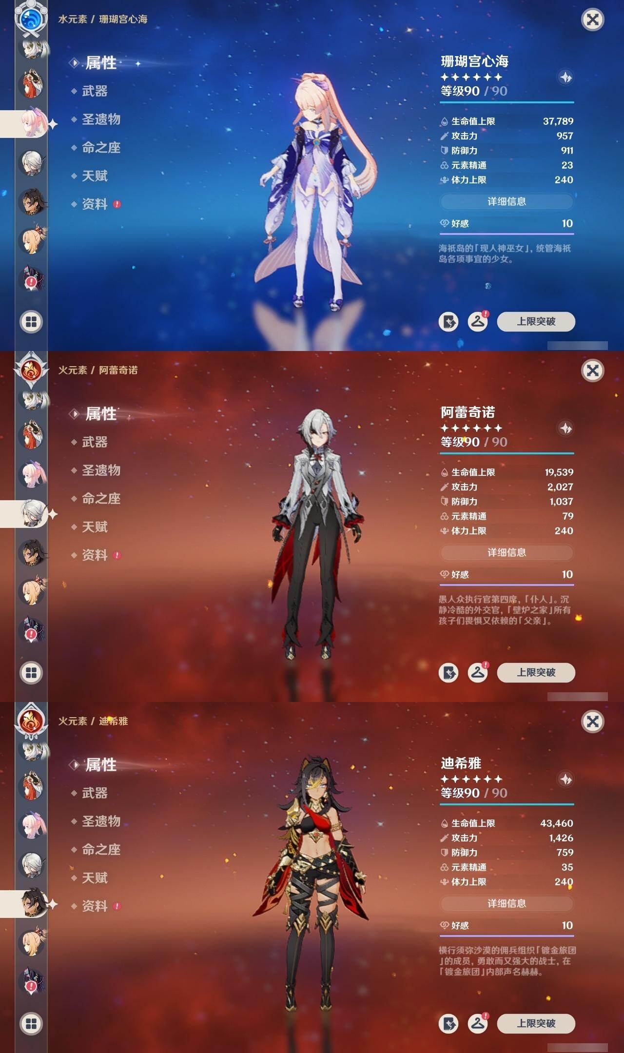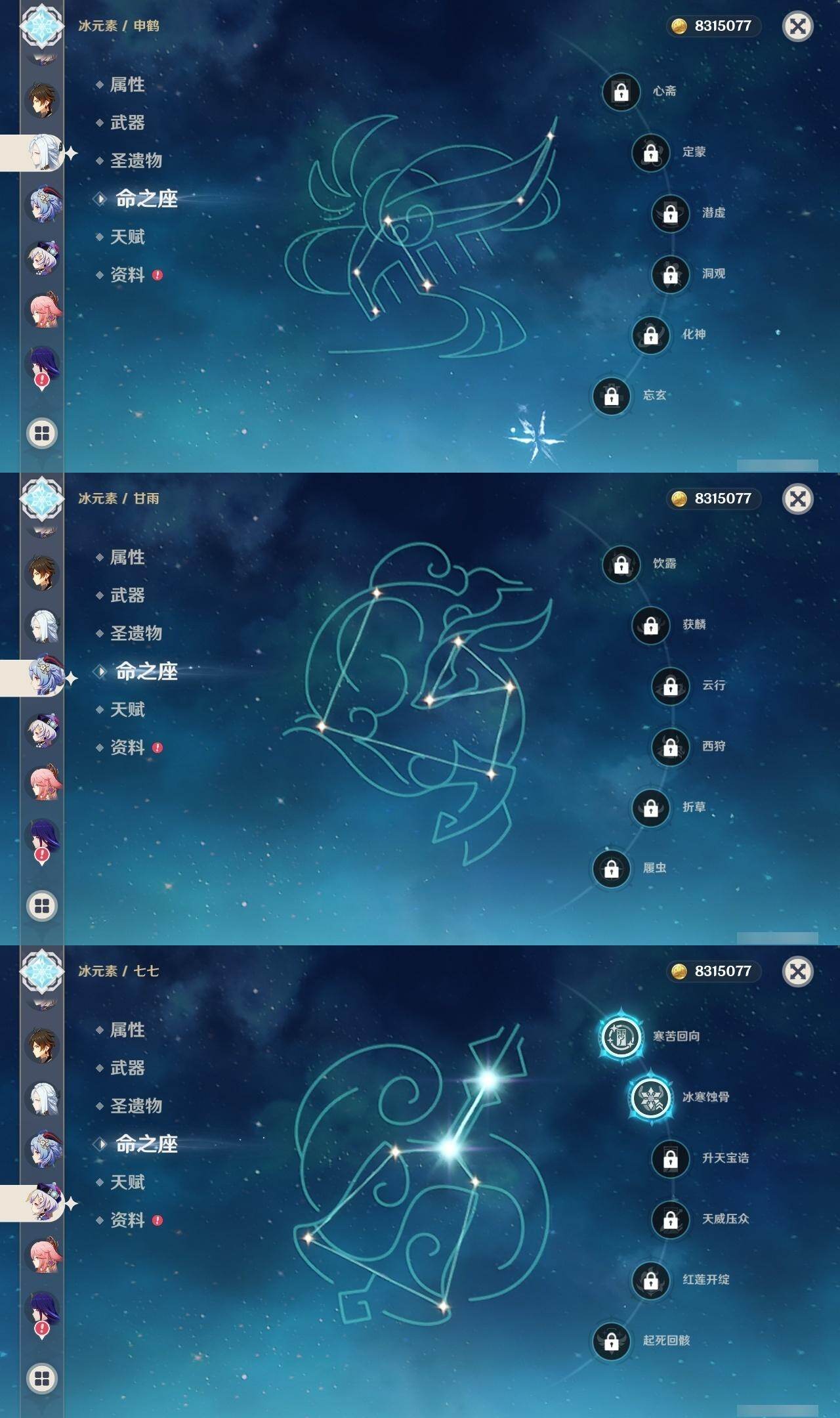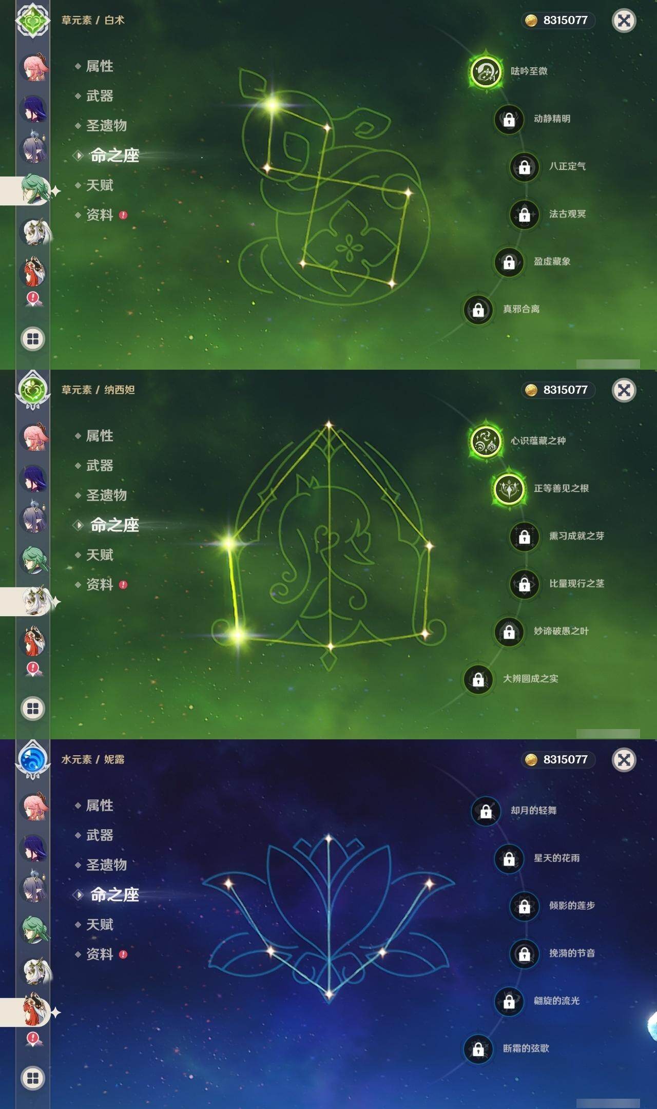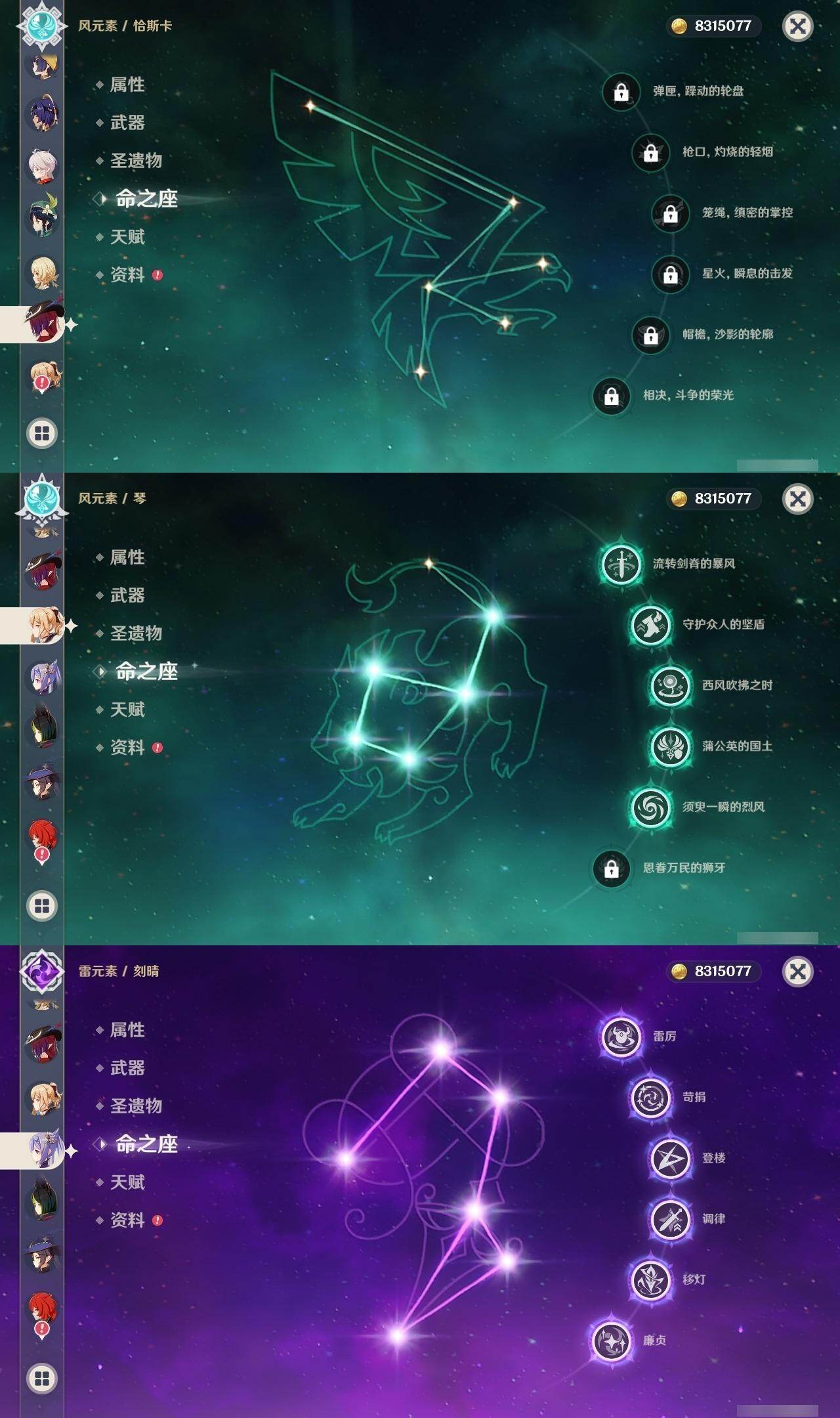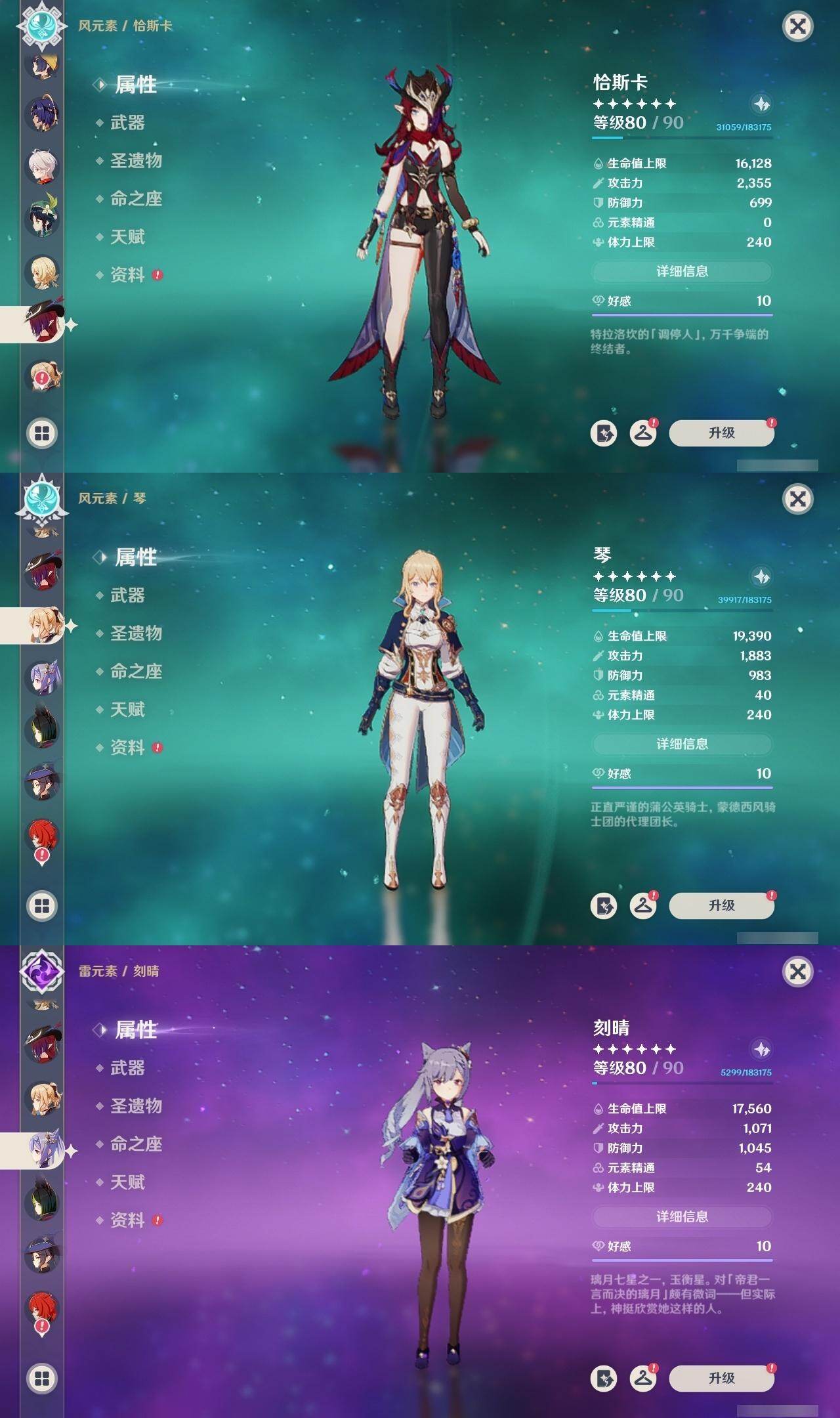 0命阿蕾奇诺,1命娜维娅,满命芙宁娜,1命白术,满命迪希雅,2命纳西妲,0命妮露,3命提纳里,3命夜兰,满命八重神子,0命申鹤,2命雷电将军,0命枫原万叶,0命钟离,0命甘雨,0命宵宫,0命温迪,0命阿贝多,0命珊瑚宫心海,满命刻晴,2命七七,5命琴,3命莫娜,2命迪卢克,0命希诺宁,0命恰斯卡,1命玛薇卡,0命菈乌玛,0命菲林斯,0命哥伦比娅,精1赤月之形,精1万世流涌大典,精1若水,精1薙草之稻光,精1飞雷之弦振,精1雾切之回光,精1无工之剑,精1四风原典,精1和璞鸢,精1天空之脊,精1天空之翼,精3阿莫斯之弓,精2天空之卷,精3风鹰剑,精2狼的末路,精1天空之傲