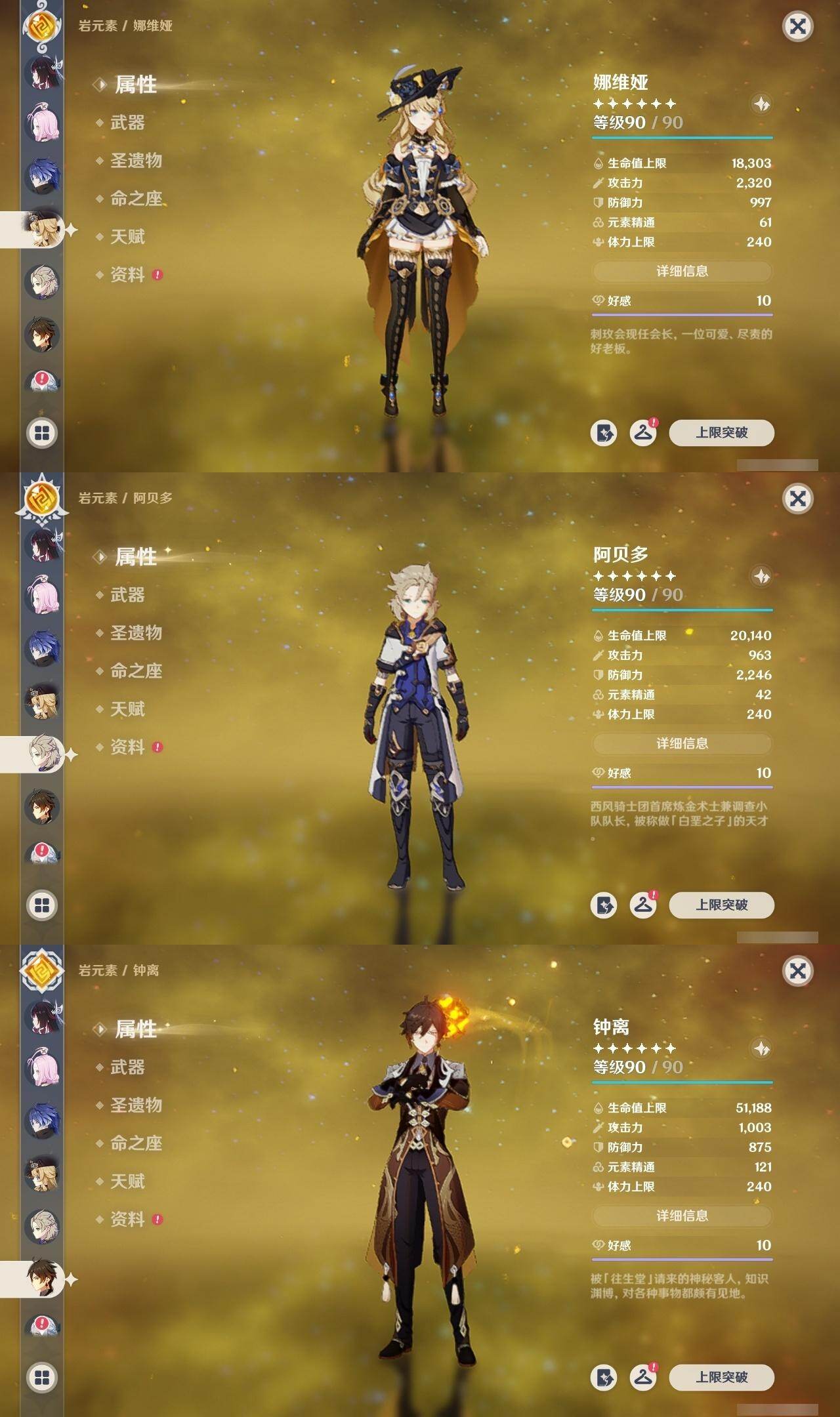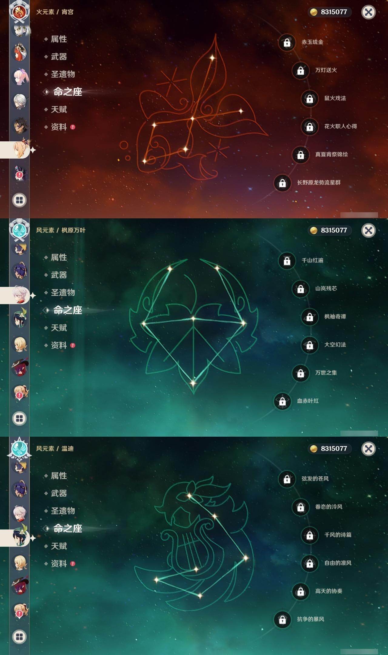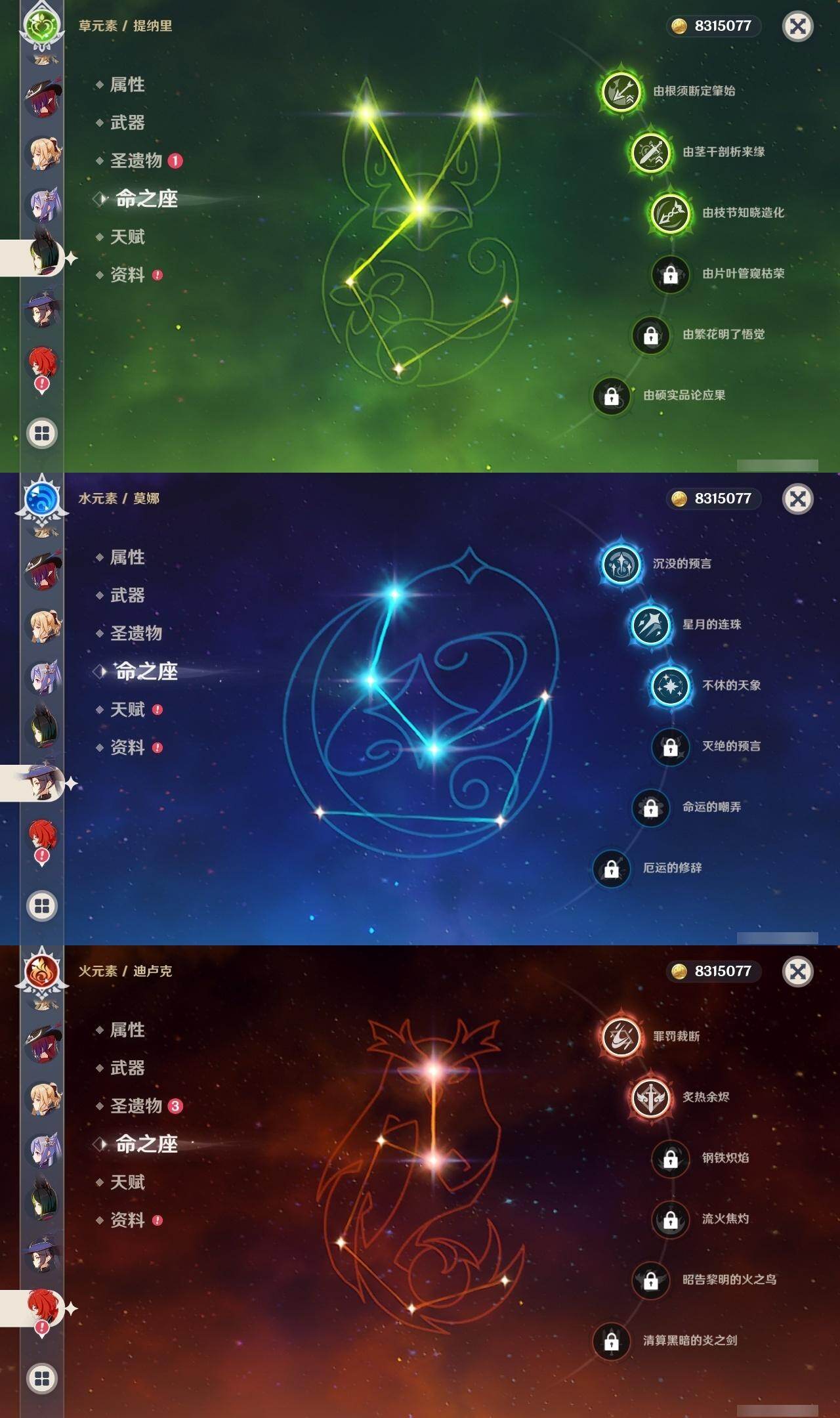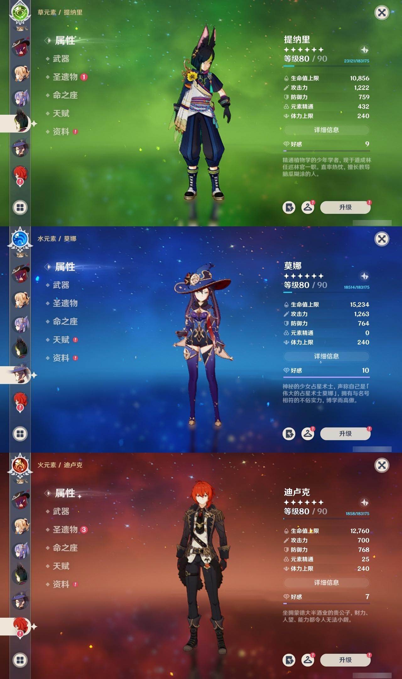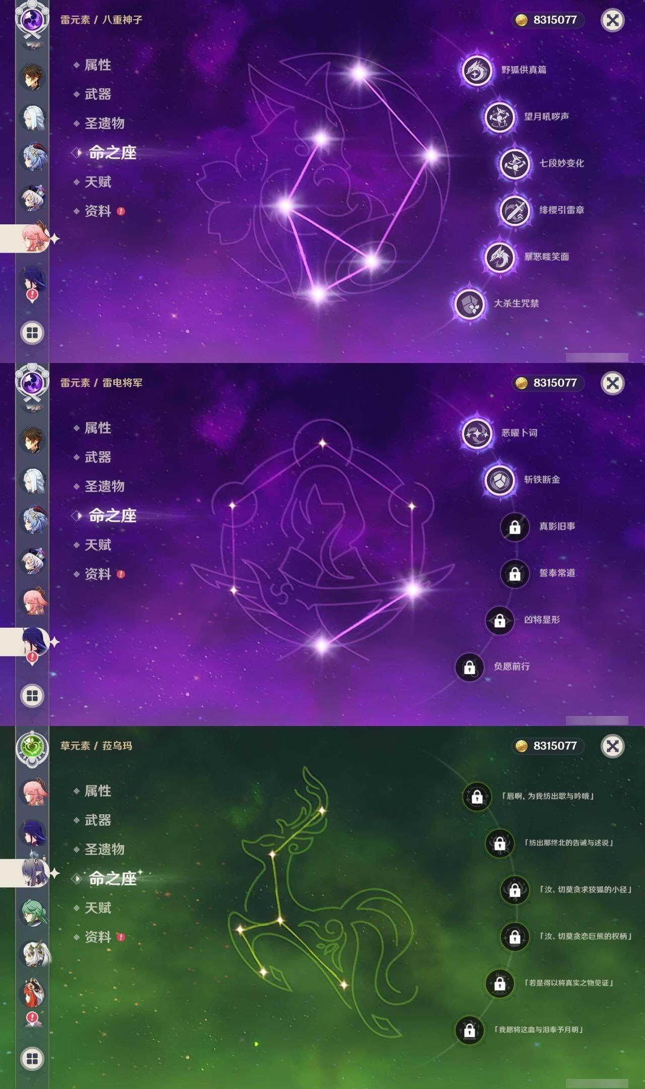 0命阿蕾奇诺,1命娜维娅,满命芙宁娜,1命白术,满命迪希雅,2命纳西妲,0命妮露,3命提纳里,3命夜兰,满命八重神子,0命申鹤,2命雷电将军,0命枫原万叶,0命钟离,0命甘雨,0命宵宫,0命温迪,0命阿贝多,0命珊瑚宫心海,满命刻晴,2命七七,5命琴,3命莫娜,2命迪卢克,0命希诺宁,0命恰斯卡,1命玛薇卡,0命菈乌玛,0命菲林斯,0命哥伦比娅,精1赤月之形,精1万世流涌大典,精1若水,精1薙草之稻光,精1飞雷之弦振,精1雾切之回光,精1无工之剑,精1四风原典,精1和璞鸢,精1天空之脊,精1天空之翼,精3阿莫斯之弓,精2天空之卷,精3风鹰剑,精2狼的末路,精1天空之傲