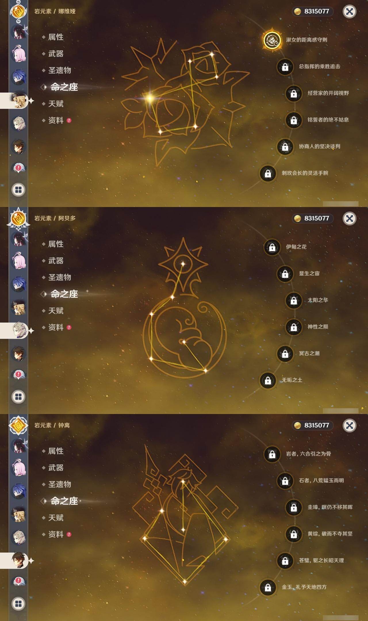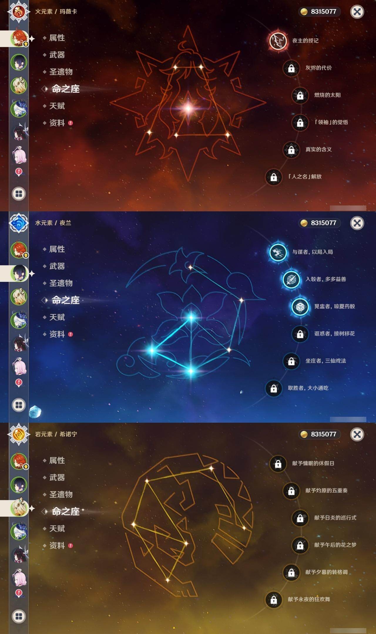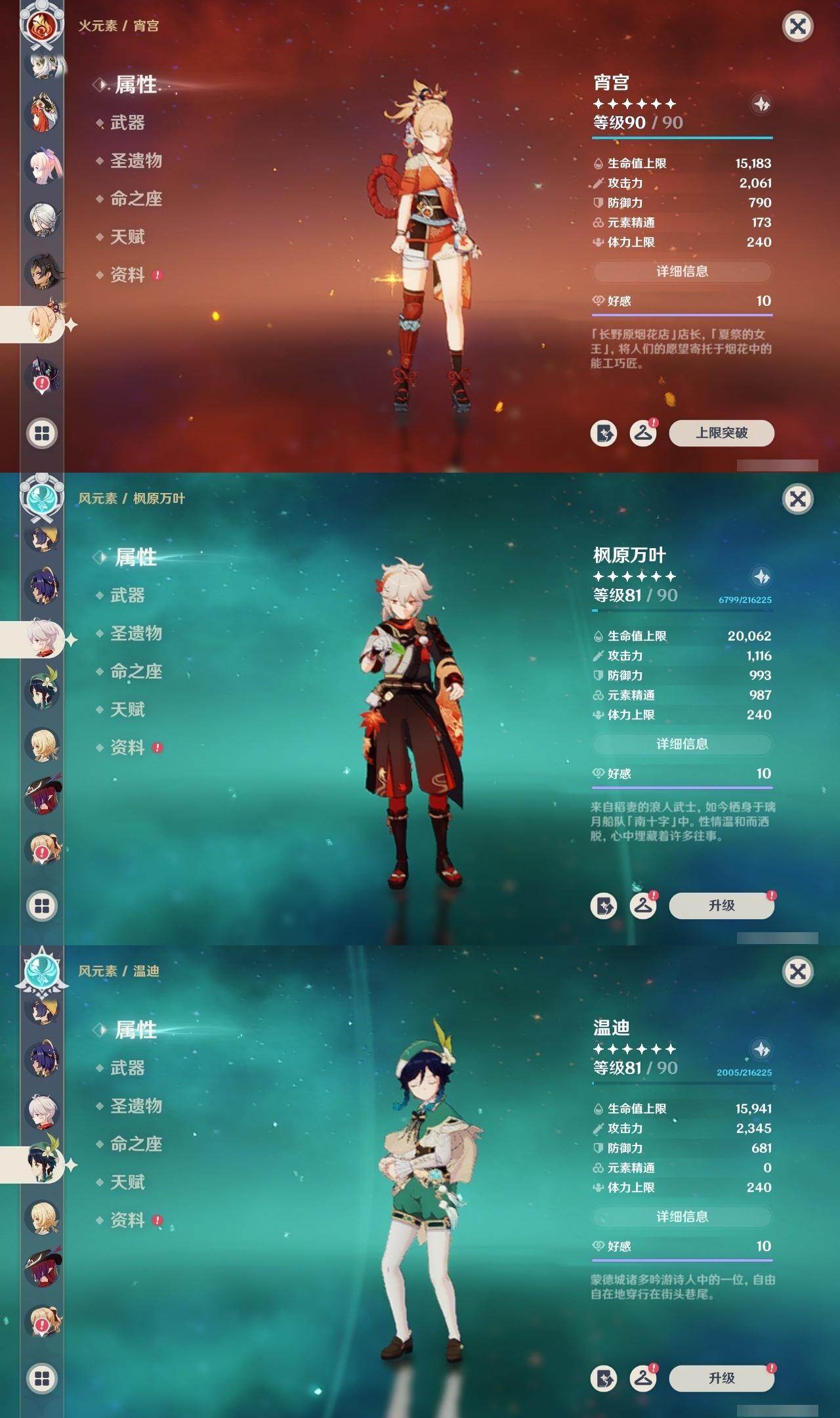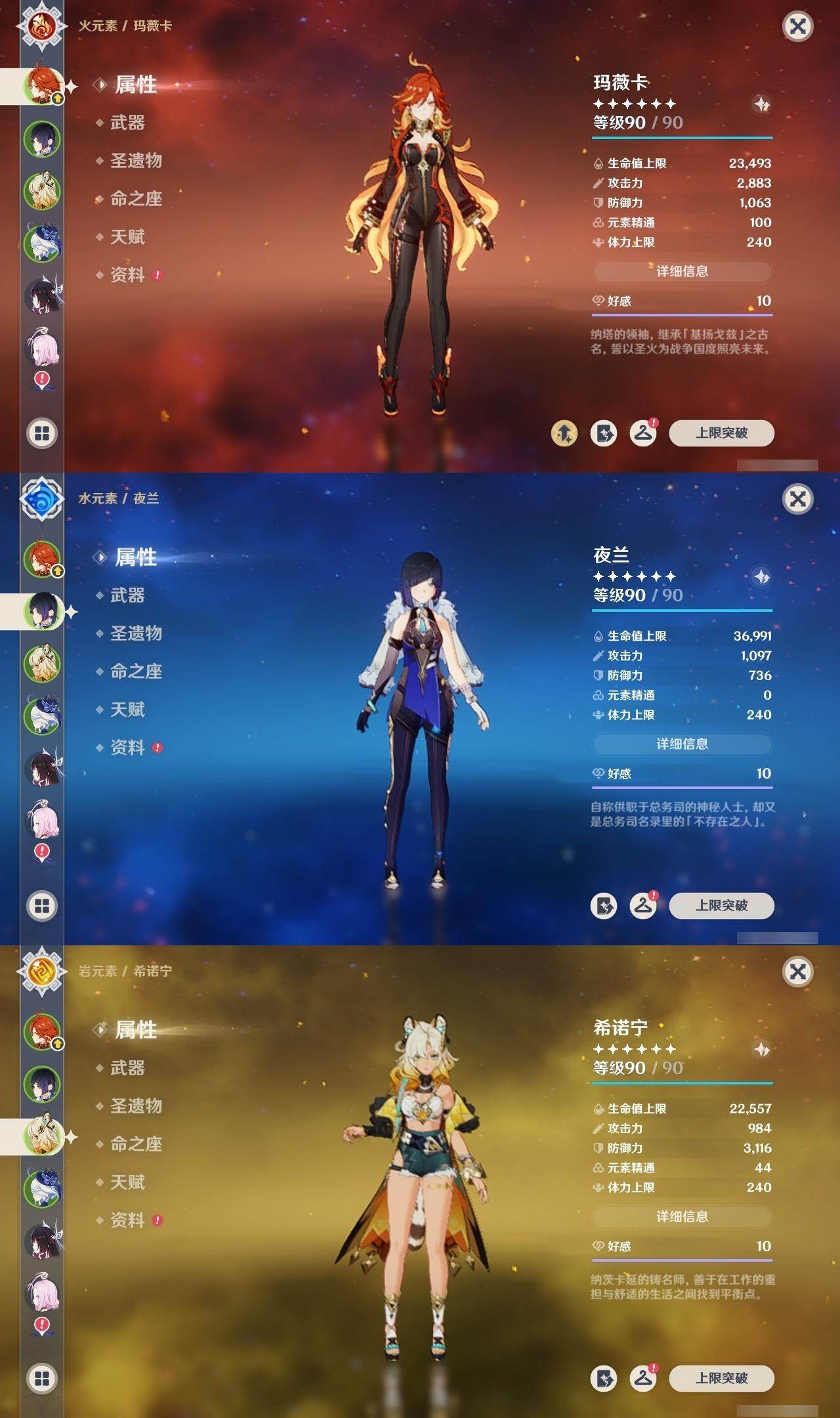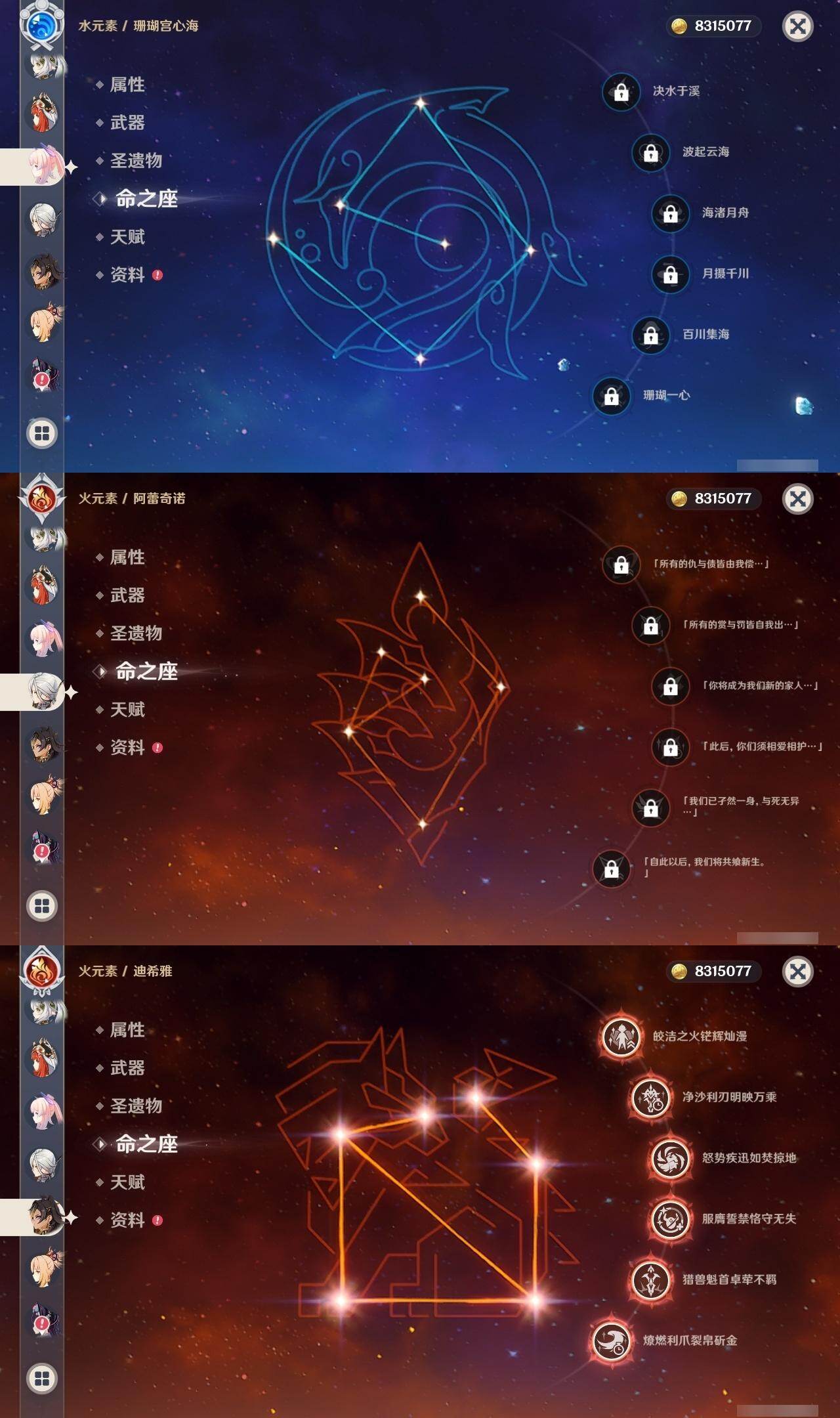 0命阿蕾奇诺,1命娜维娅,满命芙宁娜,1命白术,满命迪希雅,2命纳西妲,0命妮露,3命提纳里,3命夜兰,满命八重神子,0命申鹤,2命雷电将军,0命枫原万叶,0命钟离,0命甘雨,0命宵宫,0命温迪,0命阿贝多,0命珊瑚宫心海,满命刻晴,2命七七,5命琴,3命莫娜,2命迪卢克,0命希诺宁,0命恰斯卡,1命玛薇卡,0命菈乌玛,0命菲林斯,0命哥伦比娅,精1赤月之形,精1万世流涌大典,精1若水,精1薙草之稻光,精1飞雷之弦振,精1雾切之回光,精1无工之剑,精1四风原典,精1和璞鸢,精1天空之脊,精1天空之翼,精3阿莫斯之弓,精2天空之卷,精3风鹰剑,精2狼的末路,精1天空之傲