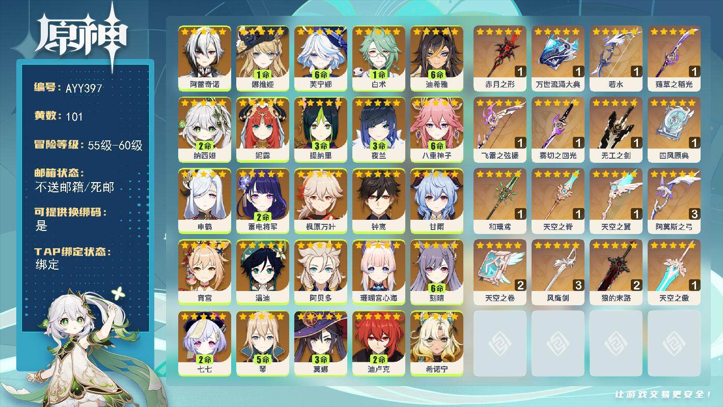 [16276527]60级/101黄/女主/30个五星角色/16个五星武器 0命阿蕾奇诺,1命娜维娅,满命芙宁娜,1命白术,满命迪希雅,2命纳西妲,0命妮露,3命提纳里,3命夜兰,满命八重神子,0命申鹤,2命雷电将军,0命枫原万叶,0命钟离,0命甘雨,0命宵宫,0命温迪,0命阿贝多,0命珊瑚宫心海,满命刻晴,2命七七,5命琴,3命莫娜,2命迪卢克,0命希诺宁,0命恰斯卡,1命玛薇卡,0命菈乌玛,0命菲林斯,0命哥伦比娅,精1赤月之形,精1万世流涌大典,精1若水,精1薙草之稻光,精1飞雷之弦振,精1雾切之回光,精1无工之剑,精1四风原典,精1和璞鸢,精1天空之脊,精1天空之翼,精3阿莫斯之弓,精2天空之卷,精3风鹰剑,精2狼的末路,精1天空之傲