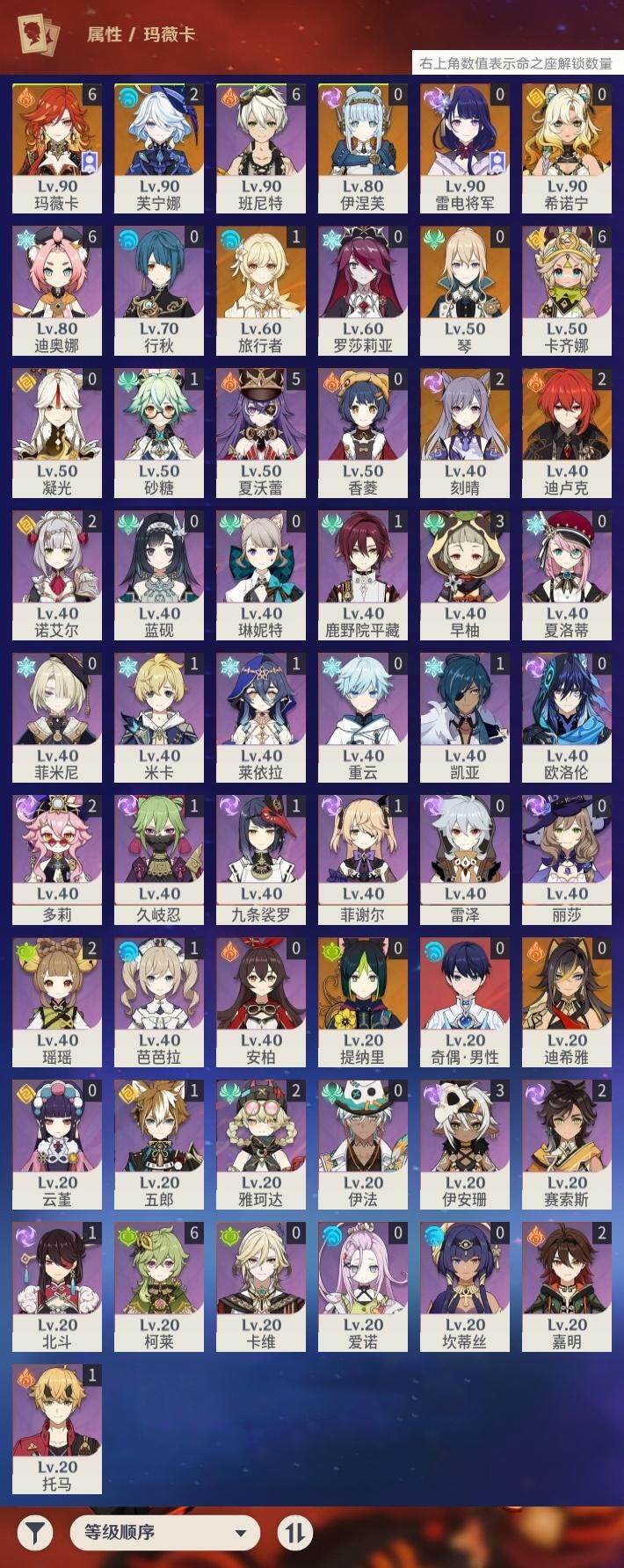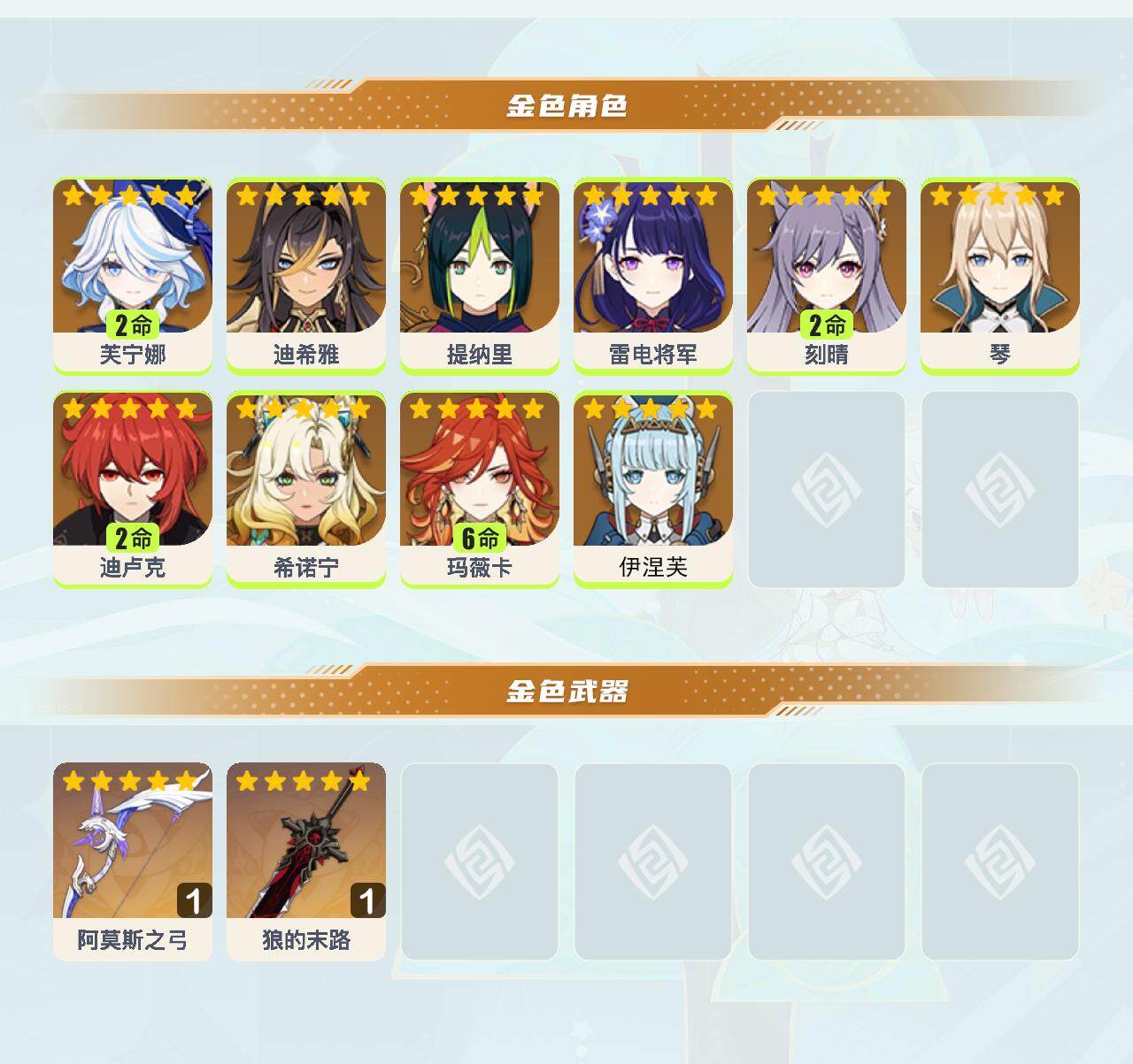 2命芙宁娜,0命迪希雅,0命提纳里,0命雷电将军,2命刻晴,0命琴,2命迪卢克,0命希诺宁,满命玛薇卡,0命伊涅芙,精1阿莫斯之弓,精1狼的末路