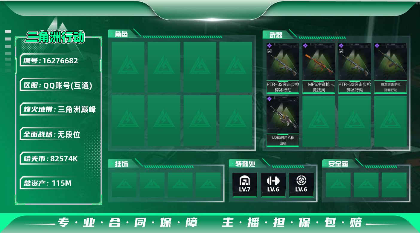 [16276682]【特价出售/店主推荐】 115m总资产-82574k哈伏币-60烽火等级-三角洲巅峰-1战场等级-无军衔 【近战皮肤】:近战-黑鹰 【史诗外观】:PTR-32突击步枪-碎冰行动,腾龙突击步枪-猎鳄行动,MP5冲锋枪-竞技风,M250通用机枪-囚徒 【稀有外观】:沙漠之鹰-天际线,M700狙击步枪-旧梦,AKM突击步枪-肃杀,SCAR-H战斗步枪-荣耀列队,K437突击步枪-生存指令,MK47突击步枪-精英联盟,SMG-45-行动开启 【普通外观】:R93狙击步枪-凶兽,AUG突击步枪-浅蓝涂装,M7战斗步枪-红色涂装,UZI冲锋枪-海色,QCQ171冲锋枪-三角洲力量,M1014霰弹枪-高雅黑,沙漠之鹰-海浪,93R-三角洲力量 【军牌】:军牌-静谧时光,军牌-永恒,军牌-信誉优秀,军牌-小心鳄鱼 【挂饰】:挂饰-崩岩重炮*3,挂饰-暗行哨兵*4
