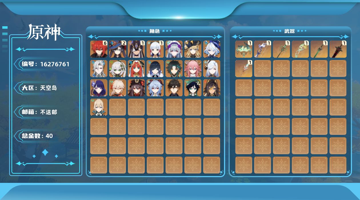 0命娜维娅,0命芙宁娜,0命那维莱特,0命迪希雅,0命纳西妲,0命妮露,1命赛诺,0命夜兰,0命八重神子,0命申鹤,0命雷电将军,0命枫原万叶,1命神里绫华,0命钟离,0命胡桃,0命甘雨,0命魈,0命温迪,0命琴,2命莫娜,满命迪卢克,0命梦见月瑞希,精1鹤鸣余音,精1猎人之径,精1若水,精1磐岩结绿,精1和璞鸢,精1天空之脊,精1狼的末路