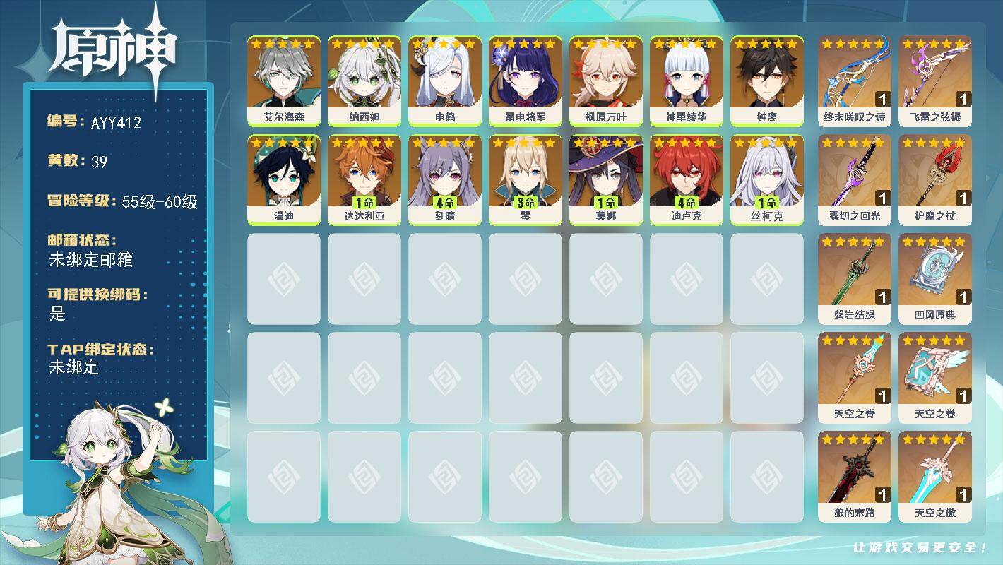 [16276786]60级/39黄/男主/14个五星角色/11个五星武器 0命艾尔海森,0命纳西妲,0命申鹤,0命雷电将军,0命枫原万叶,0命神里绫华,0命钟离,0命温迪,1命达达利亚,4命刻晴,3命琴,1命莫娜,4命迪卢克,1命丝柯克,精1终末嗟叹之诗,精1飞雷之弦振,精1雾切之回光,精1护摩之杖,精1磐岩结绿,精1四风原典,精1天空之脊,精1天空之卷,精1狼的末路,精1天空之傲