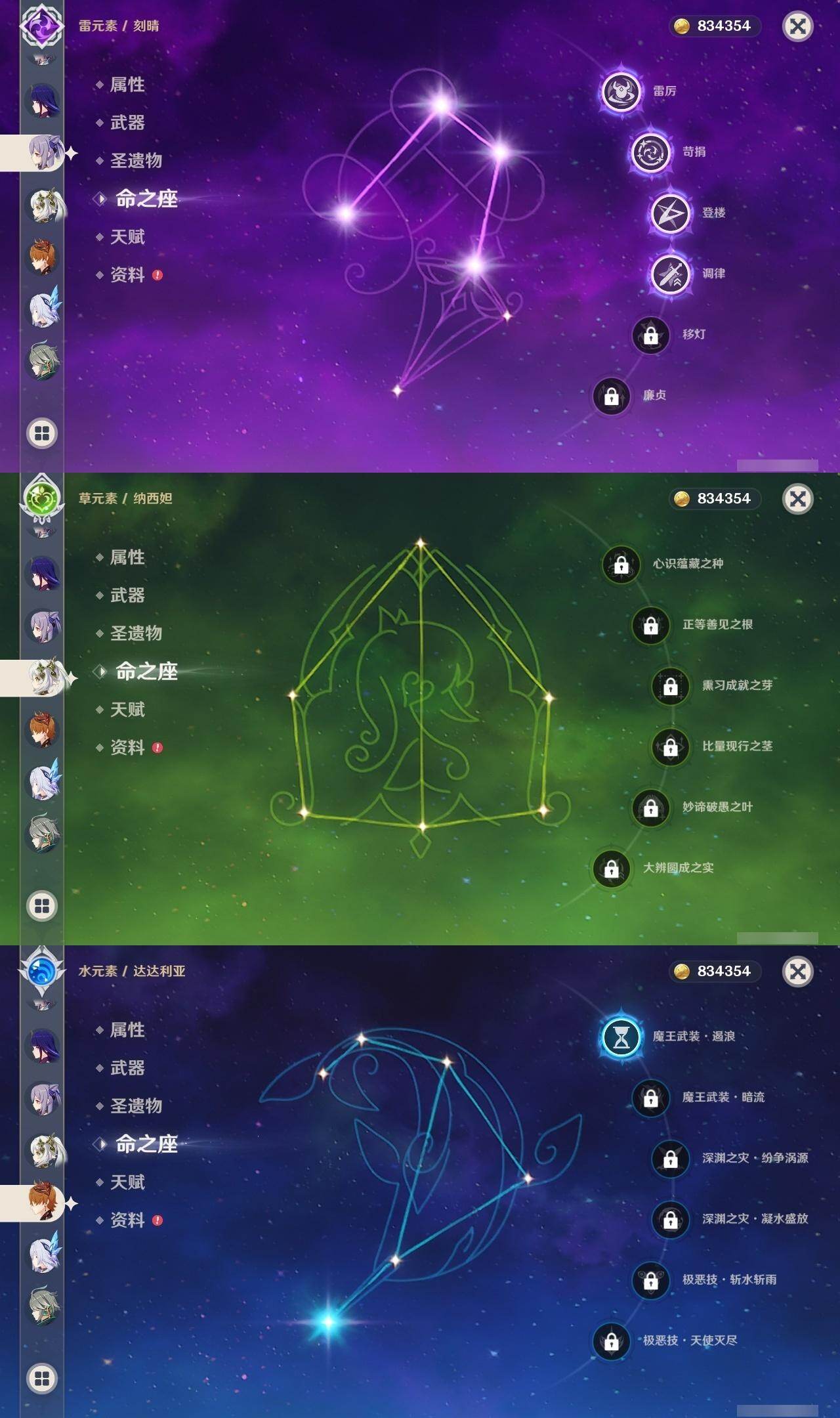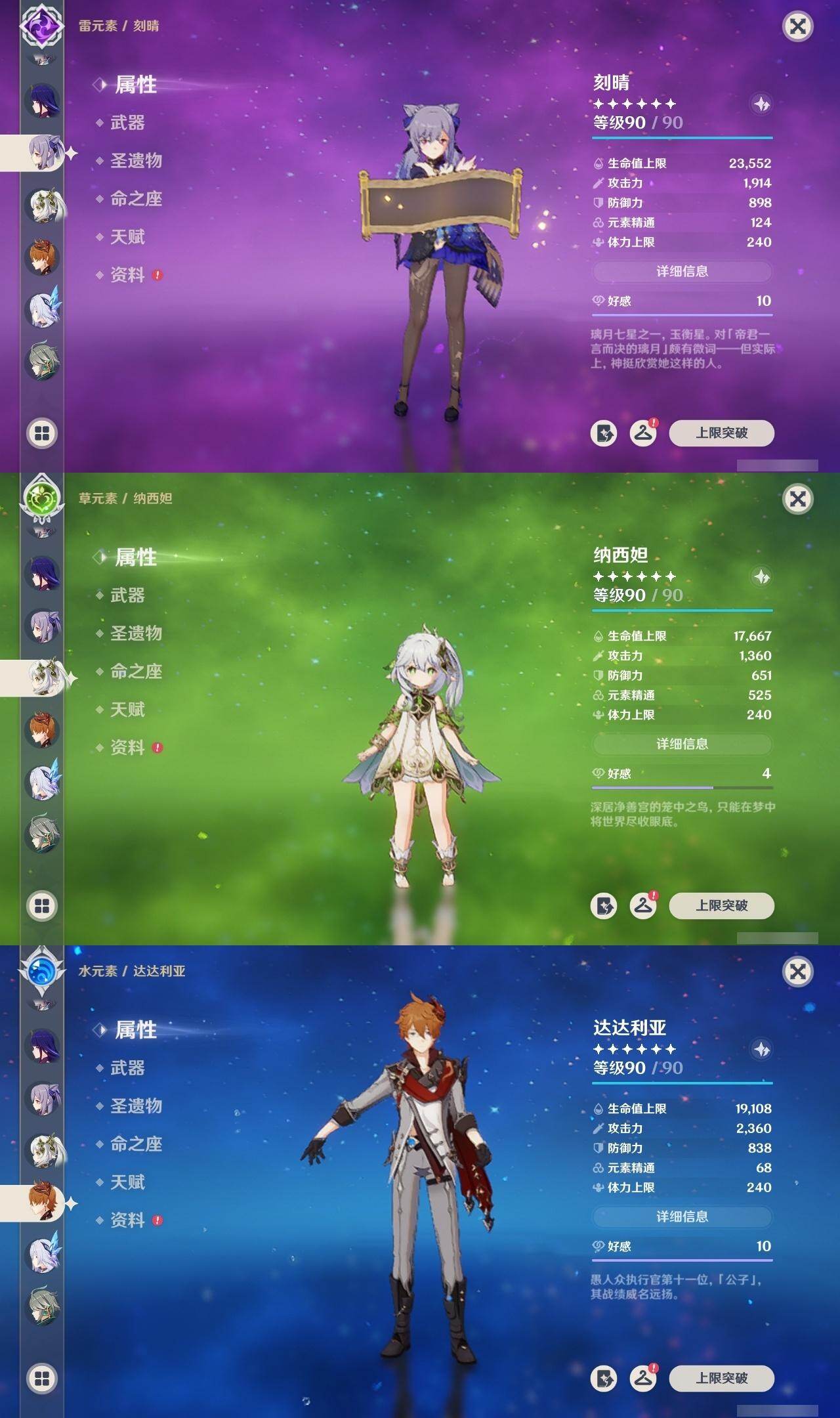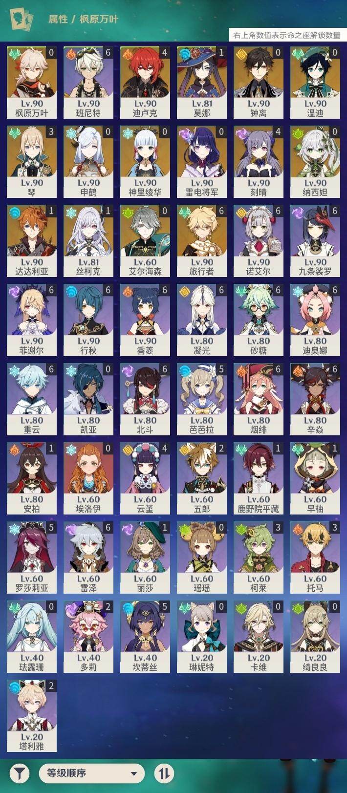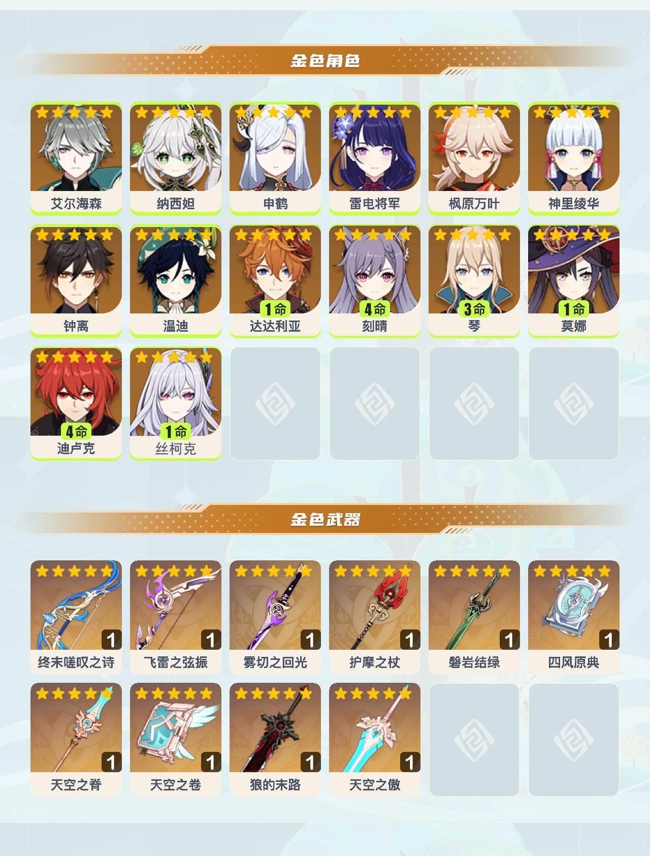 0命艾尔海森,0命纳西妲,0命申鹤,0命雷电将军,0命枫原万叶,0命神里绫华,0命钟离,0命温迪,1命达达利亚,4命刻晴,3命琴,1命莫娜,4命迪卢克,1命丝柯克,精1终末嗟叹之诗,精1飞雷之弦振,精1雾切之回光,精1护摩之杖,精1磐岩结绿,精1四风原典,精1天空之脊,精1天空之卷,精1狼的末路,精1天空之傲