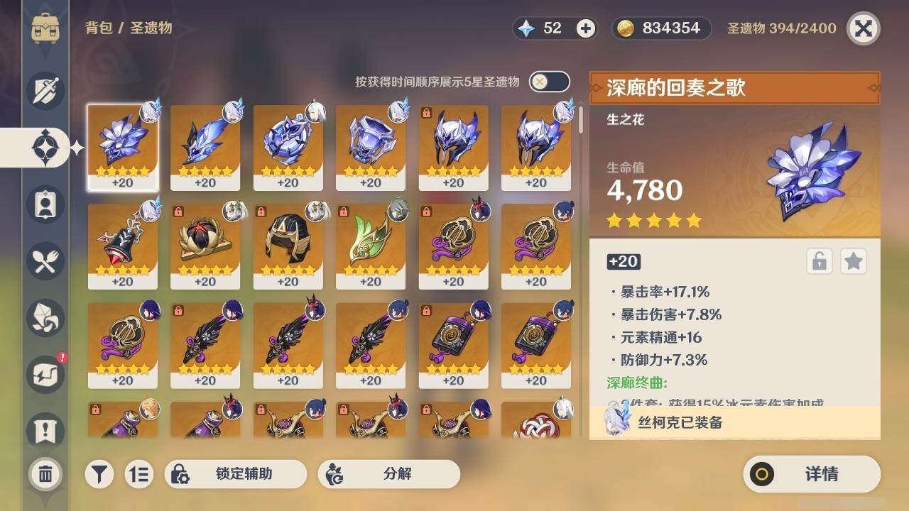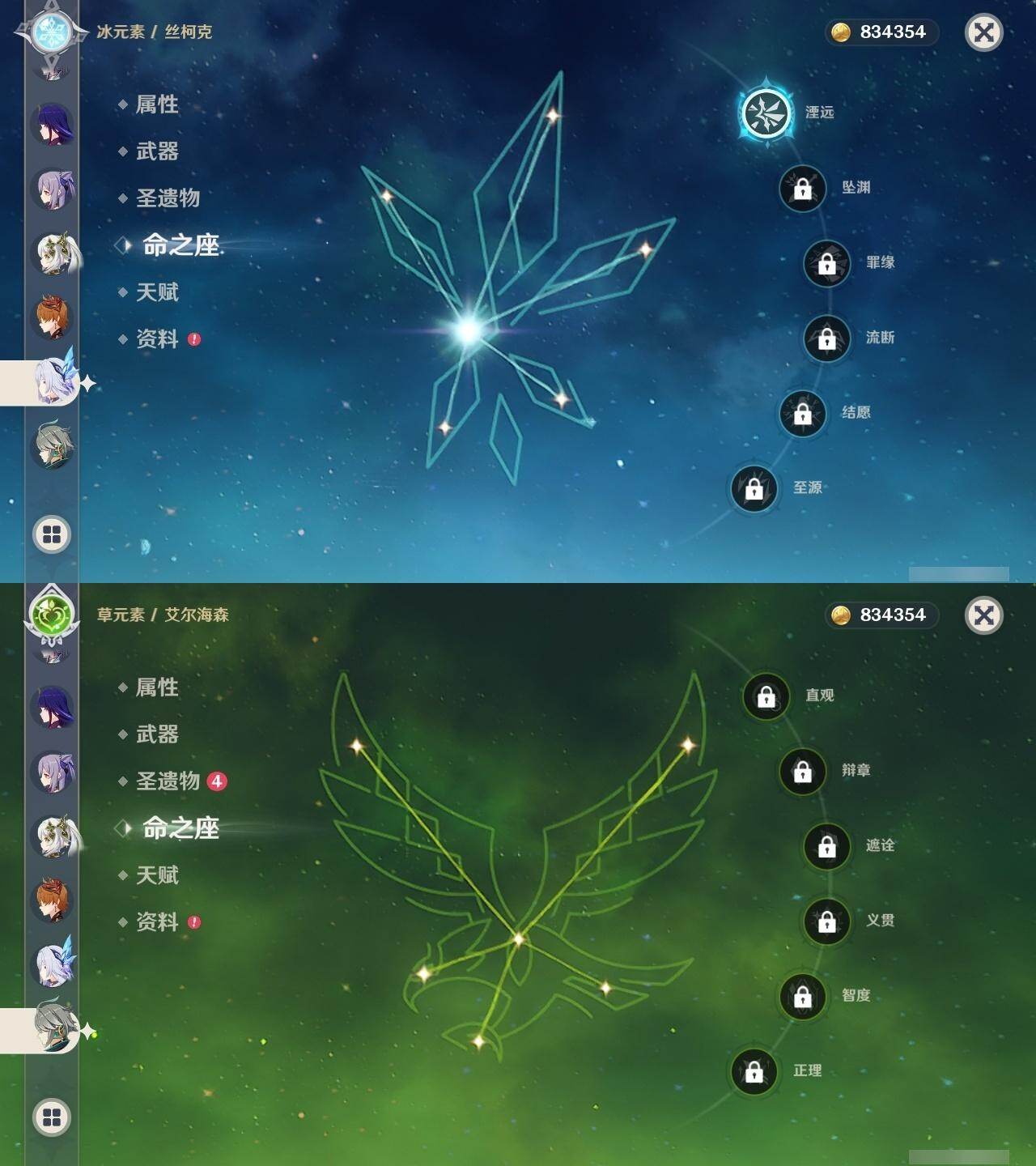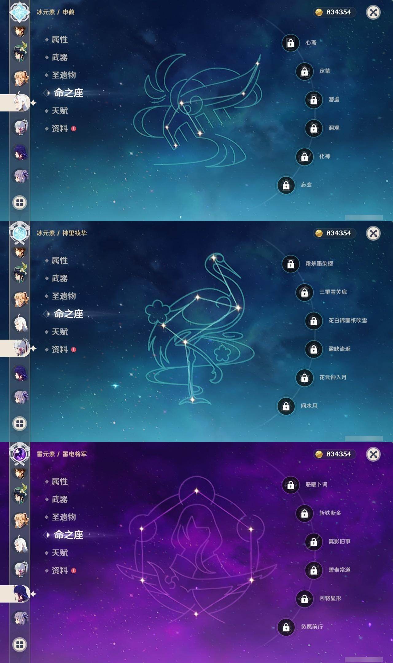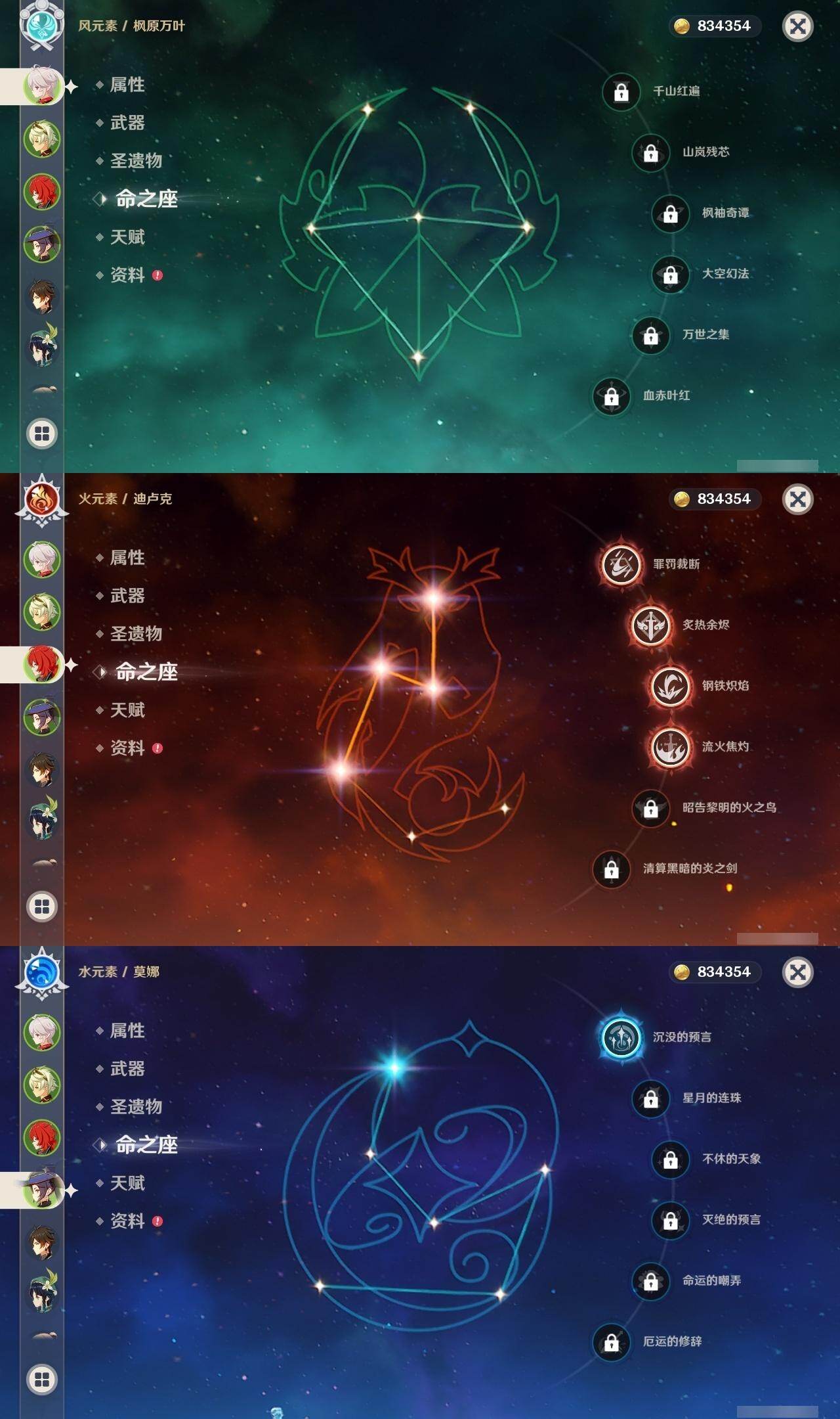 0命艾尔海森,0命纳西妲,0命申鹤,0命雷电将军,0命枫原万叶,0命神里绫华,0命钟离,0命温迪,1命达达利亚,4命刻晴,3命琴,1命莫娜,4命迪卢克,1命丝柯克,精1终末嗟叹之诗,精1飞雷之弦振,精1雾切之回光,精1护摩之杖,精1磐岩结绿,精1四风原典,精1天空之脊,精1天空之卷,精1狼的末路,精1天空之傲