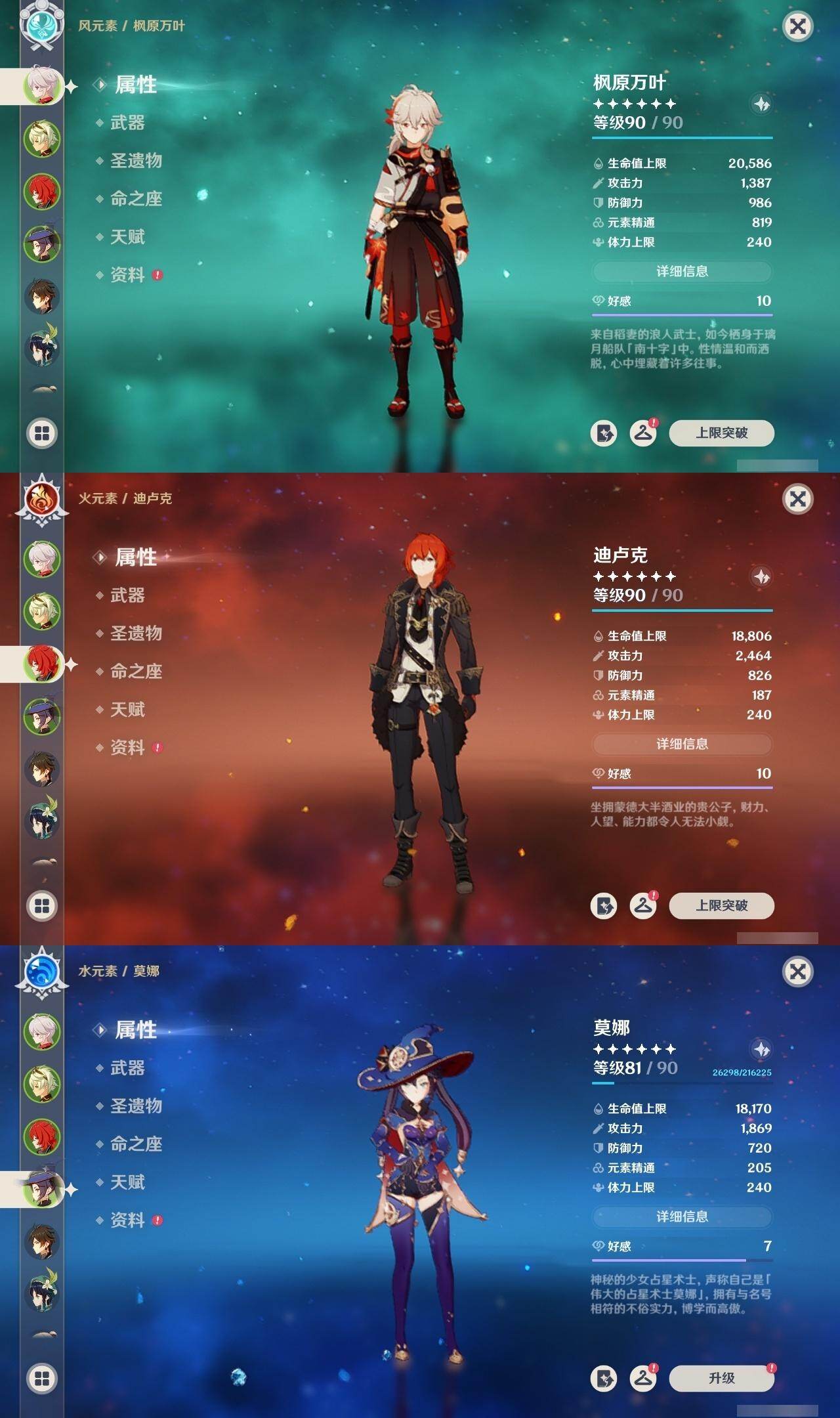 枫原万叶,迪卢克,莫娜,钟离,温迪,琴,申鹤,神里凌华,雷电将军,刻晴,达达利亚