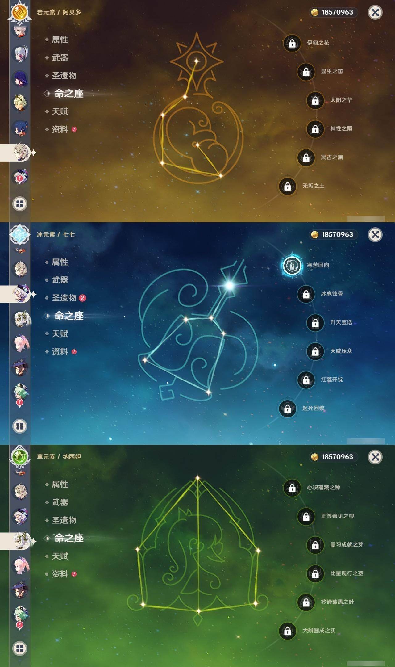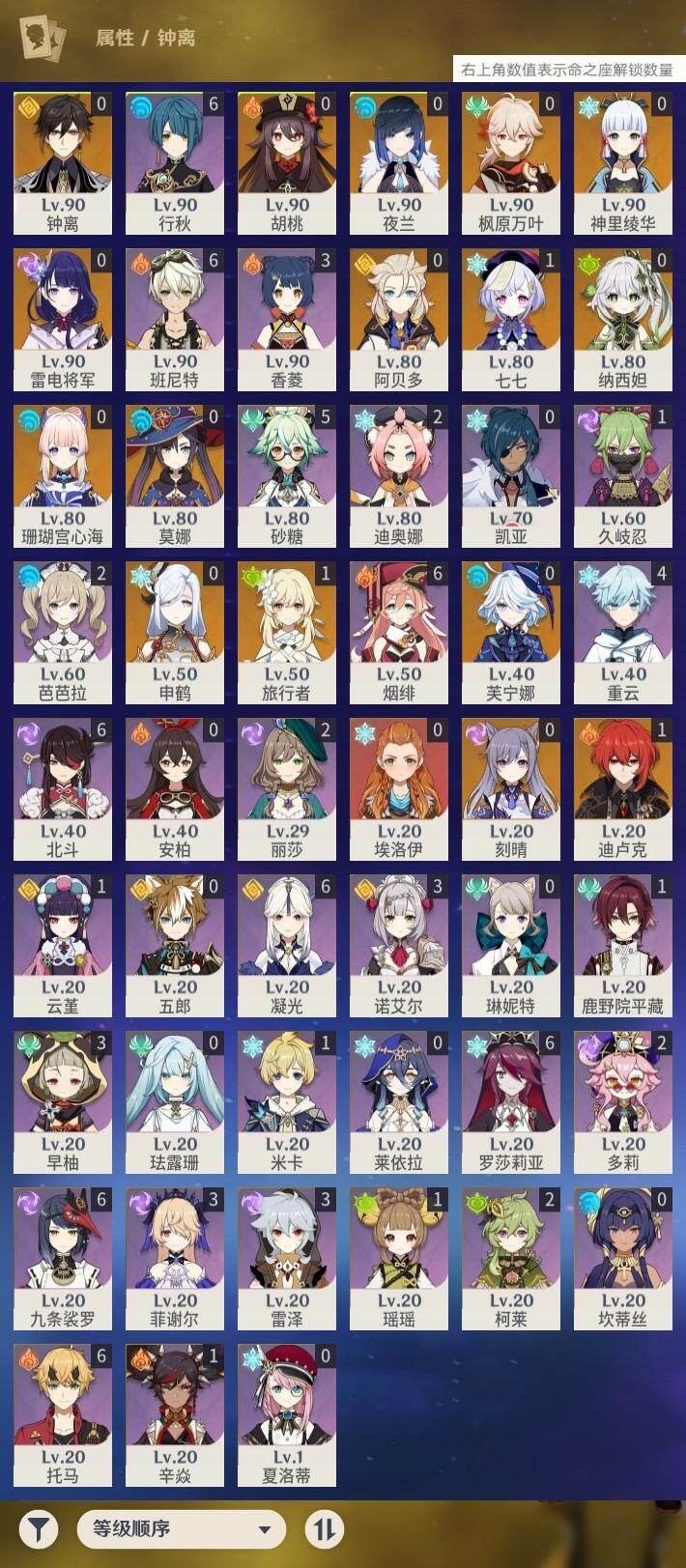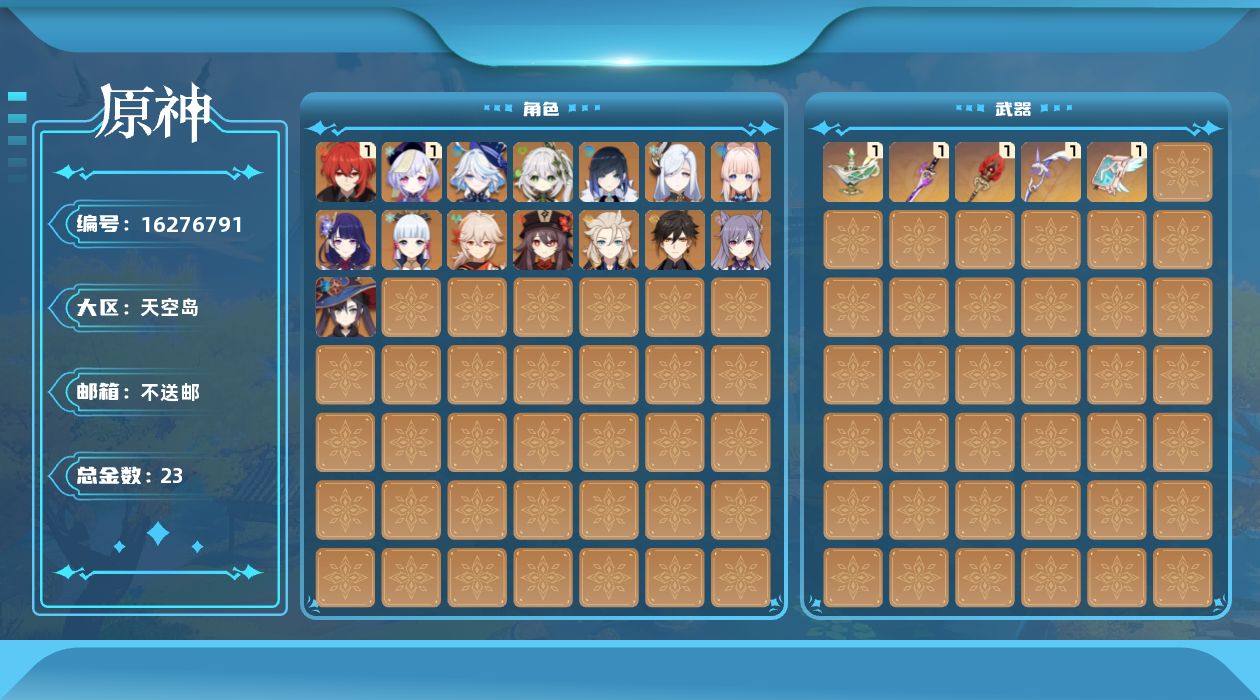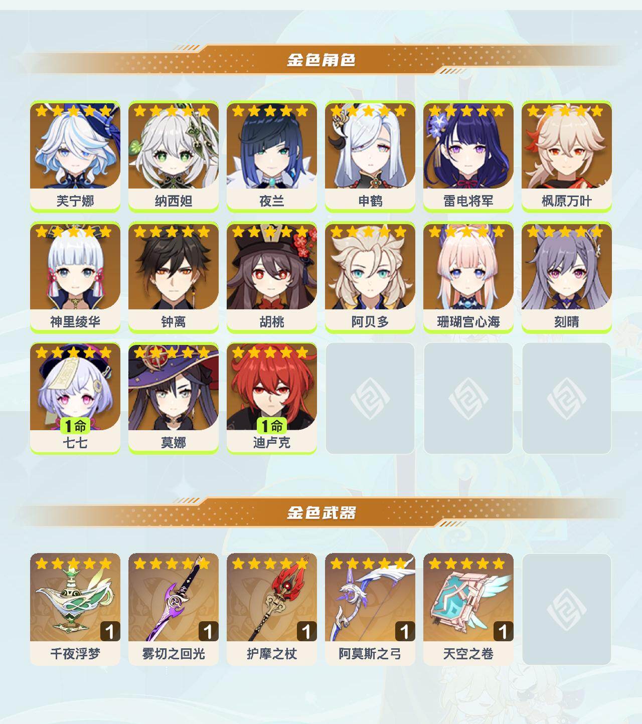0命芙宁娜,0命纳西妲,0命夜兰,0命申鹤,0命雷电将军,0命枫原万叶,0命神里绫华,0命钟离,0命胡桃,0命阿贝多,0命珊瑚宫心海,0命刻晴,1命七七,0命莫娜,1命迪卢克,精1千夜浮梦,精1雾切之回光,精1护摩之杖,精1阿莫斯之弓,精1天空之卷