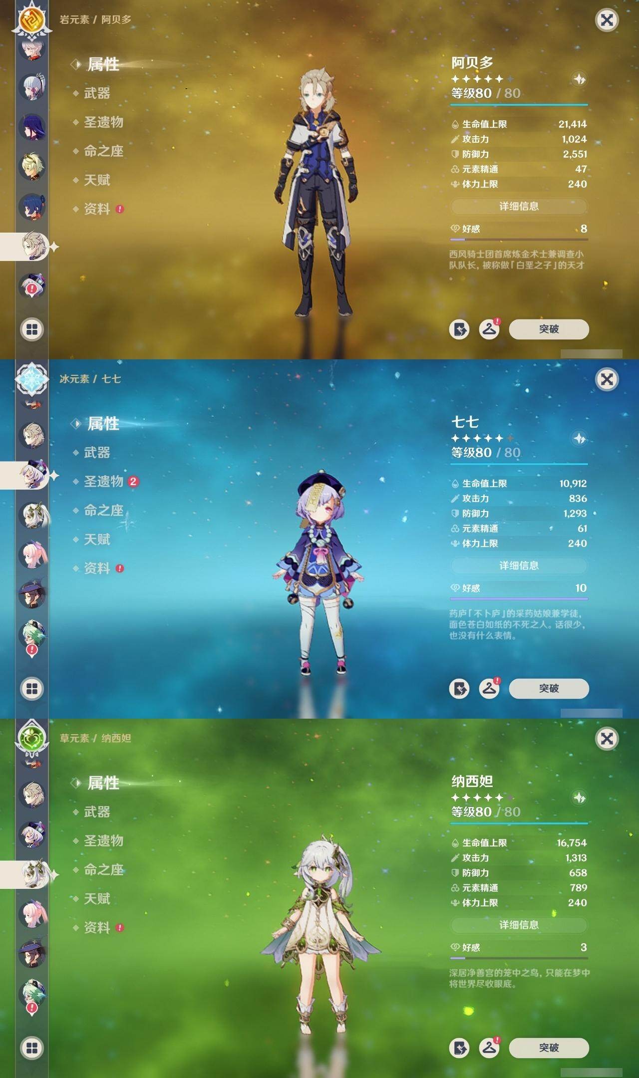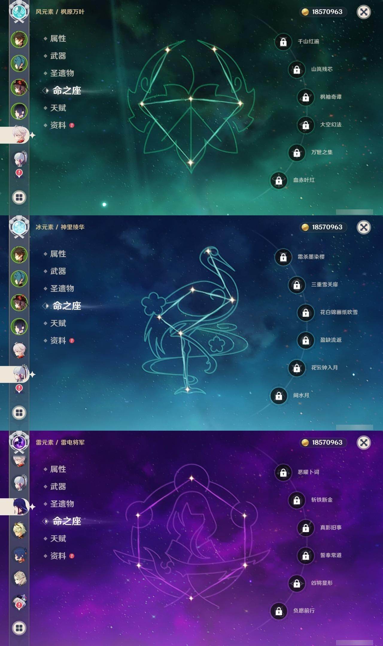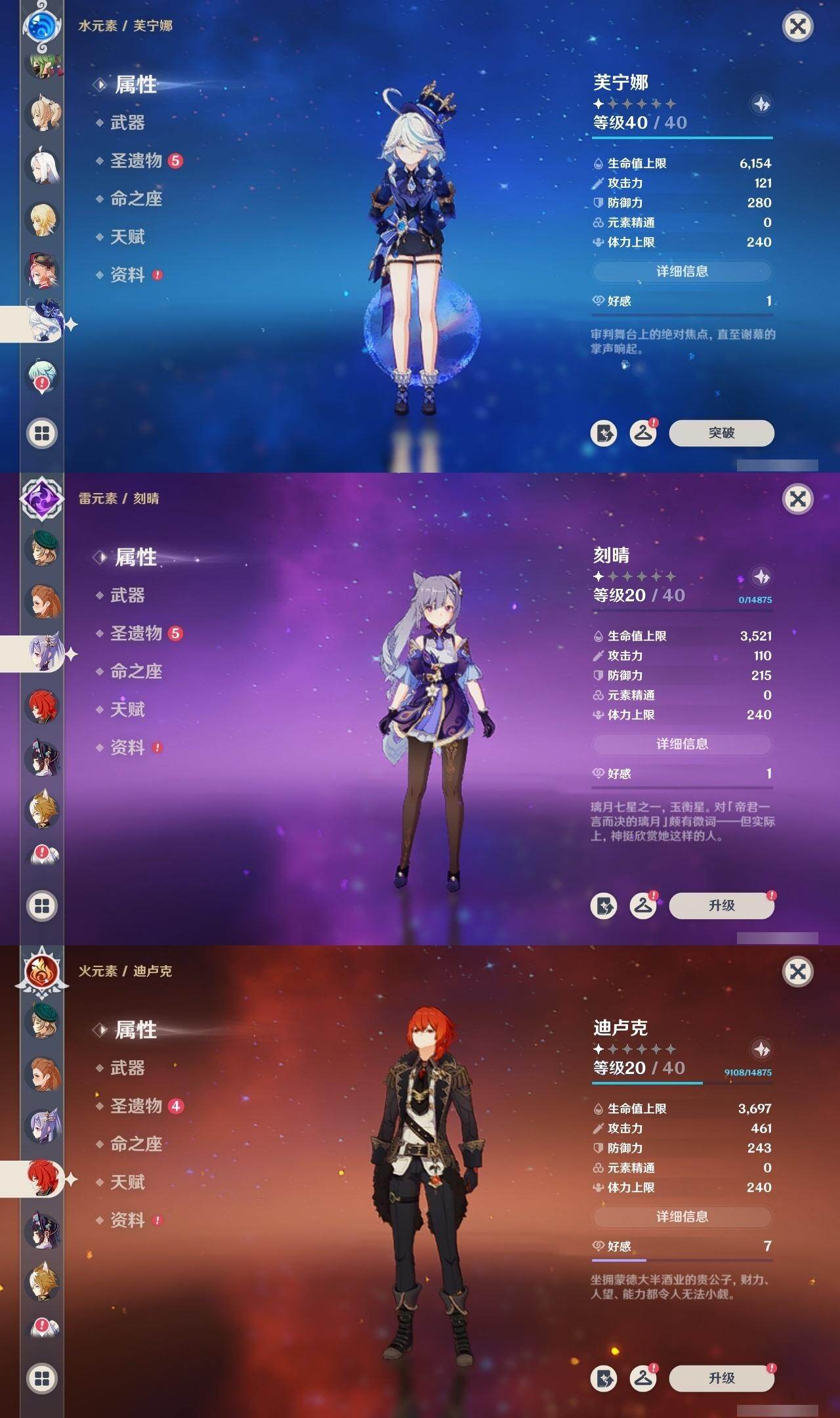 0命芙宁娜,0命纳西妲,0命夜兰,0命申鹤,0命雷电将军,0命枫原万叶,0命神里绫华,0命钟离,0命胡桃,0命阿贝多,0命珊瑚宫心海,0命刻晴,1命七七,0命莫娜,1命迪卢克,精1千夜浮梦,精1雾切之回光,精1护摩之杖,精1阿莫斯之弓,精1天空之卷