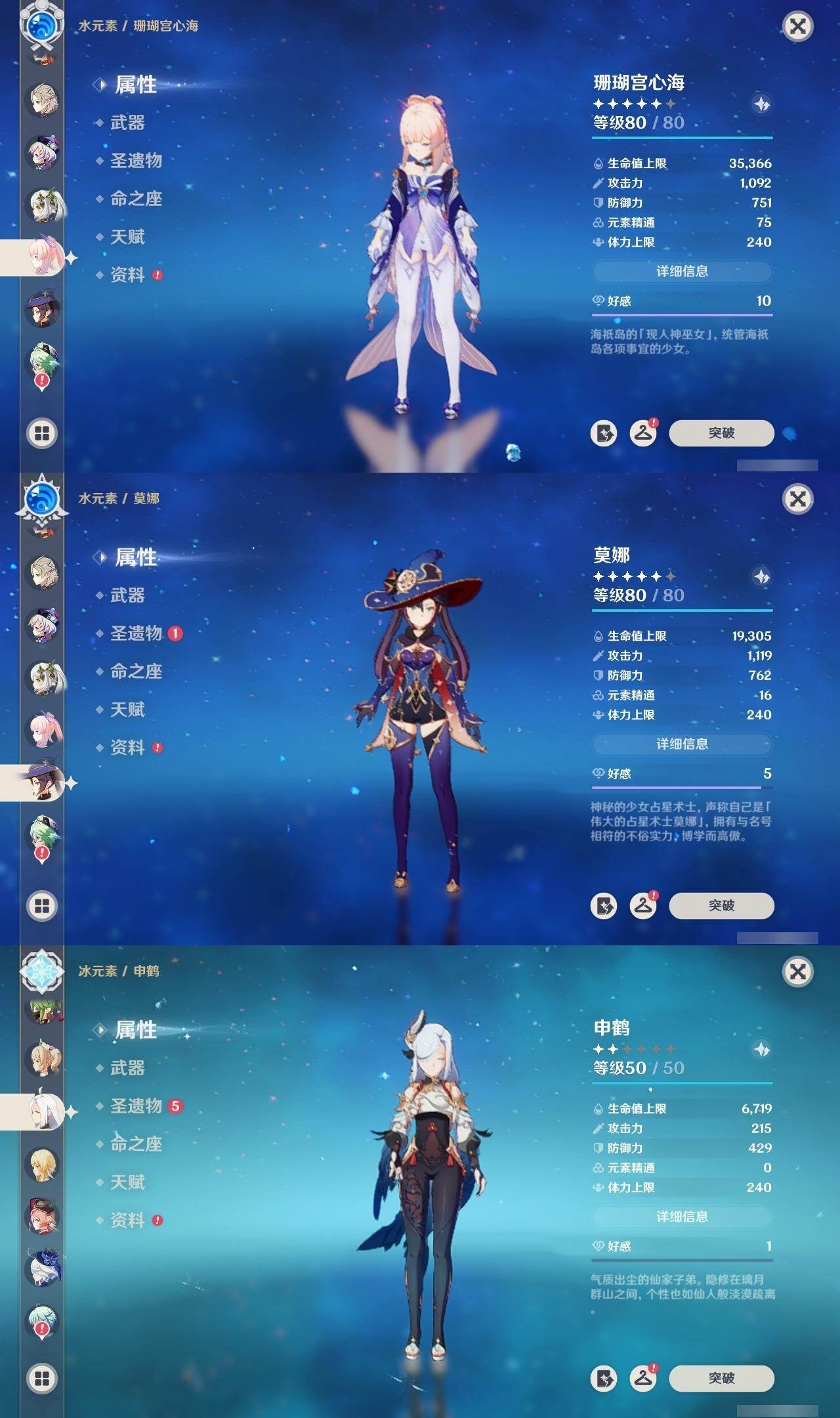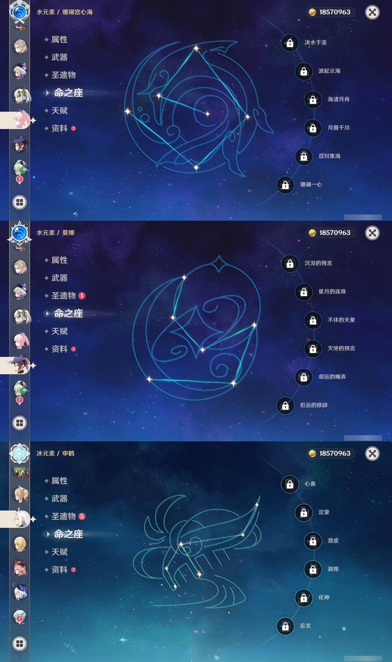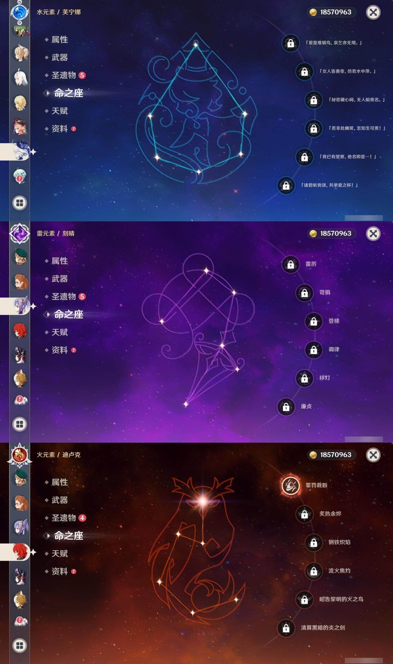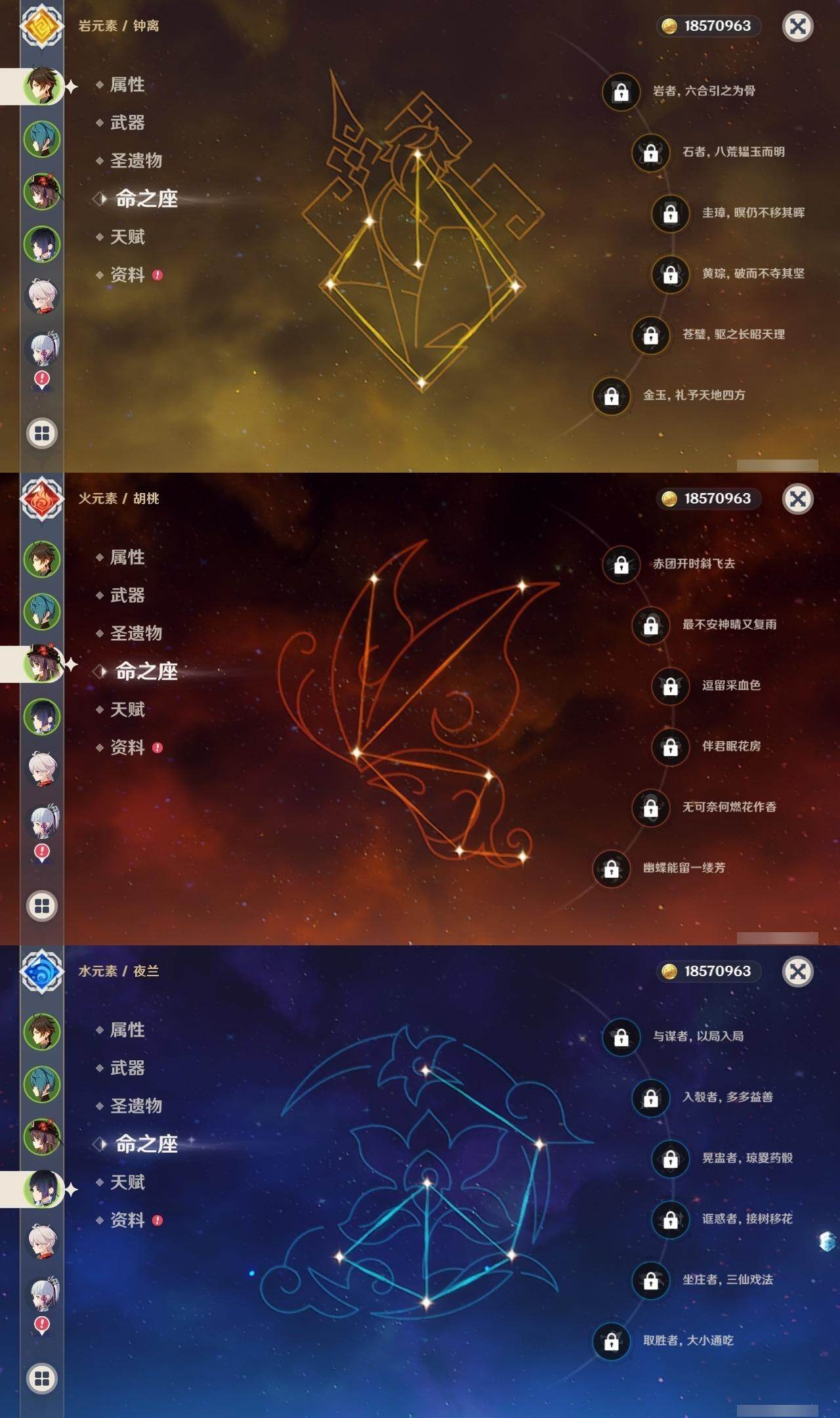0命芙宁娜,0命纳西妲,0命夜兰,0命申鹤,0命雷电将军,0命枫原万叶,0命神里绫华,0命钟离,0命胡桃,0命阿贝多,0命珊瑚宫心海,0命刻晴,1命七七,0命莫娜,1命迪卢克,精1千夜浮梦,精1雾切之回光,精1护摩之杖,精1阿莫斯之弓,精1天空之卷