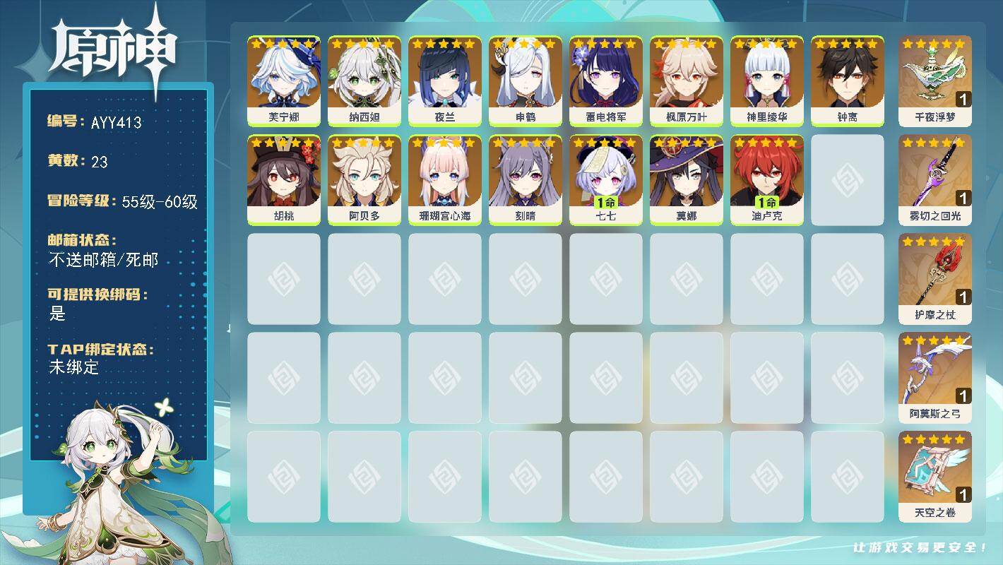 [16276791]【店主推荐捡漏号】58级/23黄/女主/15个五星角色/6个五星武器 0命芙宁娜,0命纳西妲,0命夜兰,0命申鹤,0命雷电将军,0命枫原万叶,0命神里绫华,0命钟离,0命胡桃,0命阿贝多,0命珊瑚宫心海,0命刻晴,1命七七,0命莫娜,1命迪卢克,精1千夜浮梦,精1雾切之回光,精1护摩之杖,精1阿莫斯之弓,精1天空之卷