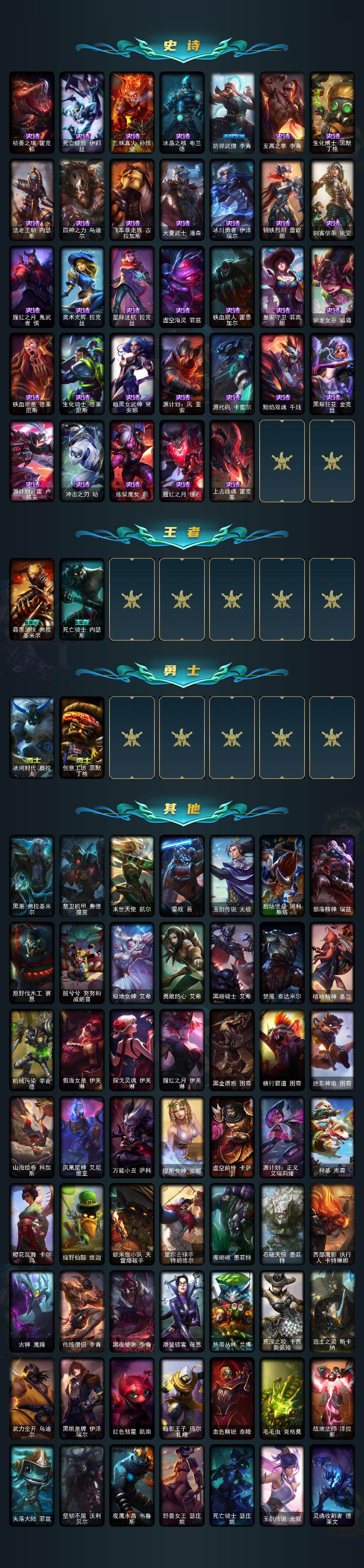 【史诗皮肤】:皇家火枪手崔斯特,铁钩船长费德提克,重生之沙费德提克,圣光审判凯尔,天人合一易,战场公主希维尔,兔宝宝提莫,火箭达人崔丝塔娜,黑帮狂花厄运小姐,国王泰达米尔,侏罗纪化石科加斯,小小骑士阿木木,殇之机器人阿木木,飞越疯人院萨科,海克斯科技迦娜,寒冰女皇迦娜,血石诅咒塔里克,穿着正装的恶魔维迦,霸天巨兽墨菲特,蓝焰梦魔魔腾,符文战神雷克顿,枯萎之壤雷克顿,死亡绽放伊莉丝,三昧真火孙悟空,冰晶之核布兰德,防弹武僧李青,至高之拳李青,生化博士黑默丁格,法老王朝内瑟斯,四神之力乌迪尔,飞车暴走族古拉加斯,大夏武士潘森,冰川勇者伊泽瑞尔,钢铁烈阳蕾欧娜,刺客信条锐雯,腥红之月鬼武者慎,奥术光辉拉克丝,星际迷航拉克丝,虚空海灵菲兹,铁血猎人雷恩加尔,皇家守卫菲奥娜,驯龙女巫璐璐,铁血帝皇德莱厄斯,生化骑士德莱厄斯,暗黑女武神黛安娜,源计划风亚索,源代码卡蜜尔,黯焰双魂千珏,黑帮狂花金克丝,源计划雷卢锡安,冲击之刃劫,炼狱魔女蔚,腥红之月锤石,上古战魂雷克塞