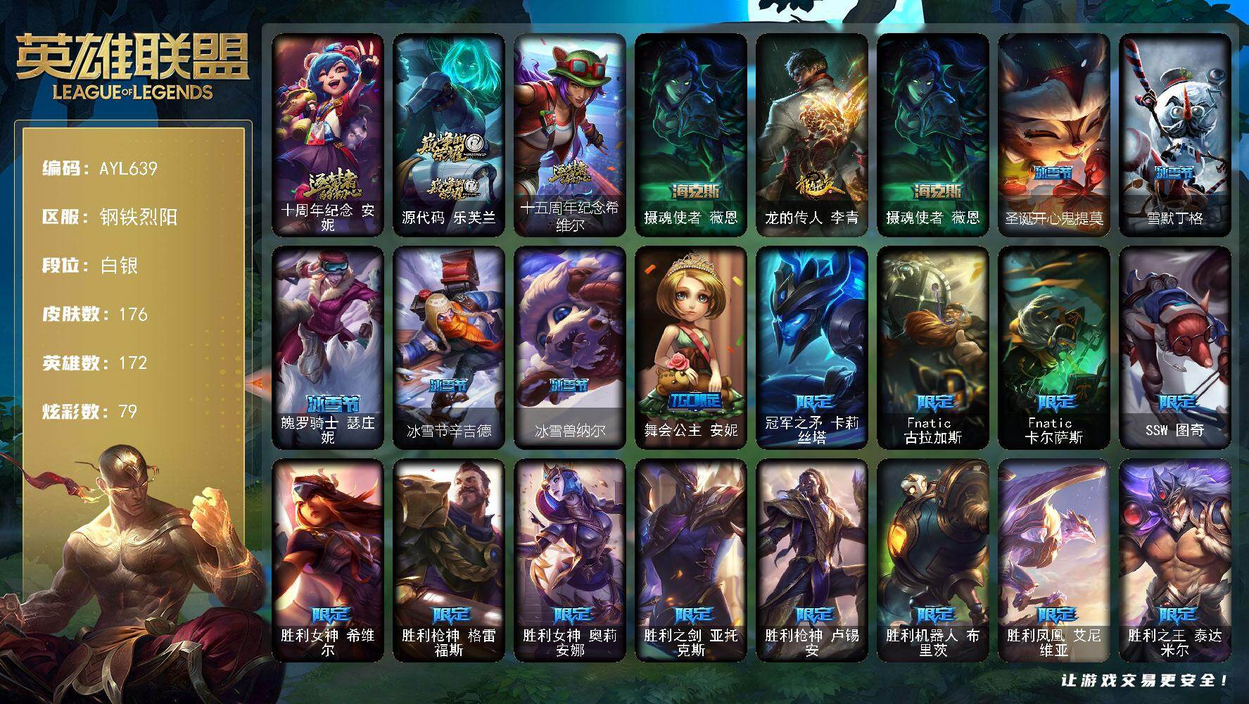 [16276829]【店主推荐捡漏号】白银段位-172英雄-176皮肤-79炫彩-0终极-4神话-24限定-22传说-54史诗 【神话皮肤】:十周年纪念安妮,源代码乐芙兰,十五周年纪念希维尔,摄魂使者薇恩 【臻彩皮肤】:神龙尊者圣龙李青龙腾云起,霸天巨兽雪崩墨菲特 【年限皮肤】:龙的传人李青 【海克斯皮肤】:摄魂使者薇恩 【冰雪限定】:圣诞开心鬼提莫,雪默丁格,魄罗骑士瑟庄妮,冰雪节辛吉德,冰雪兽纳尔 【限定皮肤】:舞会公主安妮,冠军之矛卡莉丝塔,Fnatic古拉加斯,Fnatic卡尔萨斯,SSW图奇,胜利女神希维尔,胜利枪神格雷福斯,胜利女神奥莉安娜,胜利之剑亚托克斯,胜利枪神卢锡安,胜利机器人布里茨,胜利凤凰艾尼维亚,胜利之王泰达米尔,灵魂收割者索拉卡,密林猎手提莫,暗影沃里克,都铎王朝图奇,防暴天使凯尔 【传说皮肤】:邪鸦魅影乐芙兰,战场女武神凯尔,源计划林易,恶魔男爵瑞兹,霸天零式赛恩,律政大亨蒙多,最终BOSS维迦,未来战士凯特琳,冰川巨兽墨菲特,上古战魂魔腾,神拳李青,神龙尊者圣龙李青,源计划净化薇恩,钢铁军团盖伦,枯萎之壤泽拉斯,苍穹之光韦鲁斯,宇航员诺提勒斯,神王德莱厄斯,黑夜使者亚索,西部魔影卢锡安,真实伤害艾克,暗星锤石 【史诗皮肤】:皇家火枪手崔斯特,铁钩船长费德提克,重生之沙费德提克,圣光审判凯尔,天人合一易,战场公主希维尔,兔宝宝提莫,火箭达人崔丝塔娜,黑帮狂花厄运小姐,国王泰达米尔,侏罗纪化石科加斯,小小骑士阿木木,殇之机器人阿木木,飞越疯人院萨科,海克斯科技迦娜,寒冰女皇迦娜,血石诅咒塔里克,穿着正装的恶魔维迦,霸天巨兽墨菲特,蓝焰梦魔魔腾,符文战神雷克顿,枯萎之壤雷克顿,死亡绽放伊莉丝,三昧真火孙悟空,冰晶之核布兰德,防弹武僧李青,至高之拳李青,生化博士黑默丁格,法老王朝内瑟斯,四神之力乌迪尔,飞车暴走族古拉加斯,大夏武士潘森,冰川勇者伊泽瑞尔,钢铁烈阳蕾欧娜,刺客信条锐雯,腥红之月鬼武者慎,奥术光辉拉克丝,星际迷航拉克丝,虚空海灵菲兹,铁血猎人雷恩加尔,皇家守卫菲奥娜,驯龙女巫璐璐,铁血帝皇德莱厄斯,生化骑士德莱厄斯,暗黑女武神黛安娜,源计划风亚索,源代码卡蜜尔,黯焰双魂千珏,黑帮狂花金克丝,源计划雷卢锡安,冲击之刃劫,炼狱魔女蔚,腥红之月锤石,上古战魂雷克塞 【王者皮肤】:霹雳游侠弗拉基米尔,死亡骑士内瑟斯 【勇士皮肤】:冰河时代奥拉夫,创意工坊黑