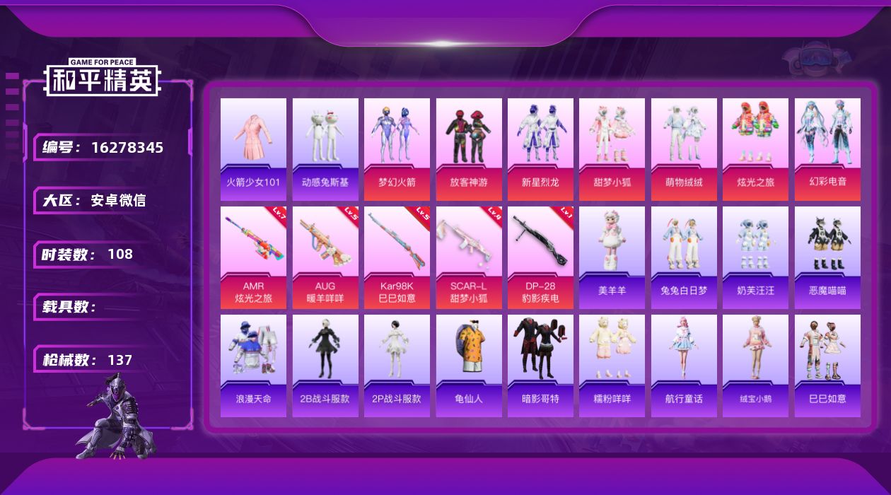 [16278345]极品老v1小号!【特价出售/店主推荐】安卓 微信-7粉装-5特效枪-0载具-3粉色飞行器-42536热力值-13王牌印记-108套装-137枪皮【热门品类】:粉装-梦幻火箭,套装-浪漫天命,套装-火箭少女101,套装-动感兔斯基人偶服,角色-2B战斗服款,角色-2P战斗服款,套装-龟仙人,套装-暗影哥特,套装-糯粉咩咩【粉色套装】:粉装-梦幻火箭,粉装-放客神游,粉装-新星烈龙,粉装-甜梦小狐,粉装-萌物绒绒,粉装-炫光之旅,粉装-幻彩电音【粉色枪皮等级】:SCAR-L-甜梦小狐(四级),AUG-暖羊咩咩(五级),Kar98K-巳巳如意(五级),AMR-炫光之旅(七级),DP-28-豹影疾电(一级)【粉色枪皮】:SCAR-L-甜梦小狐,AUG-暖羊咩咩,Kar98K-巳巳如意,AMR-炫光之旅,DP-28-豹影疾电【粉色飞行器】:甜梦小狐飞行器,萌物绒绒飞行器