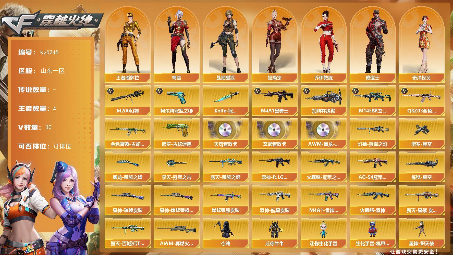 [16281481]山东一区-28V-4王者武器数-0炫金武器数 【热门武器】:QBZ03-金色蔷薇,M14EBR-玄武,M200-幻神,金色蔷薇-古蛇迷踪,修罗-古蛇迷踪,柯尔特-冠军之特,M4A1-黑骑士*2,加特林-炼狱,Knife-冠军之刃 【音效卡】:QBZ03-天罚音效卡,M14EBR-玄武音效卡,AWM-昌龙-怀旧音效卡 【皮肤】:幻神-冠军之幻,QBZ03-巅峰荣耀皮肤,星神-璀璨皮肤,星神-巅峰荣耀 皮肤,雷神-R.LGD-CFPLS18冠军,雷神-航星皮肤,M4A1-雷神-巅峰荣耀皮肤,火麒麟-雷神,火麒麟-冠军之心,毁灭-荣耀之怒,毁灭-星耀 皮肤,毁灭-百城浙江 皮肤,黑骑士-AG-S4冠军典藏,AWM-再燃火线,炼狱-星空,修罗-星空,屠龙-荣耀之锋,擎天-冠军之击 【角色】:战地猎狐,王者潘多拉,蛇隐宗,奇洋探员,乔伊教练,修道士,暗夜-X,北极狐-X,初恋灵狐,电竞少女,风暴女,虎妞,嘉年华灵狐,灵狐者-X,麻雀,潘多拉-X,潘多拉-甜心教官,蛇姬,蜀雪,维纳斯,新娜塔莎,夜玫瑰-宠粉 【人偶武器】:星神-炽天使,夺魂,迷你牛牛,迷你生化手雷,生化手雷-机甲核心*2 【暴走生化】:超级对讲机 【挑战大师】:激光毁灭者III-白马银枪 【英雄级武器】:AK47-火麒麟,M4A1-雷神,M4A1-黑骑士*2,AK12-天启,AN94-超新星,M14EBR-玄武,QBZ03-天罚,黑武士-锦绣游龙,超新星-热带奇洋,金色蔷薇-古蛇迷踪,QBZ03-金色蔷薇,王者白虎-觉醒版,王者猎神-觉醒版,Barrett-毁灭,M200-幻神,加特林-炼狱,柯尔特-冠军之特,修罗-古蛇迷踪,屠龙,擎天,龙啸-热带奇洋,高爆手雷-幻灵,手雷-热带奇洋,高爆手雷-古蛇迷踪,闪光弹-幻灵,闪光弹-雷霆王者-觉醒版,烟雾弹-幻灵*2,烟雾弹-古蛇迷踪,烟雾弹-雷霆王者-觉醒版,M4A1-赤狱骑士,AWM-昌龙 【道具】:EP战队炫彩背包,古蛇迷踪炫彩背包,奇洋探员-海龟背包,女皇终结者-背包,炫彩背包-诺拉,热带奇洋炫彩背包,虎牙炫彩背包,超级背包,哔哩哔哩名片,终极猎手-秦魂将军,虚空终结者-暗域熔岩,女皇终结者-魔龙之吻,救世主-黑桃战神,黄金生化钩,绿色巨人,灵魂忍者,迷雾幽灵,生化弹匣,夺命之镰,防化服*3,金色流光-枪王排位,星辰流光-枪王排位,流光-鎏金之域,流光-再燃