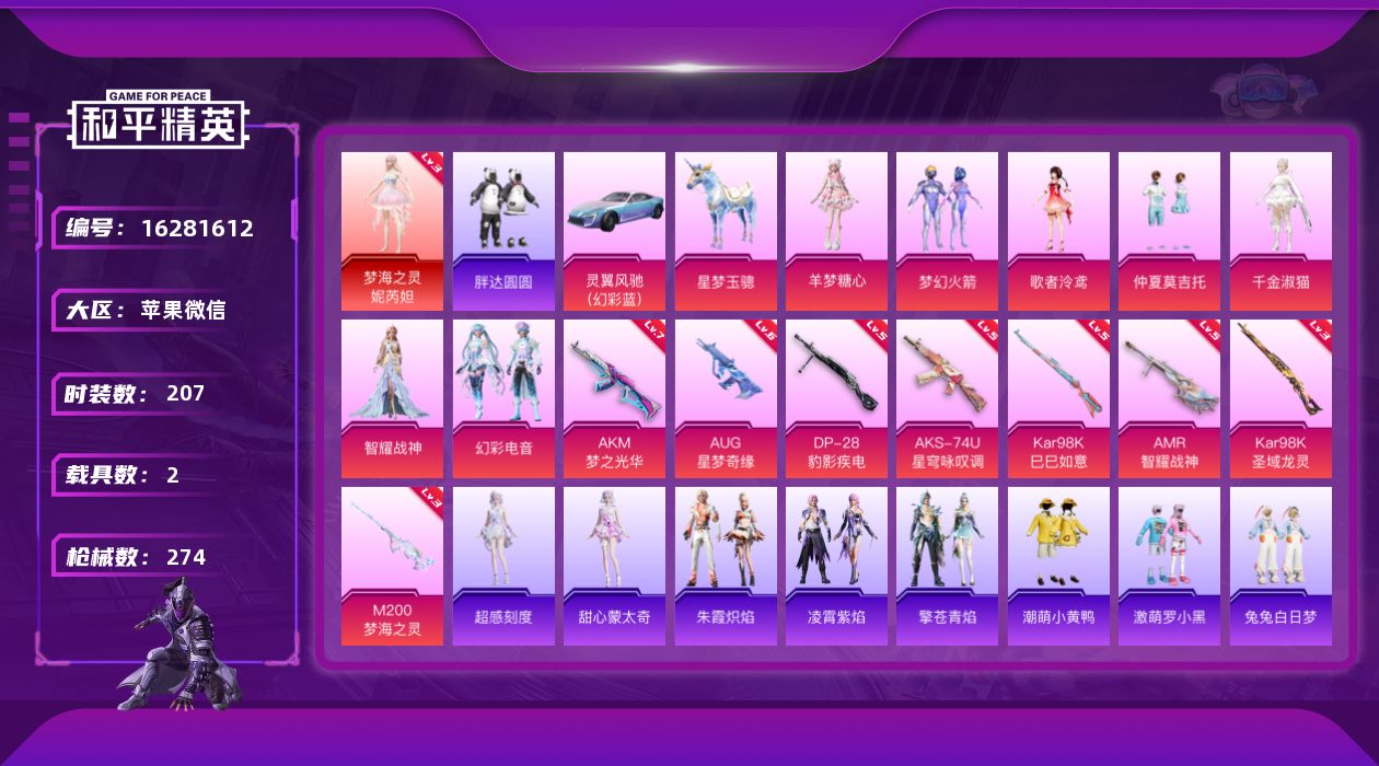 - PX_2095700- 苹果手Q-13王牌印记-12粉装-11特效枪-3载具-120521热力值-258套装-350枪皮-5卓越印记-3传奇印记 【12粉装】,梦幻火箭,2号机款机体服,宝贝奶油派,天使彩虹糖,新星烈龙,洛天依,星穹咏叹调,金曜白虎,筑梦精灵,PEL轰鸣竞梦者,彩虹鹿灵,未来战士 【11特效枪】AKM-甜心宝贝-7级 SCAR-L-机甲封神-1级 SCAR-L-梦幻火箭-7级 M4