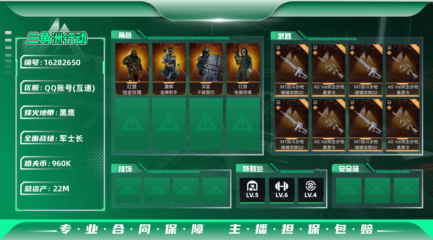 [16282650]【店主推荐捡漏号!可直接换绑】22m总资产-960k哈伏币-60烽火等级-黑鹰-38战场等级-军士长 【干员外观】:红狼-蚀金玫瑰,深蓝-不破誓约,红狼-电锯惊魂,露娜-金牌射手 【近战皮肤】:近战-信条,近战-黑鹰 【典藏外观】:M7战斗步枪-棱镜攻势S2,AS Val突击步枪-悬赏令 【传说外观】:M4A1突击步枪-蚀金玫瑰,M4A1突击步枪-阿米娅,SG552突击步枪-运动员,SCAR-H战斗步枪-启航,KC17突击步枪-电锯惊魂,P90冲锋枪-信条,M250通用机枪-骑士之心,SR-25射手步枪-信条,R93狙击步枪-维什戴尔 【史诗外观】:QBZ95-1突击步枪-曙光,ASh-12战斗步枪-无极限,M7战斗步枪-百步穿杨,SG552突击步枪-深海恐惧,G3战斗步枪-流沙送葬,AS Val突击步枪-百步穿杨,K437突击步枪-守护者,MP5冲锋枪-深海恐惧,MP5冲锋枪-战术竞备,MP5冲锋枪-竞技风,Vector冲锋枪-百步穿杨,勇士冲锋枪-工业狂潮,MP7冲锋枪-守护者,Mini-14射手步枪-守护者,SV-98狙击步枪-囚徒,M700狙击步枪-百步穿杨,AWM狙击步枪-无极限,AWM狙击步枪-流沙送葬,复合弓-守护者 【稀有外观】:M4A1突击步枪-繁盛,AKM突击步枪-战术演练,AKM突击步枪-肃杀,QBZ95-1突击步枪-公平竞技,ASh-12战斗步枪-繁盛,M7战斗步枪-精英联盟,M7战斗步枪-捣蛋鬼,SCAR-H战斗步枪-黄昏,G3战斗步枪-战术演练,G3战斗步枪-主宰,腾龙突击步枪-冰天雪地,MP5冲锋枪-弄臣,MP5冲锋枪-哈夫克卫队,P90冲锋枪-黄昏,P90冲锋枪-捣蛋鬼,UZI冲锋枪-亚特兰蒂斯,SMG-45-行动开启,勇士冲锋枪-主宰,勇士冲锋枪-冰天雪地,M1014霰弹枪-幻影结构,S12K霰弹枪-战术演练,QJB201轻机枪-黄昏,QJB201轻机枪-哈夫克卫队,Mini-14射手步枪-荣耀列队,SR9射手步枪-肃杀,PSG-1射手步枪-主宰,AWM狙击步枪-精英联盟 【普通外观】:M4A1突击步枪-粉色涂装,M4A1突击步枪-高雅黑,M4A1突击步枪-海色,QBZ95-1突击步枪-高雅黑,QBZ95-1突击步枪-海色,QBZ191突击步枪-三角洲力量,K416突击步枪-几何迷彩,K416突击步枪-高雅黑,M16A4突击步枪-