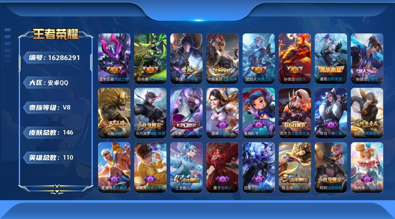 [16286291]安卓Q-V8-荣耀黄金IV段位-110英雄-146皮肤-1典藏英雄-7传说-24史诗