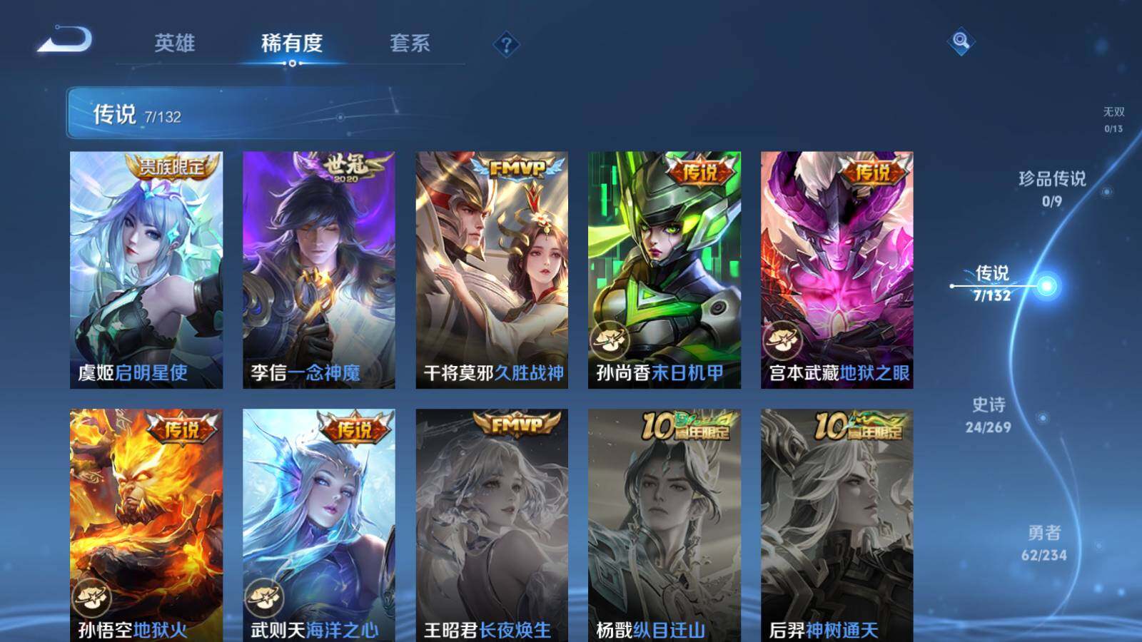 【传说皮肤】:虞姬启明星使,李信一念神魔,干将莫邪久胜战神,孙尚香末日机甲,宫本武藏地狱之眼,孙悟空地狱火,武则天海洋之心
