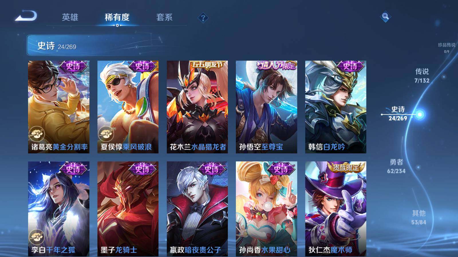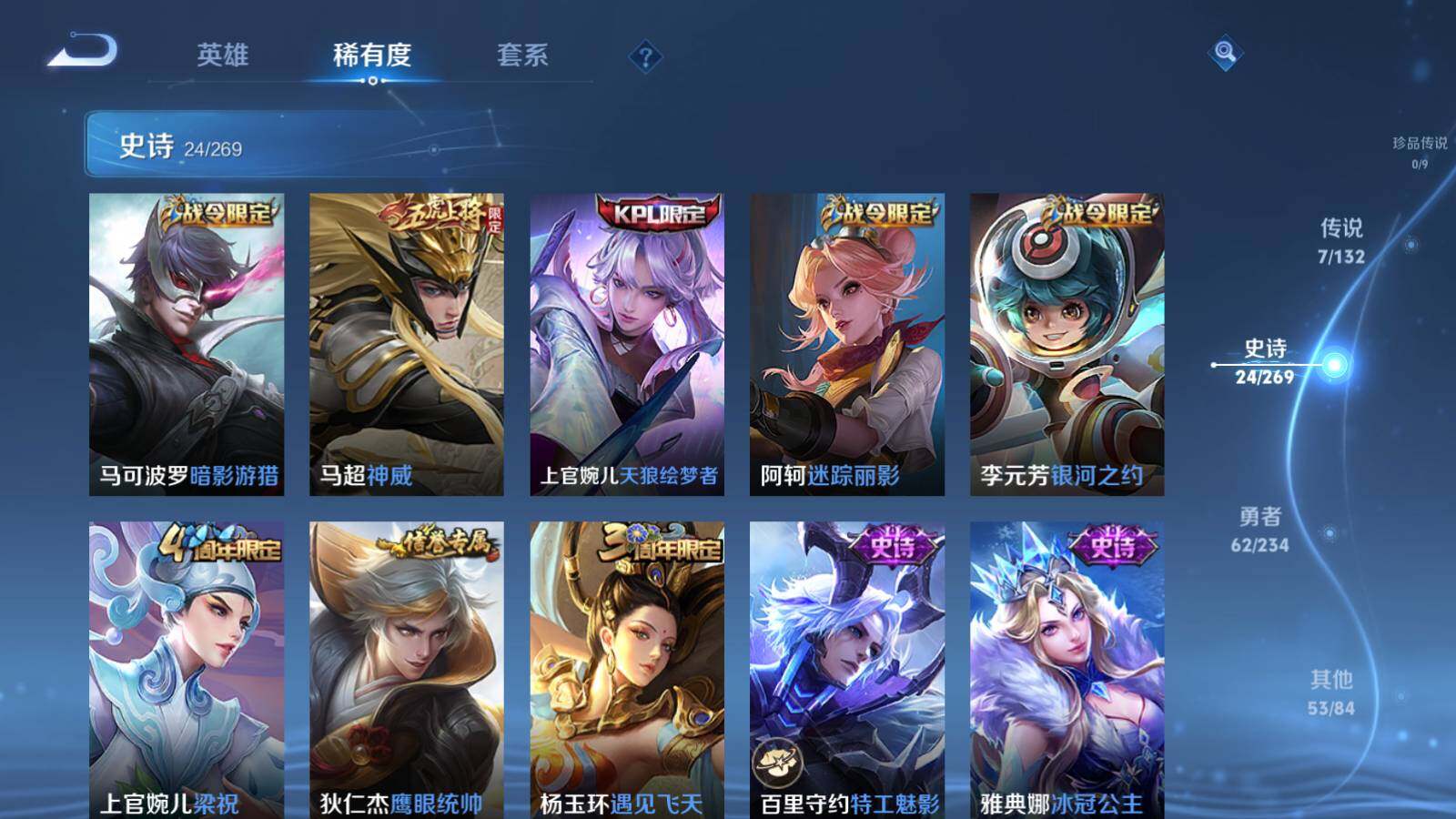 【史诗皮肤】:鲁班七号电玩小子,露娜紫霞仙子,赵云皇家上将,貂蝉圣诞恋歌,狄仁杰魔术师,孙尚香水果甜心,嬴政暗夜贵公子,墨子龙骑士,李白千年之狐,韩信白龙吟,孙悟空至尊宝,花木兰水晶猎龙者,夏侯惇乘风破浪,诸葛亮黄金分割率,雅典娜冰冠公主,百里守约特工魅影,杨玉环遇见飞天,狄仁杰鹰眼统帅,上官婉儿梁祝,李元芳银河之约,阿轲迷踪丽影,马超神威,上官婉儿天狼绘梦者,马可波罗暗影游猎