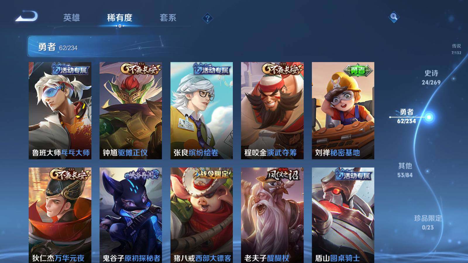 【限定皮肤】:白起狰,狄仁杰阴阳师,赵云皇家上将,高渐离死亡摇滚,阿轲迷踪丽影,芈月重明,夏侯惇朔风刀,曹操烛龙,典韦穷奇,马可波罗暗影游猎,狄仁杰魔术师,狄仁杰万华元夜,项羽海滩派对,老夫子醍醐杖,程咬金演武夺筹,刘邦夺宝奇兵,孙悟空至尊宝,牛魔御旌,李元芳银河之约,虞姬启明星使,钟馗驱傩正仪,杨玉环遇见飞天,太乙真人饕餮,鬼谷子原初探秘者,弈星混沌棋,沈梦溪星空之诺,明世隐疑决卦,狂铁御狮,米莱狄御霄,盾山御銮,猪八戒西部大镖客,上官婉儿梁祝,上官婉儿天狼绘梦者
