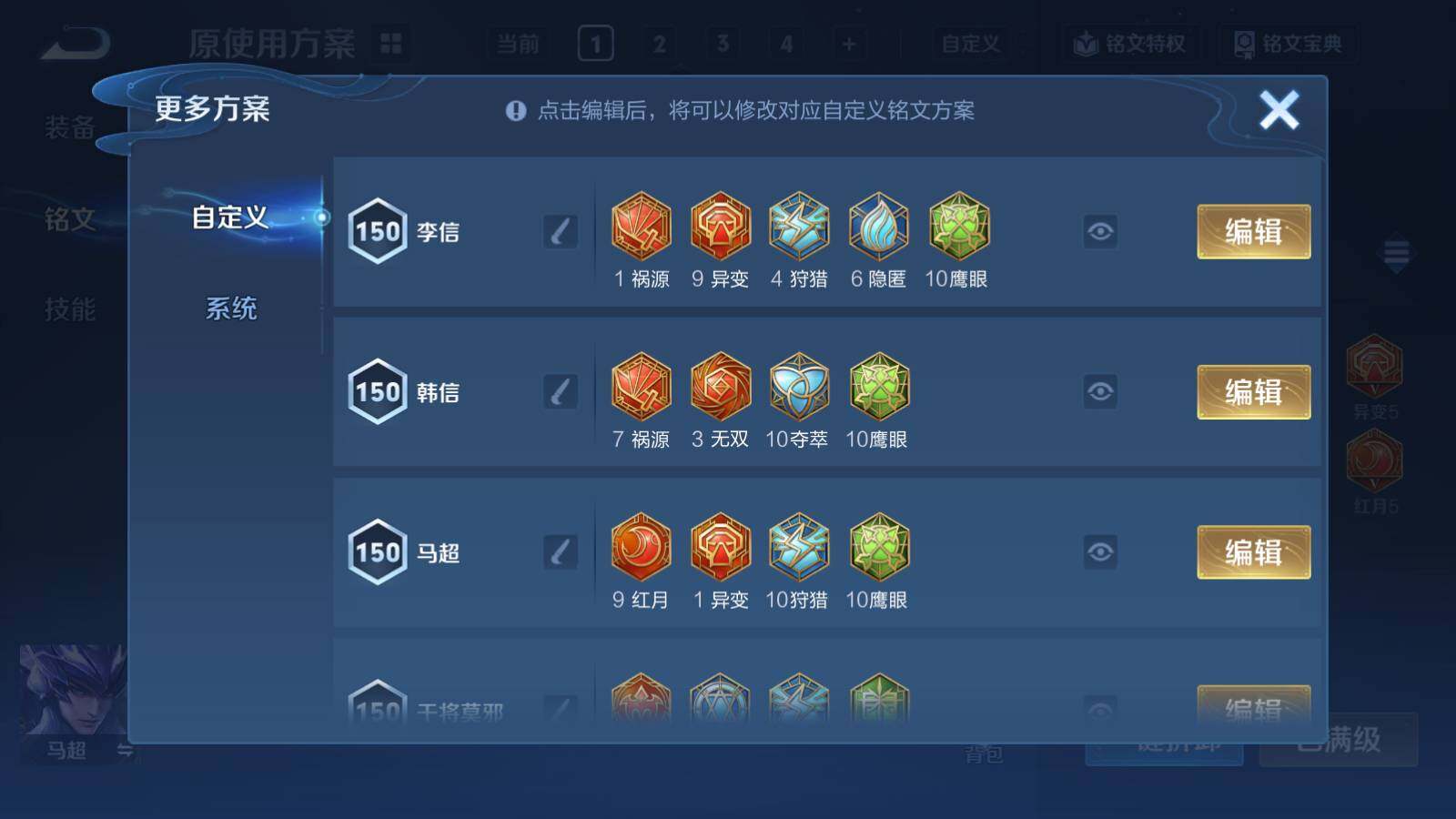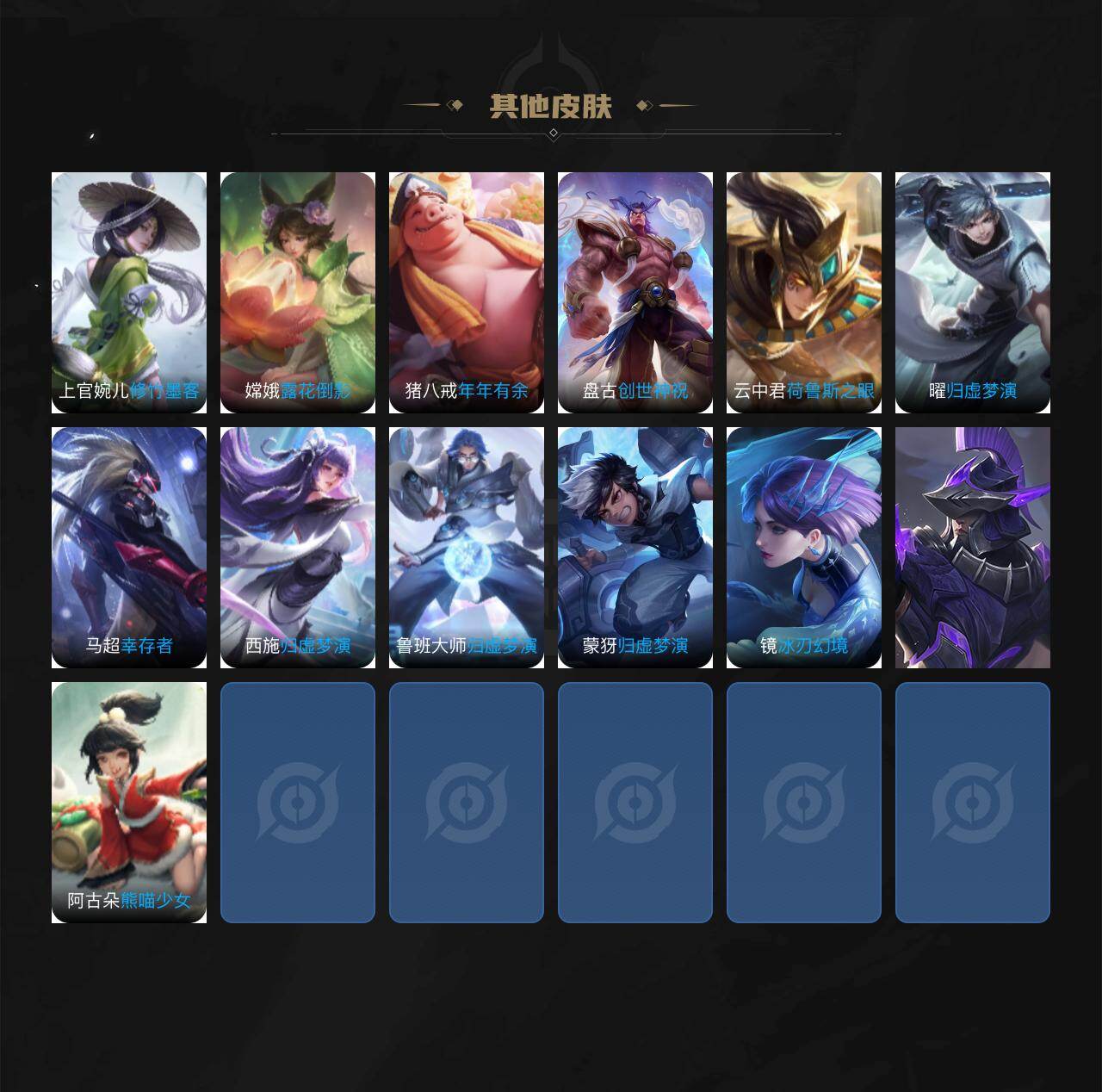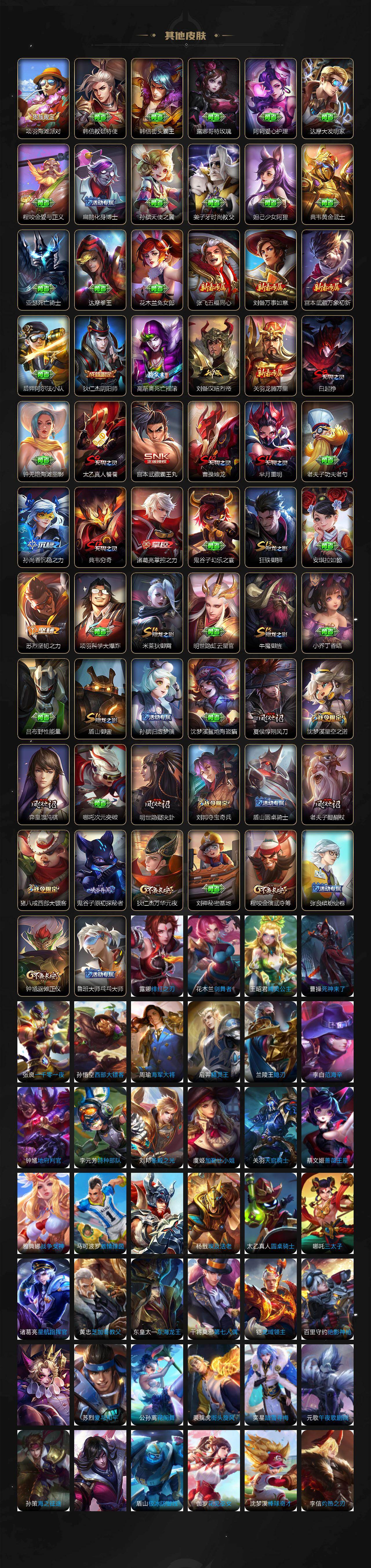 【其他皮肤】:项羽海滩派对,韩信教廷特使,韩信街头霸王,露娜哥特玫瑰,阿轲爱心护理,达摩大发明家,程咬金爱与正义,扁鹊化身博士,孙膑天使之翼,姜子牙时尚教父,妲己少女阿狸,典韦黄金武士,亚瑟死亡骑士,达摩拳王,花木兰兔女郎,张飞五福同心,刘备万事如意,宫本武藏万象初新,后羿阿尔法小队,狄仁杰阴阳师,高渐离死亡摇滚,刘备汉昭烈帝,关羽龙腾万里,白起狰,钟无艳海滩丽影,太乙真人饕餮,宫本武藏霸王丸,曹操烛龙,芈月重明,老夫子功夫老勺,孙尚香沉稳之力,典韦穷奇,诸葛亮掌控之力,鬼谷子幻乐之宴,狂铁御狮,安琪拉如懿,苏烈坚韧之力,项羽科学大爆炸,米莱狄御霄,明世隐虹云星官,