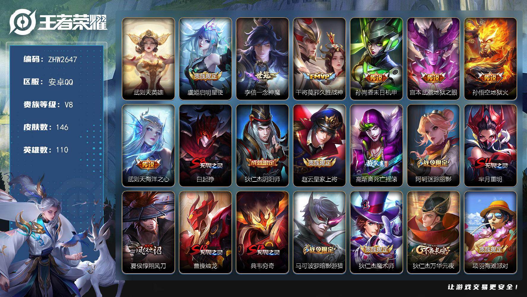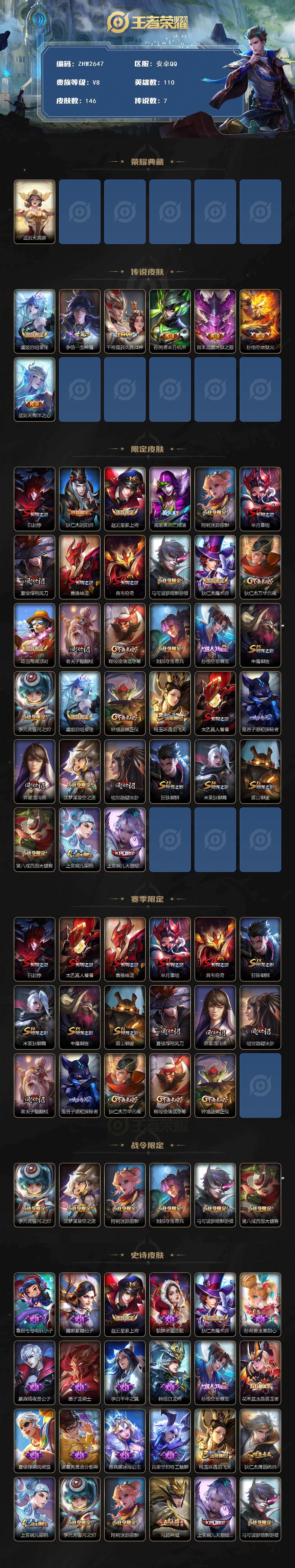 [16286291]安卓Q-V8-荣耀黄金IV段位-110英雄-146皮肤-1典藏英雄-7传说-24史诗 【荣耀典藏】:武则天英雄 【传说皮肤】:虞姬启明星使,李信一念神魔,干将莫邪久胜战神,孙尚香末日机甲,宫本武藏地狱之眼,孙悟空地狱火,武则天海洋之心 【限定皮肤】:白起狰,狄仁杰阴阳师,赵云皇家上将,高渐离死亡摇滚,阿轲迷踪丽影,芈月重明,夏侯惇朔风刀,曹操烛龙,典韦穷奇,马可波罗暗影游猎,狄仁杰魔术师,狄仁杰万华元夜,项羽海滩派对,老夫子醍醐杖,程咬金演武夺筹,刘邦夺宝奇兵,孙悟空至尊宝,牛魔御旌,李元芳银河之约,虞姬启明星使,钟馗驱傩正仪,杨玉环遇见飞天,太乙真人饕餮,鬼谷子原初探秘者,弈星混沌棋,沈梦溪星空之诺,明世隐疑决卦,狂铁御狮,米莱狄御霄,盾山御銮,猪八戒西部大镖客,上官婉儿梁祝,上官婉儿天狼绘梦者 【赛季限定】:白起狰,太乙真人饕餮,曹操烛龙,芈月重明,典韦穷奇,狂铁御狮,米莱狄御霄,牛魔御旌,盾山御銮,夏侯惇朔风刀,弈星混沌棋,明世隐疑决卦,老夫子醍醐杖,鬼谷子原初探秘者,狄仁杰万华元夜,程咬金演武夺筹,钟馗驱傩正仪 【战令限定】:李元芳银河之约,沈梦溪星空之诺,阿轲迷踪丽影,刘邦夺宝奇兵,马可波罗暗影游猎,猪八戒西部大镖客 【史诗皮肤】:鲁班七号电玩小子,露娜紫霞仙子,赵云皇家上将,貂蝉圣诞恋歌,狄仁杰魔术师,孙尚香水果甜心,嬴政暗夜贵公子,墨子龙骑士,李白千年之狐,韩信白龙吟,孙悟空至尊宝,花木兰水晶猎龙者,夏侯惇乘风破浪,诸葛亮黄金分割率,雅典娜冰冠公主,百里守约特工魅影,杨玉环遇见飞天,狄仁杰鹰眼统帅,上官婉儿梁祝,李元芳银河之约,阿轲迷踪丽影,马超神威,上官婉儿天狼绘梦者,马可波罗暗影游猎 【其他皮肤】:项羽海滩派对,韩信教廷特使,韩信街头霸王,露娜哥特玫瑰,阿轲爱心护理,达摩大发明家,程咬金爱与正义,扁鹊化身博士,孙膑天使之翼,姜子牙时尚教父,妲己少女阿狸,典韦黄金武士,亚瑟死亡骑士,达摩拳王,花木兰兔女郎,张飞五福同心,刘备万事如意,宫本武藏万象初新,后羿阿尔法小队,狄仁杰阴阳师,高渐离死亡摇滚,刘备汉昭烈帝,关羽龙腾万里,白起狰,钟无艳海滩丽影,太乙真人饕餮,宫本武藏霸王丸,曹操烛龙,芈月重明,老夫子功夫老勺,孙尚香沉稳之力,典韦穷奇,诸葛亮掌控之力,鬼谷子幻乐之宴,狂铁御狮,安琪拉如懿,苏烈坚韧之力,项羽科学大爆炸,米莱狄御霄,明世隐虹云星官,