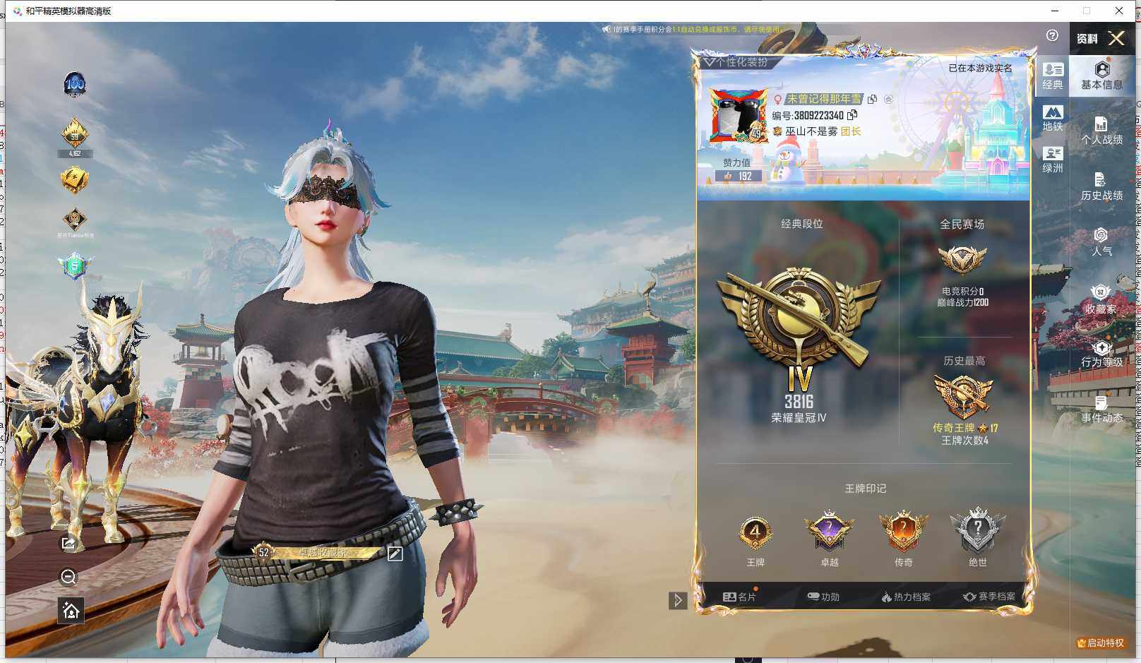 - PX_1932951-实名: 可修改 贵族等级: V7 英雄数: 116 皮肤数: 99 荣耀水晶: 鸣剑·曳影 传说皮: 黄金射手座,地狱之眼 限定皮: 游园惊梦,梁祝,至尊宝,匿光追影者,傲雪梅枪,百木心枪,玉兔公主,枫霜尽,五谷丰年,诗剑行